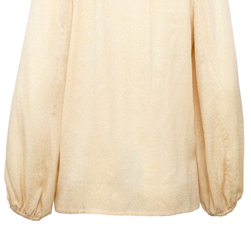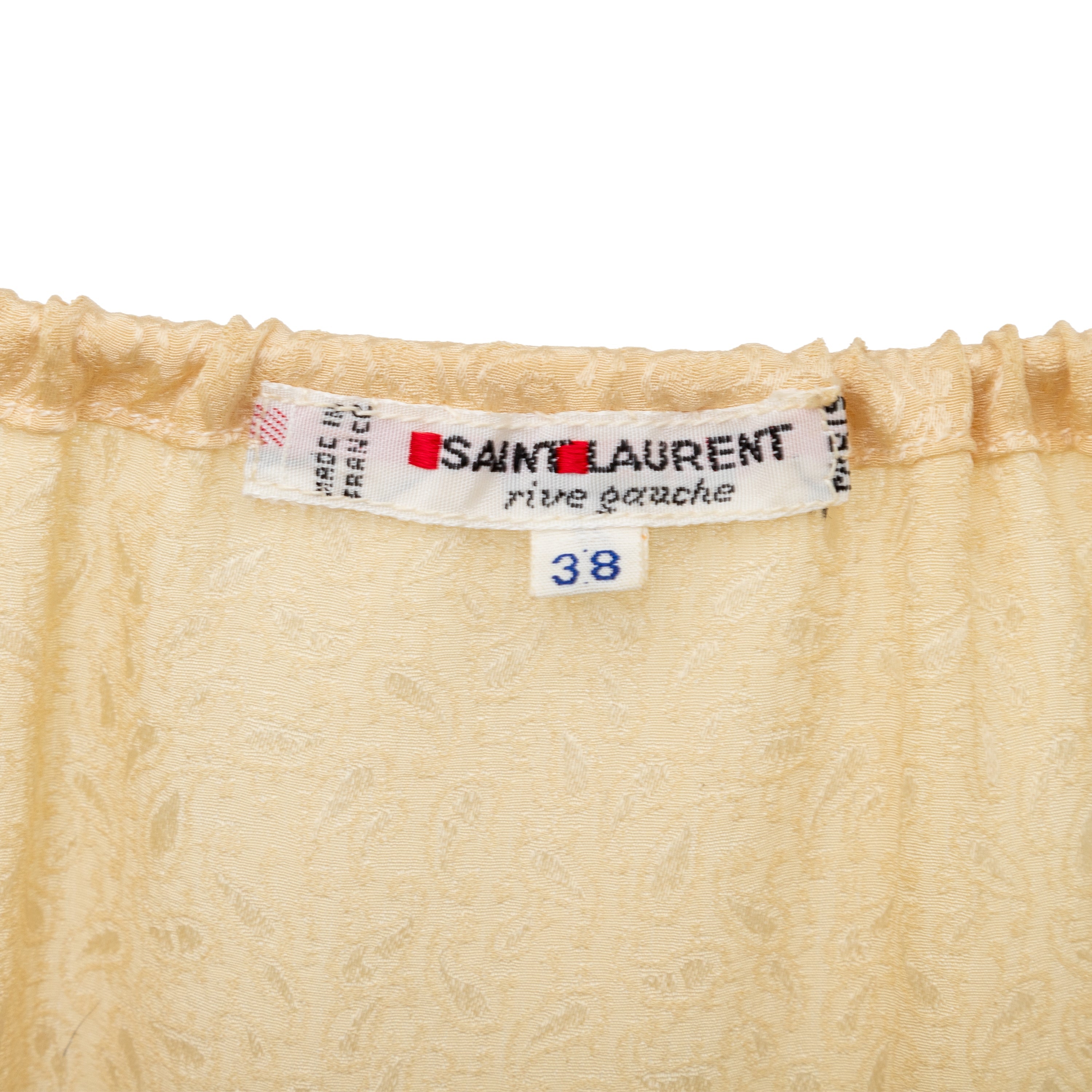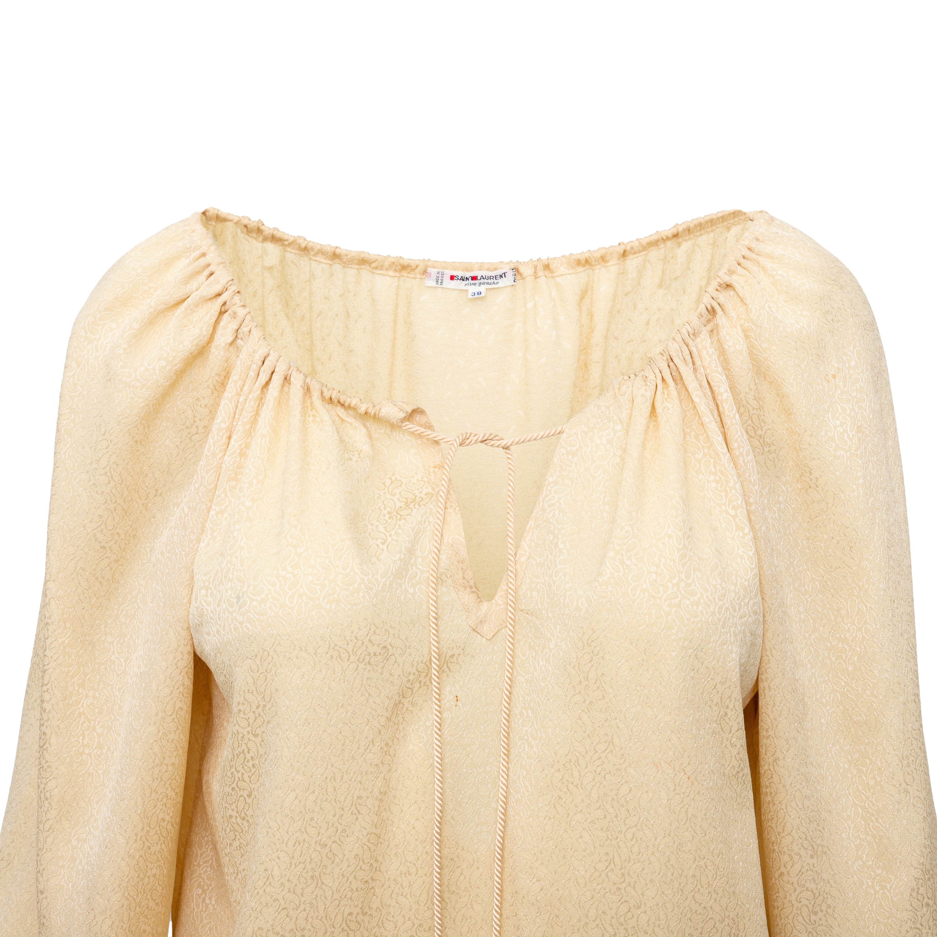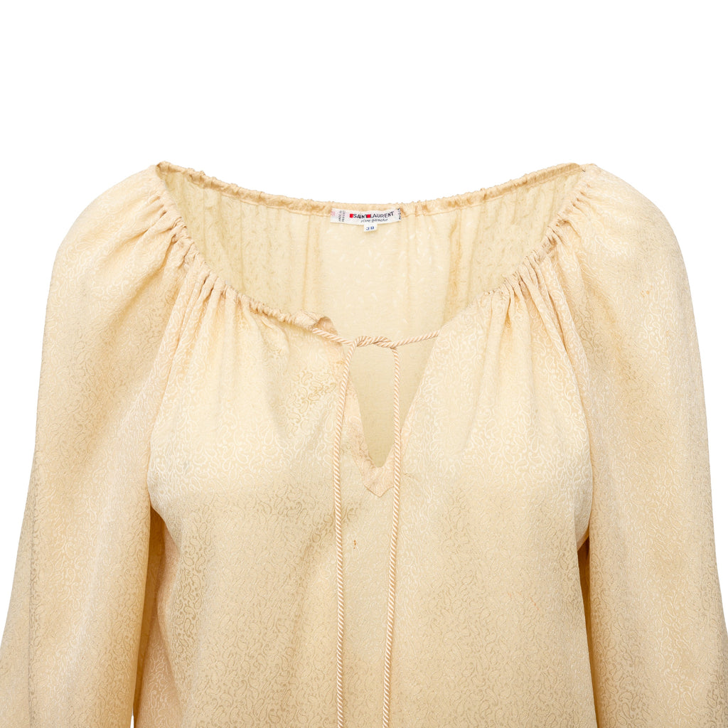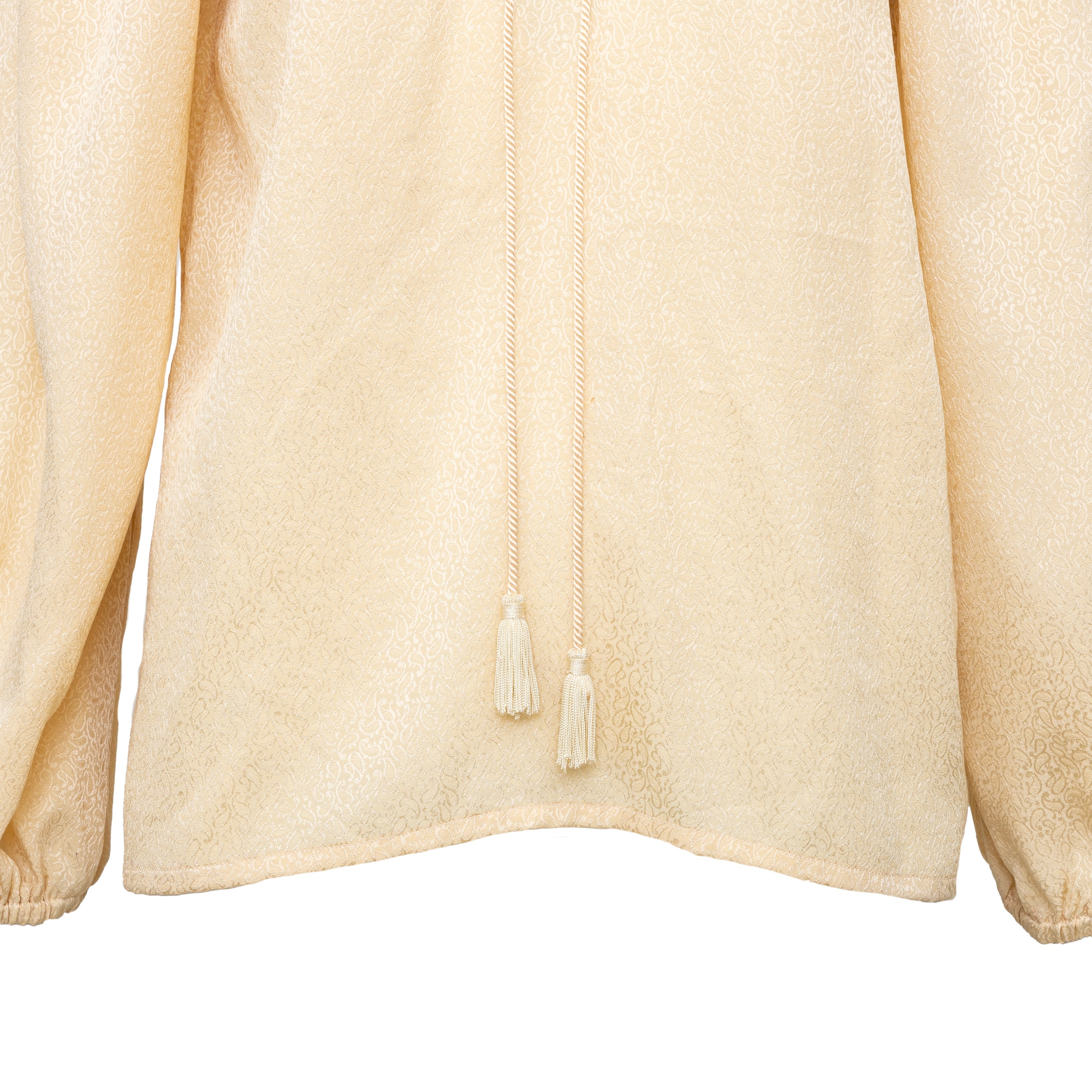 Made from high-quality silk, this Saint Laurent Rive Gauche top features a beautiful beige color with small paisley patterns. The tasselled ribbon tie on the neckline allows for adjustable styling, and the long elastic hemmed sleeves add a touch of sophistication.