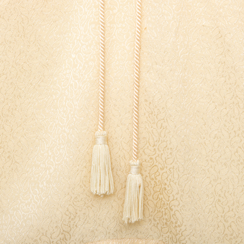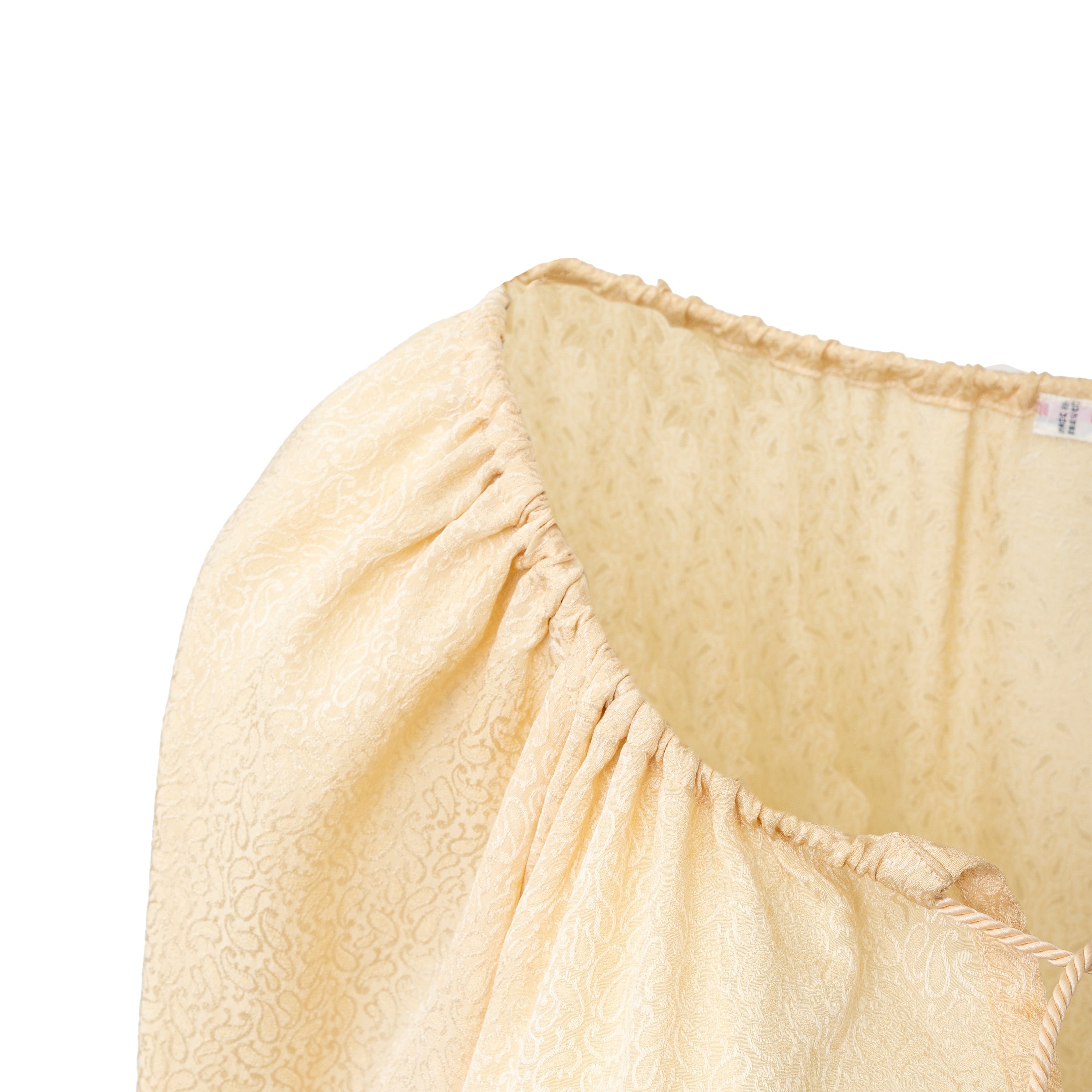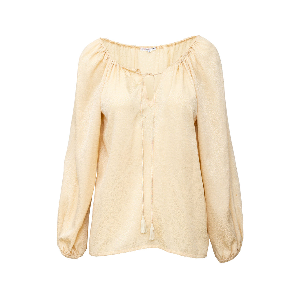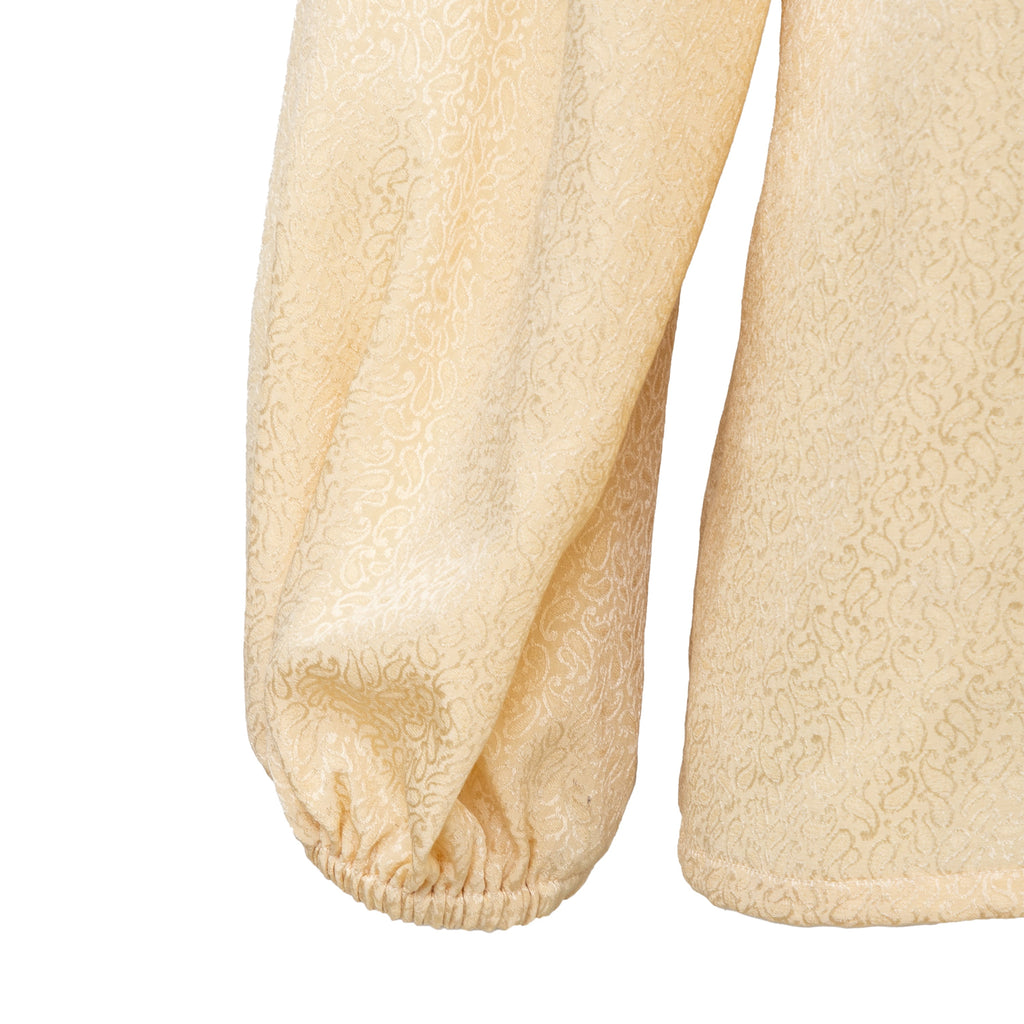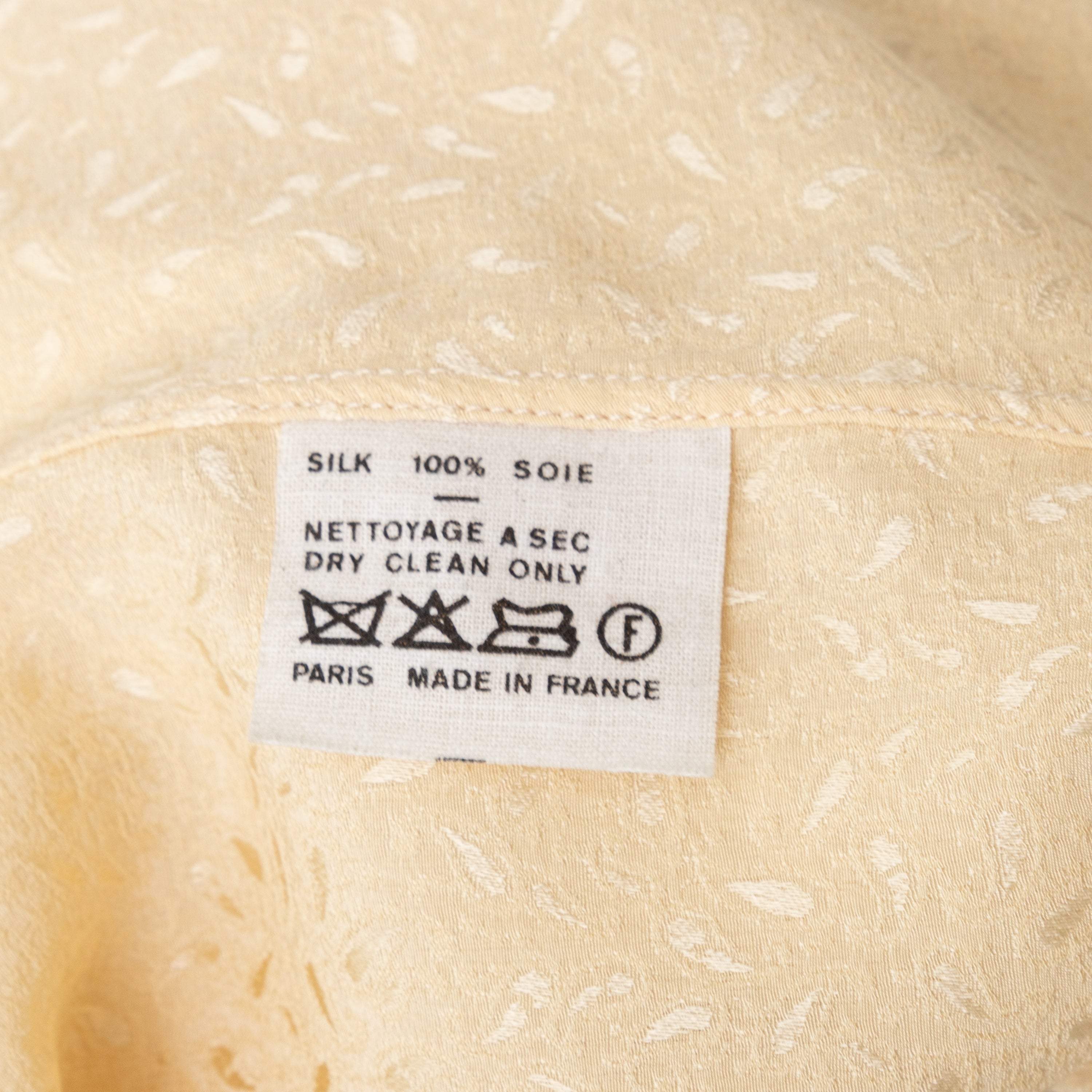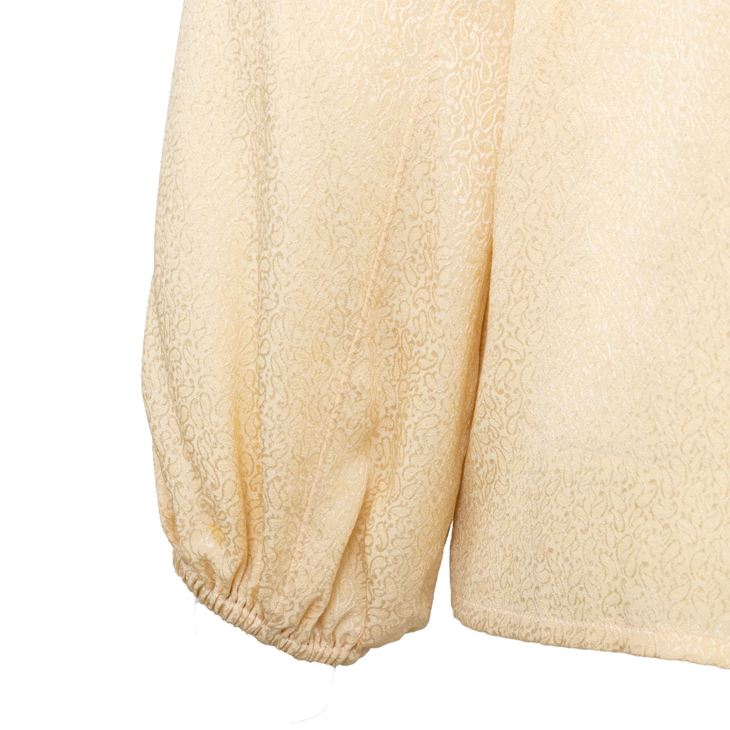 Made from high-quality silk, this Saint Laurent Rive Gauche top features a beautiful beige color with small paisley patterns. The tasselled ribbon tie on the neckline allows for adjustable styling, and the long elastic hemmed sleeves add a touch of sophistication.