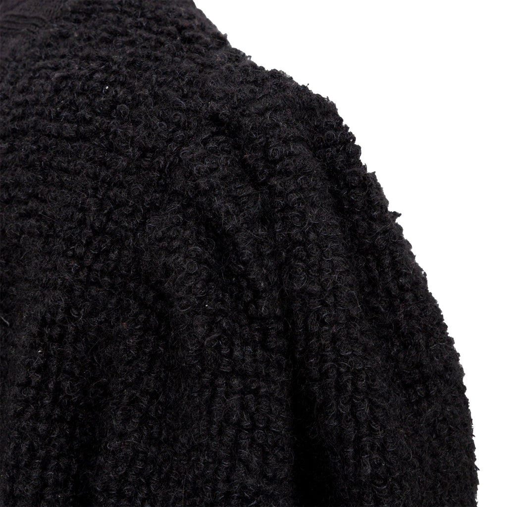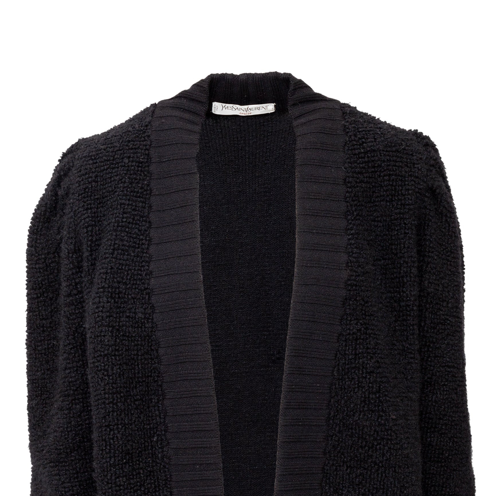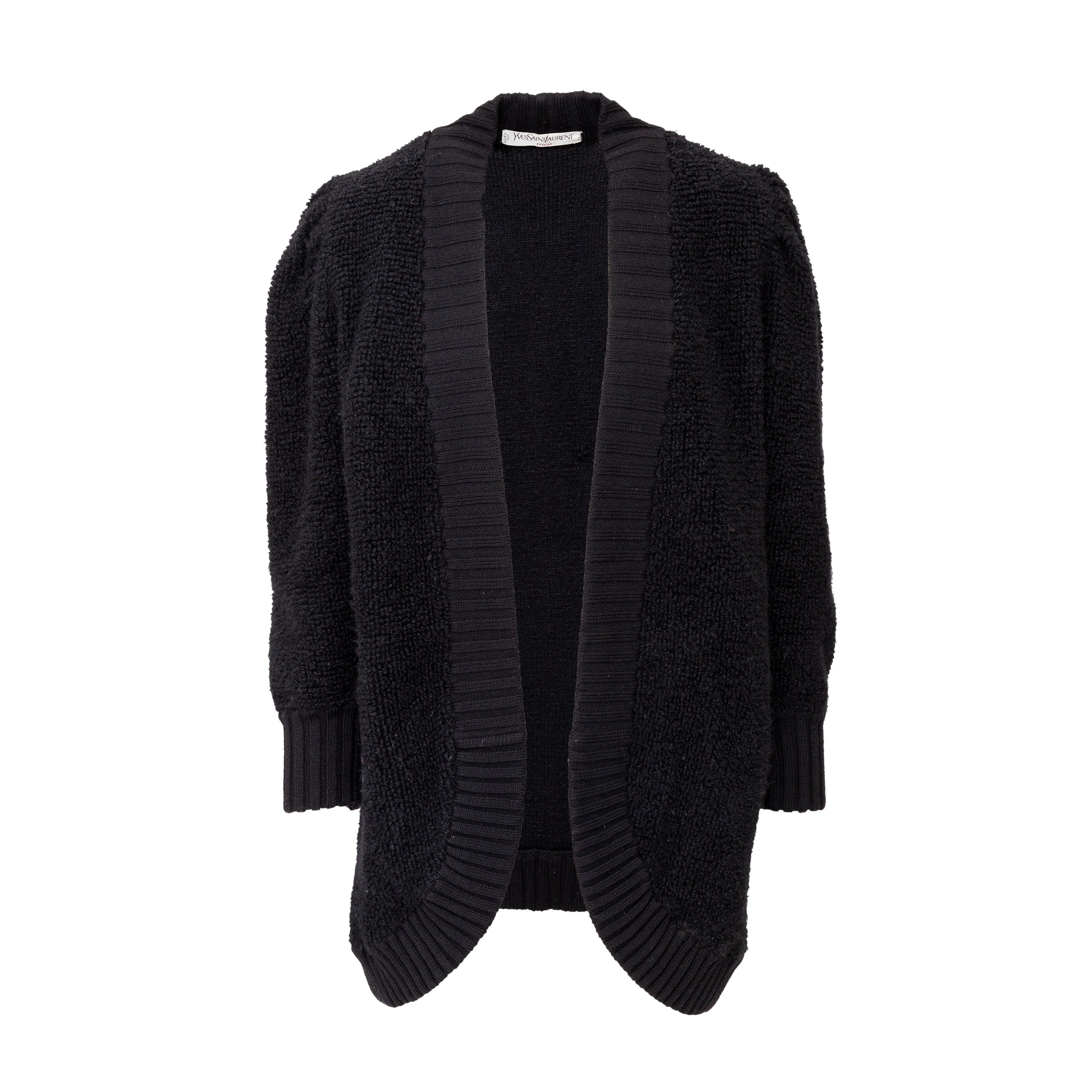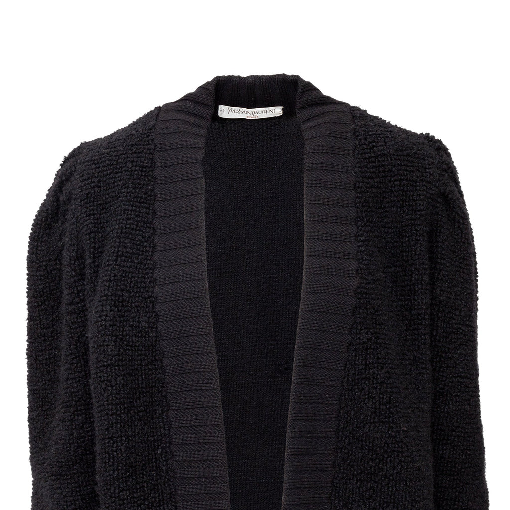 This Yves Saint Laurent cardigan from the tricot label offers a long silhouette and cozy, warm fit in terry knitted wool. The black, open front design is accented with ribbed hem and front borders. Puffed sleeves add a touch of playfulness.