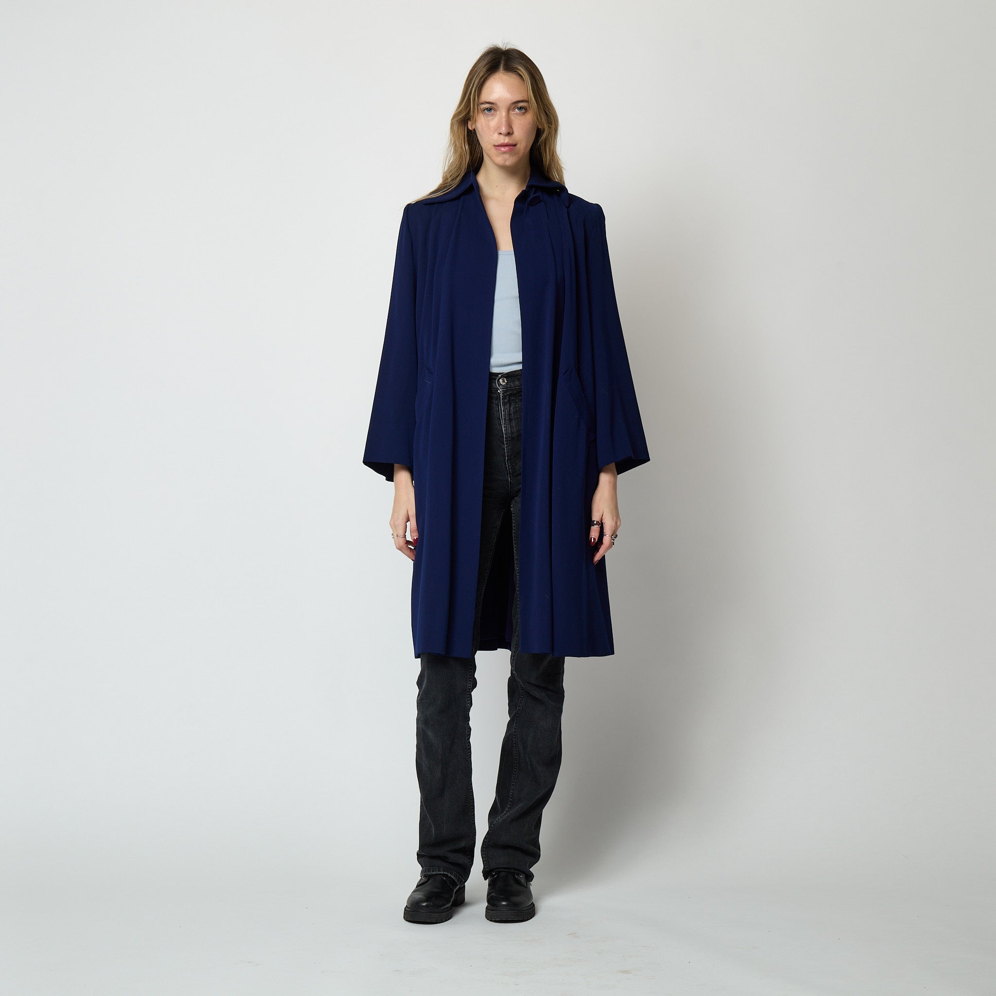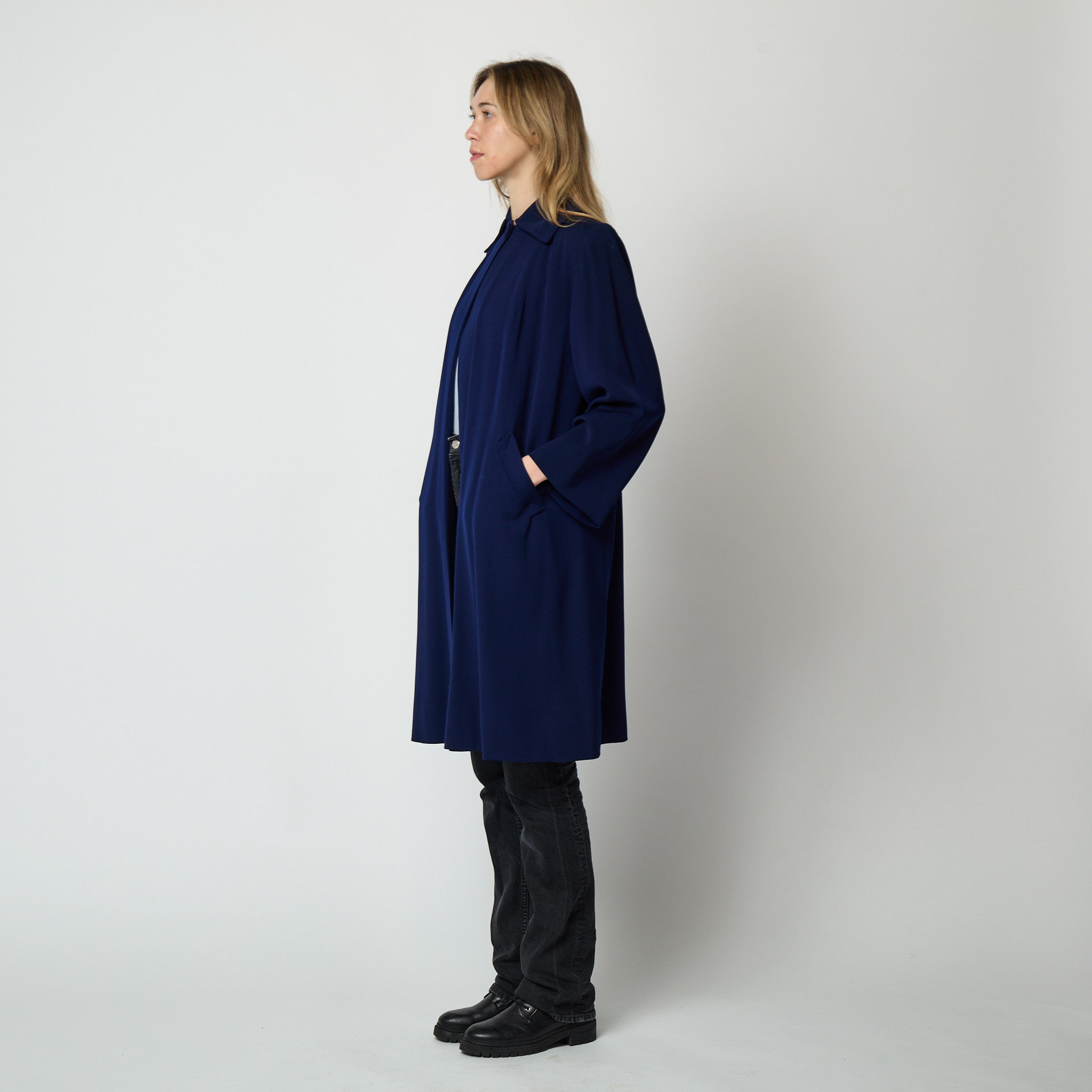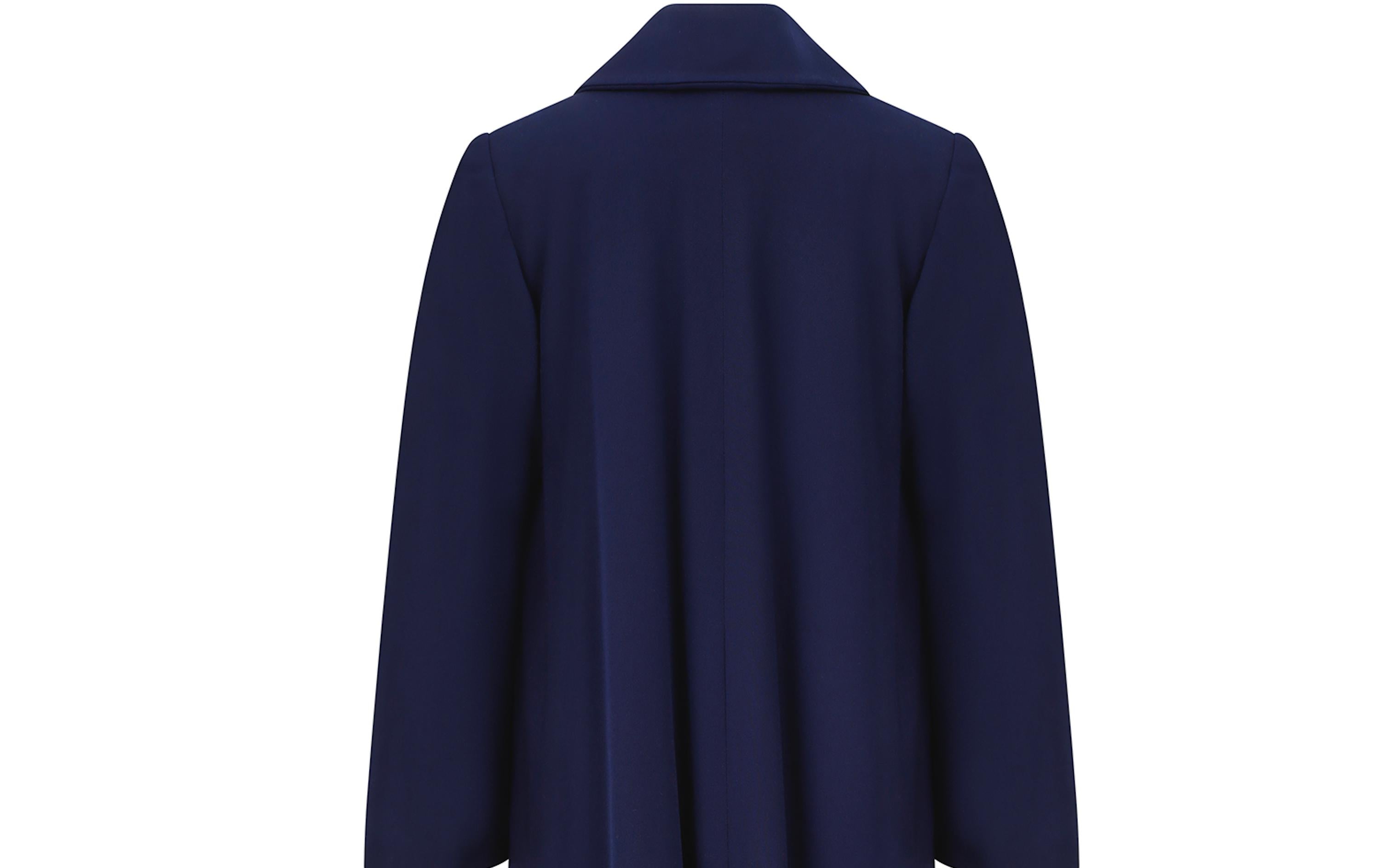 Tailored from 100% virgin wool, it fastens at the neck with a large tonal fabric button and features a wide pointed collar and slip pockets to the front. It is exceptionally well lined in very high quality rayon which has been wool backed for extra warmth. The additional weight of these combined fabrics provide the "swing" and it is a joy to wear. A coat of this quality is a rare find, especially in such excellent vintage condition. Very fresh looking, there are no visible faults and she appears unaltered. Will fit a great range of sizes up to a UK 14 or US 10. Our model is a UK 6 US 0-2 and 5'11" and this coat had plenty of room on her.