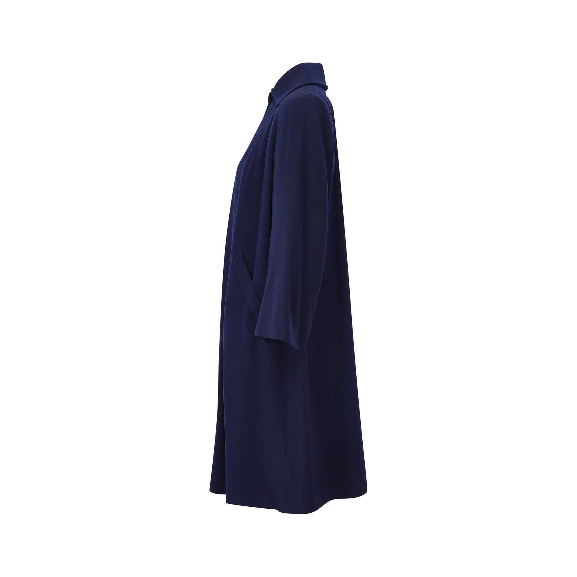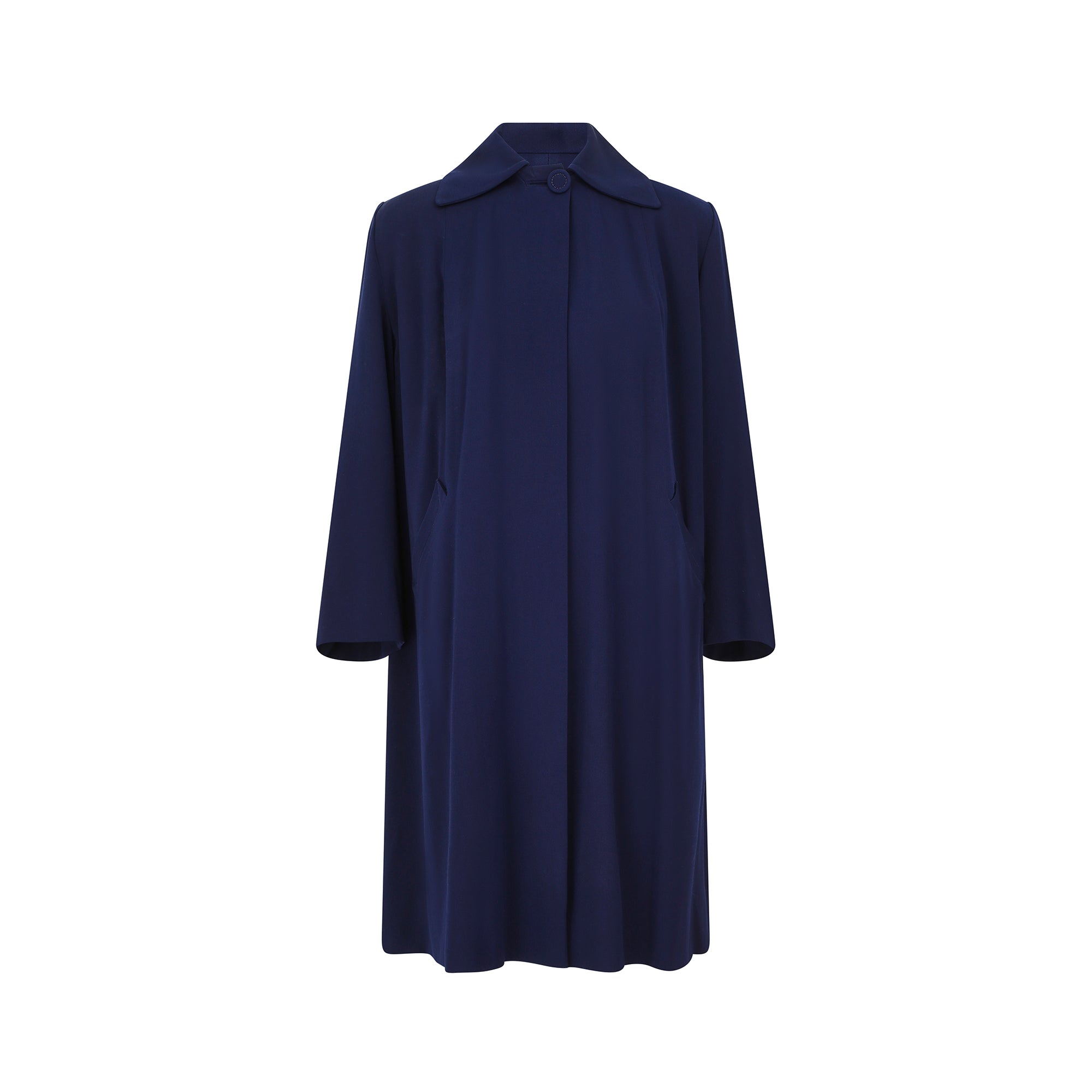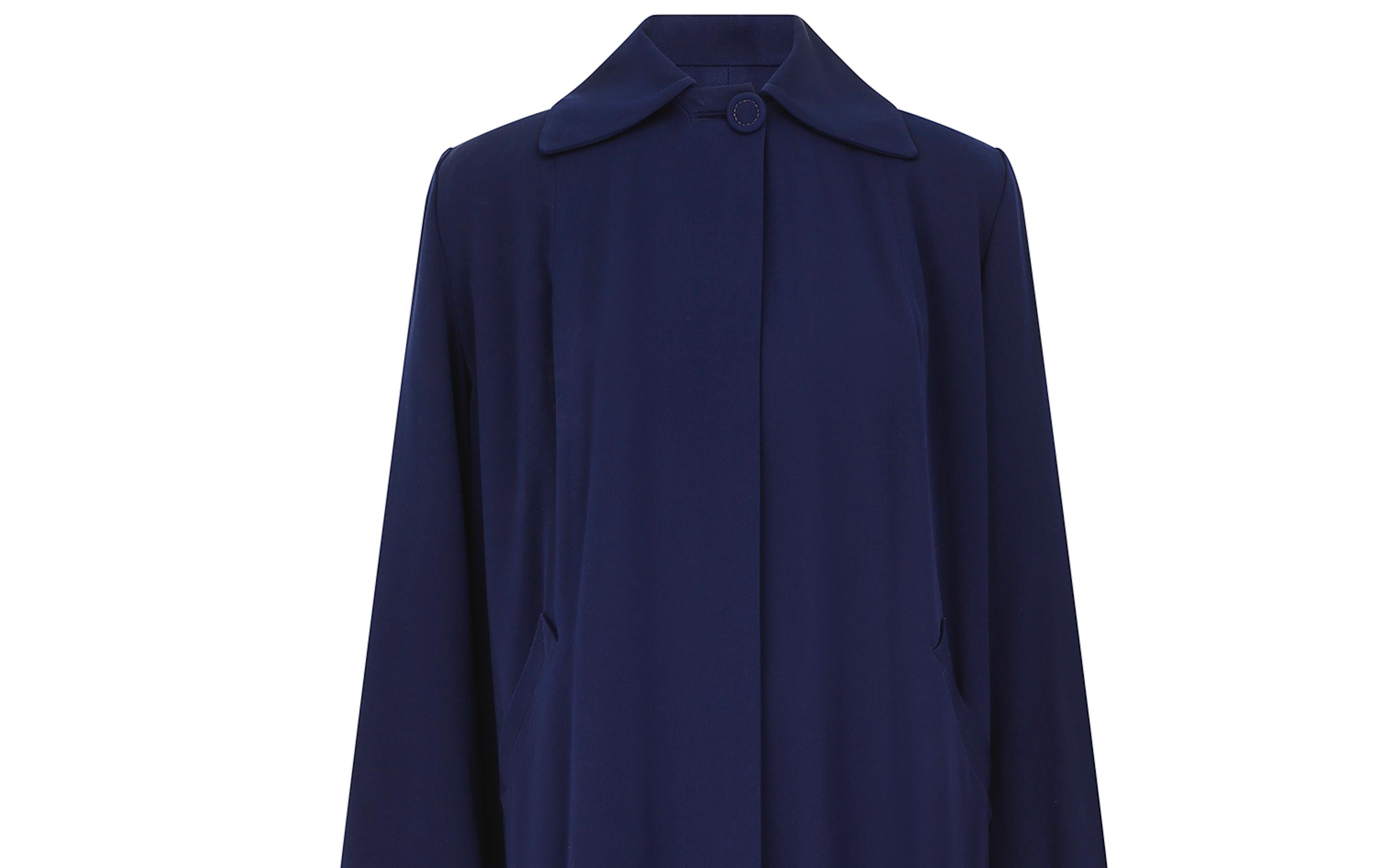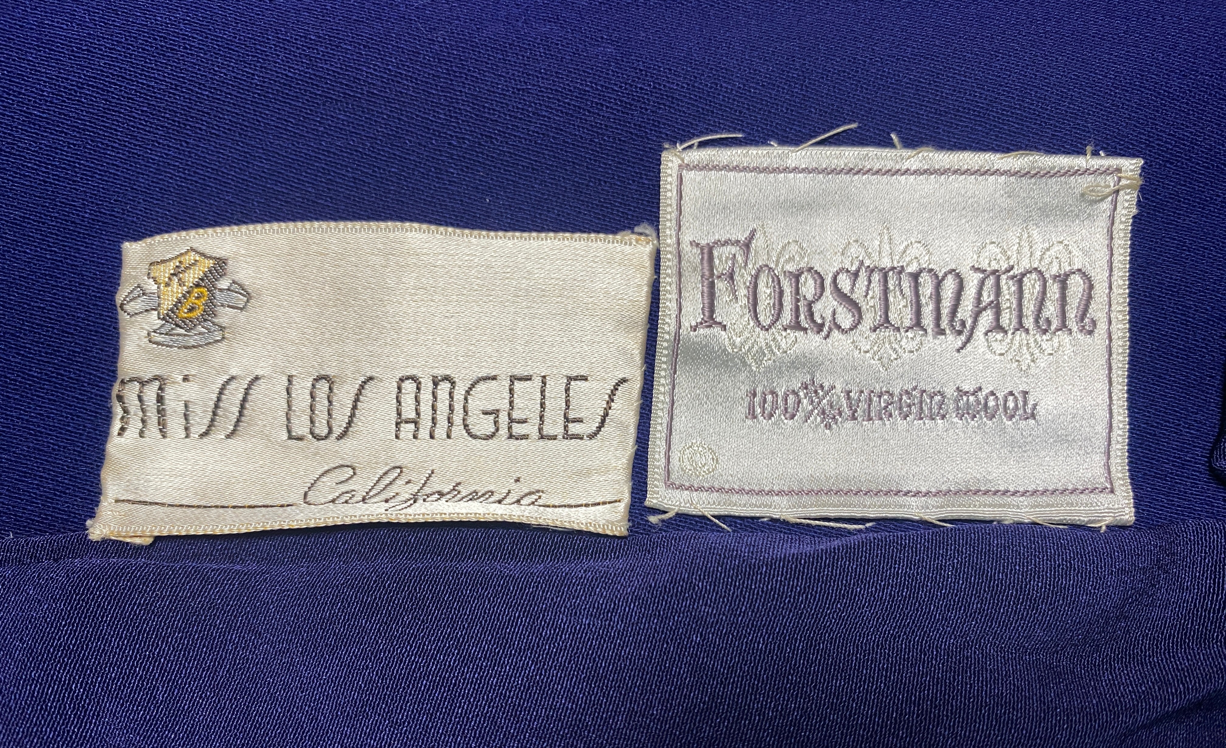 Popularised in the 1940s, the swing or swagger coat’s iconic silhouette was generously cut and its playful, flared look made it a hit with the era’s most glamorous movers and shakers. This coat, which is between royal blue and navy in colour has two labels which read “Miss Los Angeles of California” and “Forstmann”. Forstmann Woolen Co. was a wool company formed in 1904. The Forstmann label was often included alongside the garment designer’s label as a demonstration of the high quality of the product.
