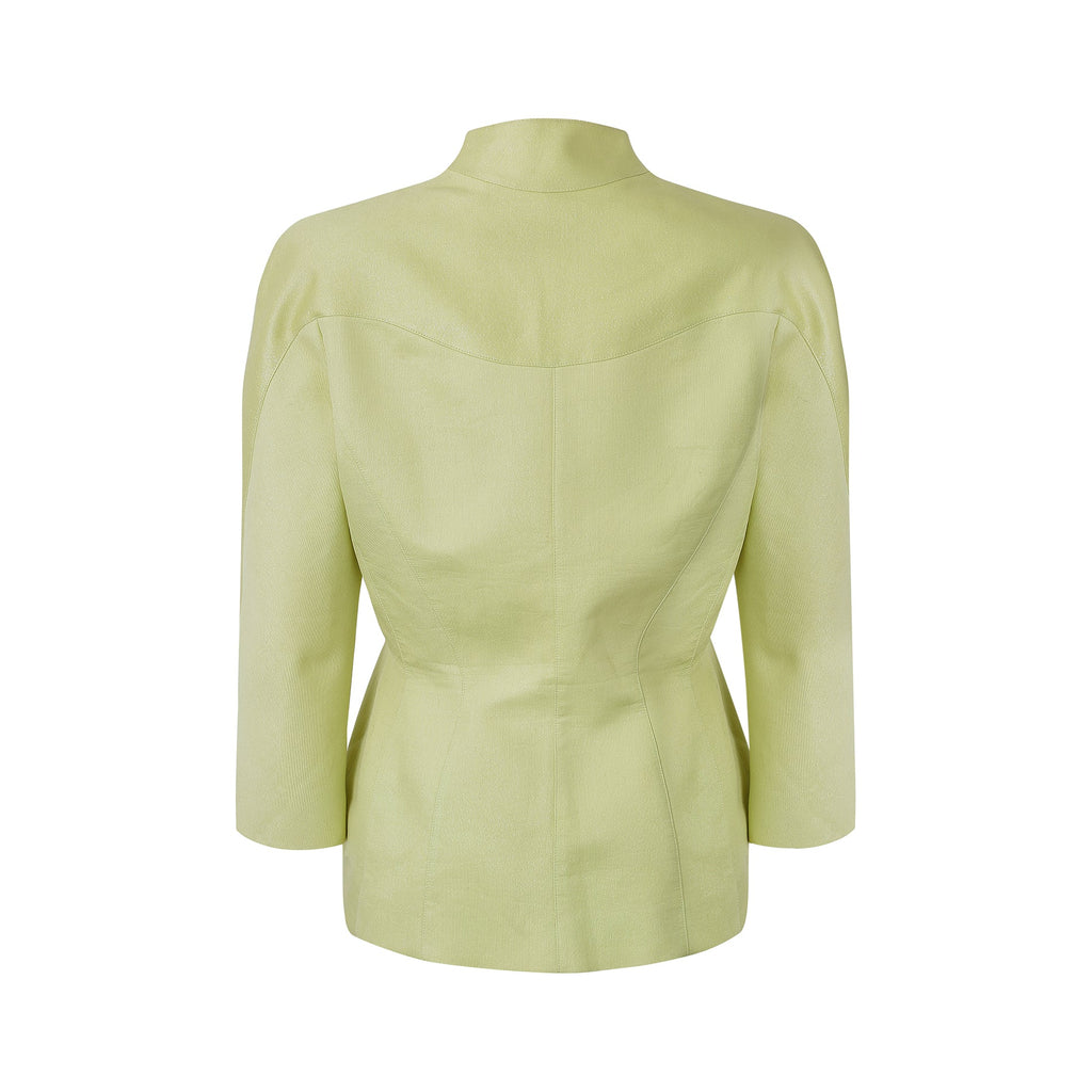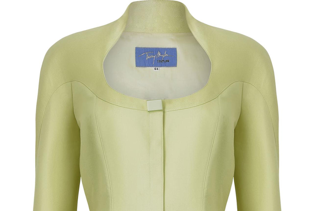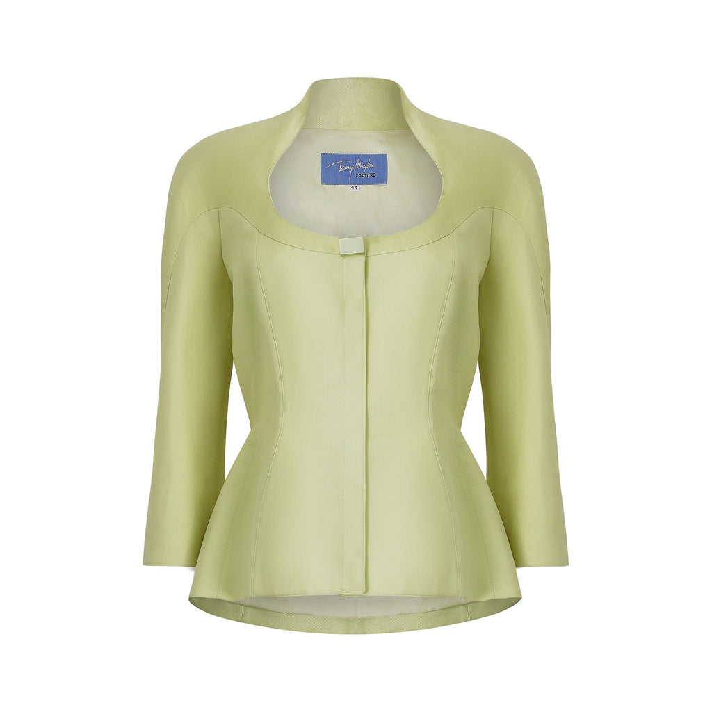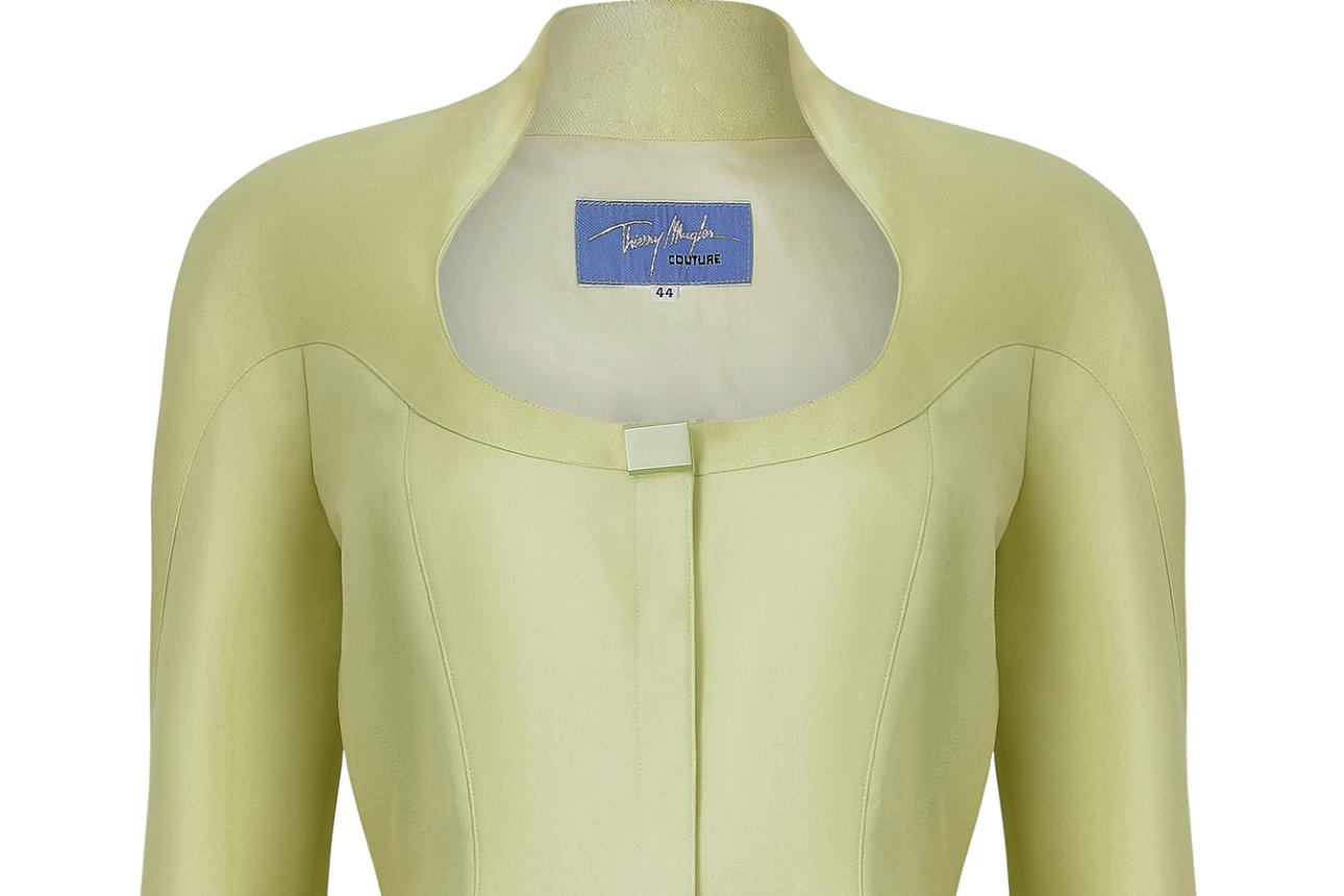 This 1990s Thierry Mugler couture jacket is cut from an unusual medium weight woven fabric. It is a pale shade of chartreuse, almost lime green, with flecks of sparkle to create an iridescent effect. Featuring a rounded front and high collar to the back of the neck - typical of Mugler's tendency to alter traditional necklines in favour of more abstract, unusual shapes. It fastens down the front with six sturdy poppers, with rectangular button detail to the topmost fastening. The sleeves slope gently down from the shoulder, and the body of the jacket is sewn with dart seam detail running vertically from bust to hip, creating a feminine shape. The jacket flares out slightly at the hip, further enhancing this silhouette, and is lined with a pale lemon yellow silky feel fabric. It is in excellent vintage condition, with no faults or stains to note. Labelled a French size 44, it would best fit a size 12 UK, or 8 US.