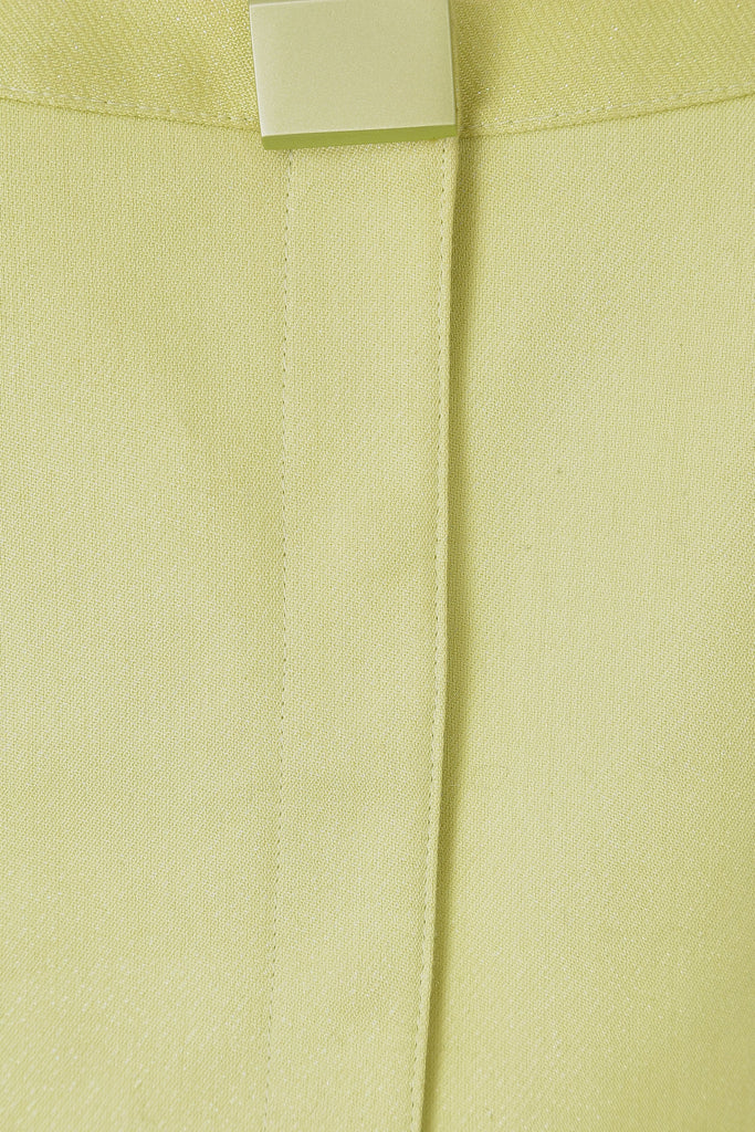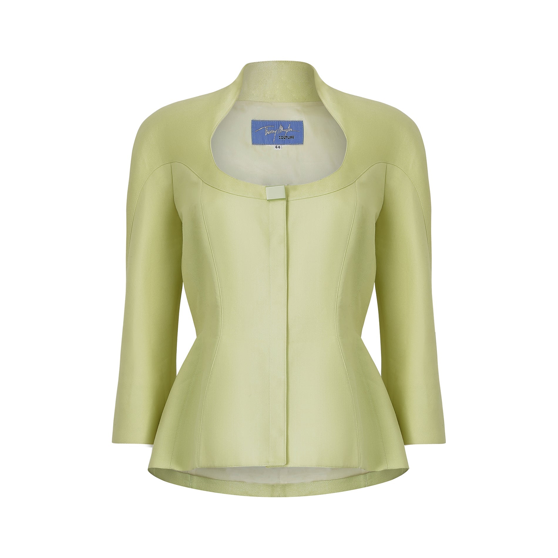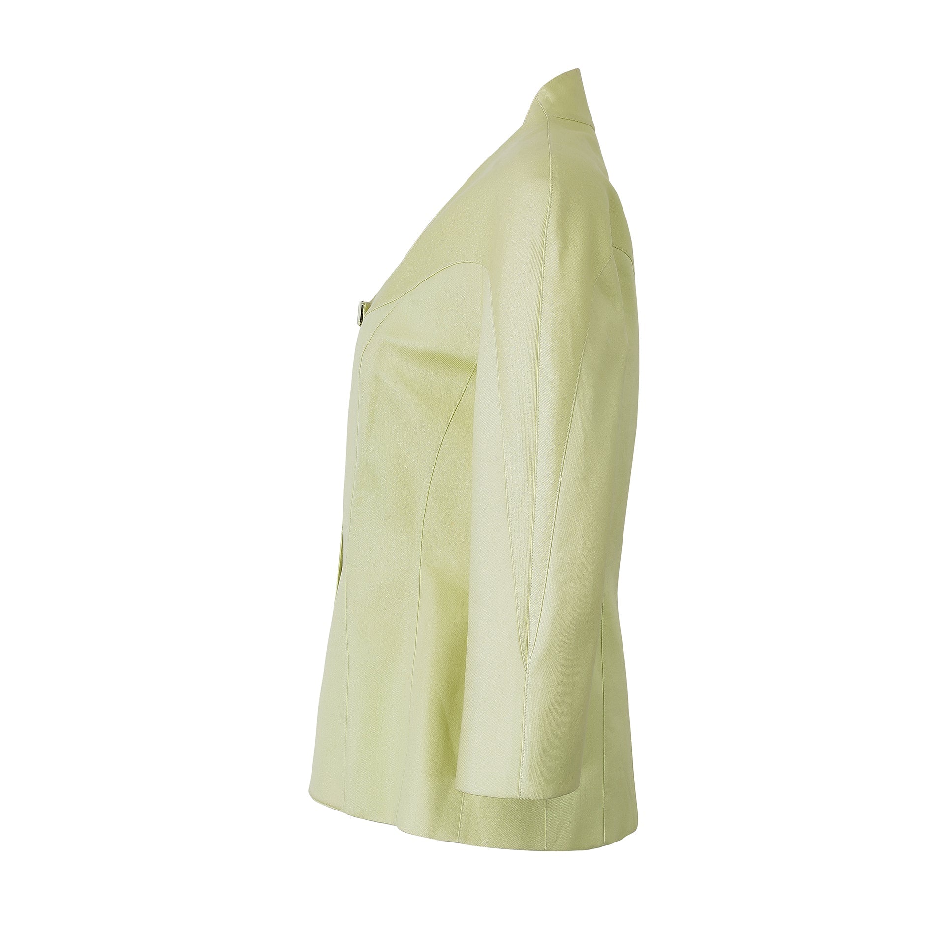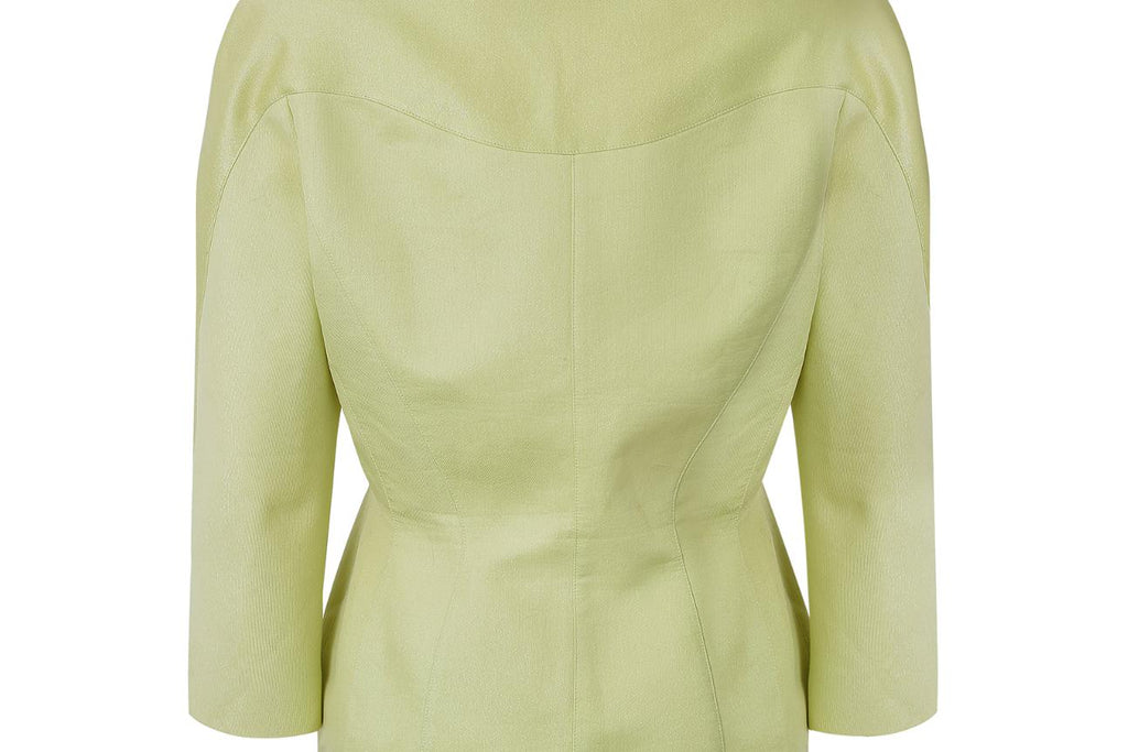 This 1990s Thierry Mugler couture jacket is cut from an unusual medium weight woven fabric. It is a pale shade of chartreuse, almost lime green, with flecks of sparkle to create an iridescent effect. Featuring a rounded front and high collar to the back of the neck - typical of Mugler's tendency to alter traditional necklines in favour of more abstract, unusual shapes. It fastens down the front with six sturdy poppers, with rectangular button detail to the topmost fastening. The sleeves slope gently down from the shoulder, and the body of the jacket is sewn with dart seam detail running vertically from bust to hip, creating a feminine shape. The jacket flares out slightly at the hip, further enhancing this silhouette, and is lined with a pale lemon yellow silky feel fabric. It is in excellent vintage condition, with no faults or stains to note. Labelled a French size 44, it would best fit a size 12 UK, or 8 US.