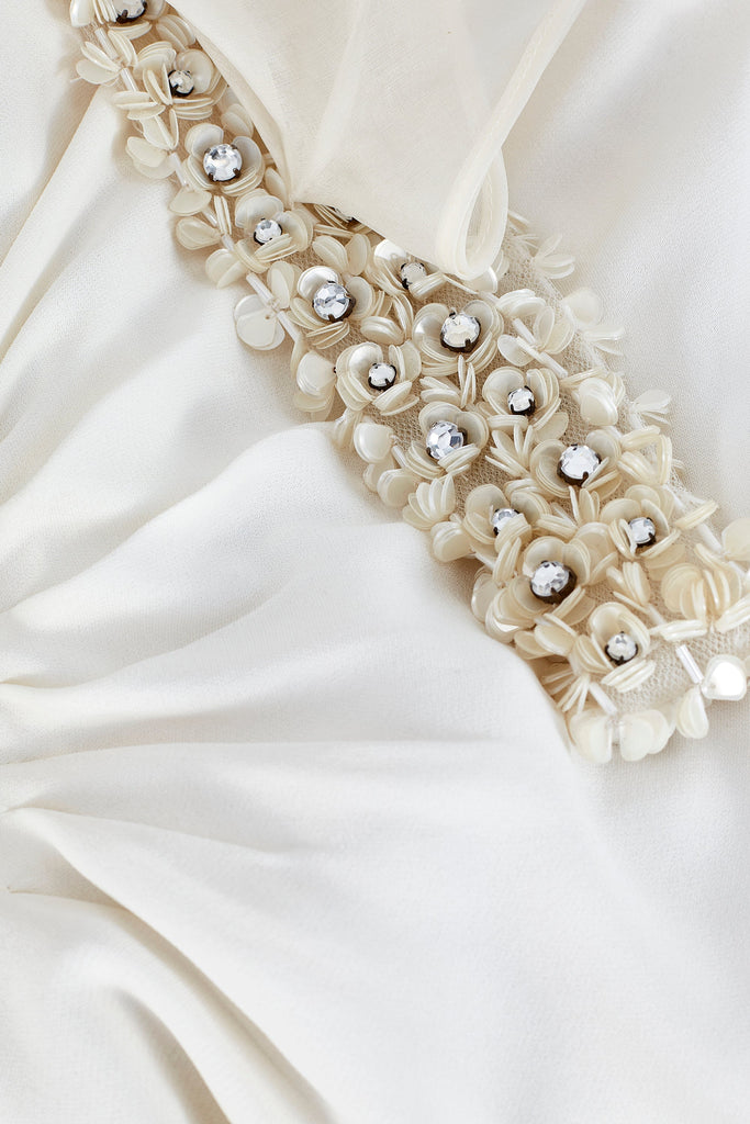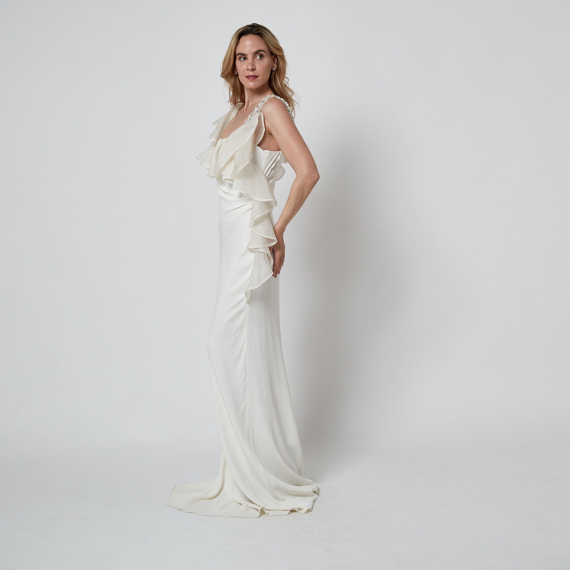 This romantic dress is tailored from pale cream silky fabric and falls in a column silhouette to the floor. It has two straps made from clashing yet complimentary fabrics. One strap is crafted from cream chiffon and forms a theatrical ruffle that sweeps over the shoulder, across the bust and cascades down the side of the dress. The other strap is heavily beaded; layered white mesh is adorned with pretty flowers formed of pearlescent petal-shaped beads around a central rhinestone. Inside the dress is a nude corset. Boned the whole way around the body, it has a modesty strap and unwiring at the bust. The dress fastens under the right arm with a hidden tonal zip and is fully lined with cream satin. It would make a stunning and highly memorable wedding dress.