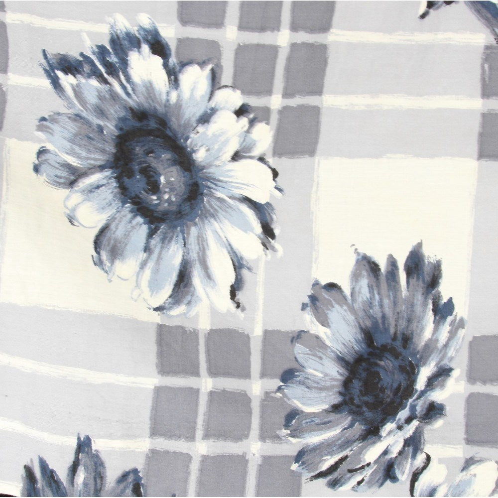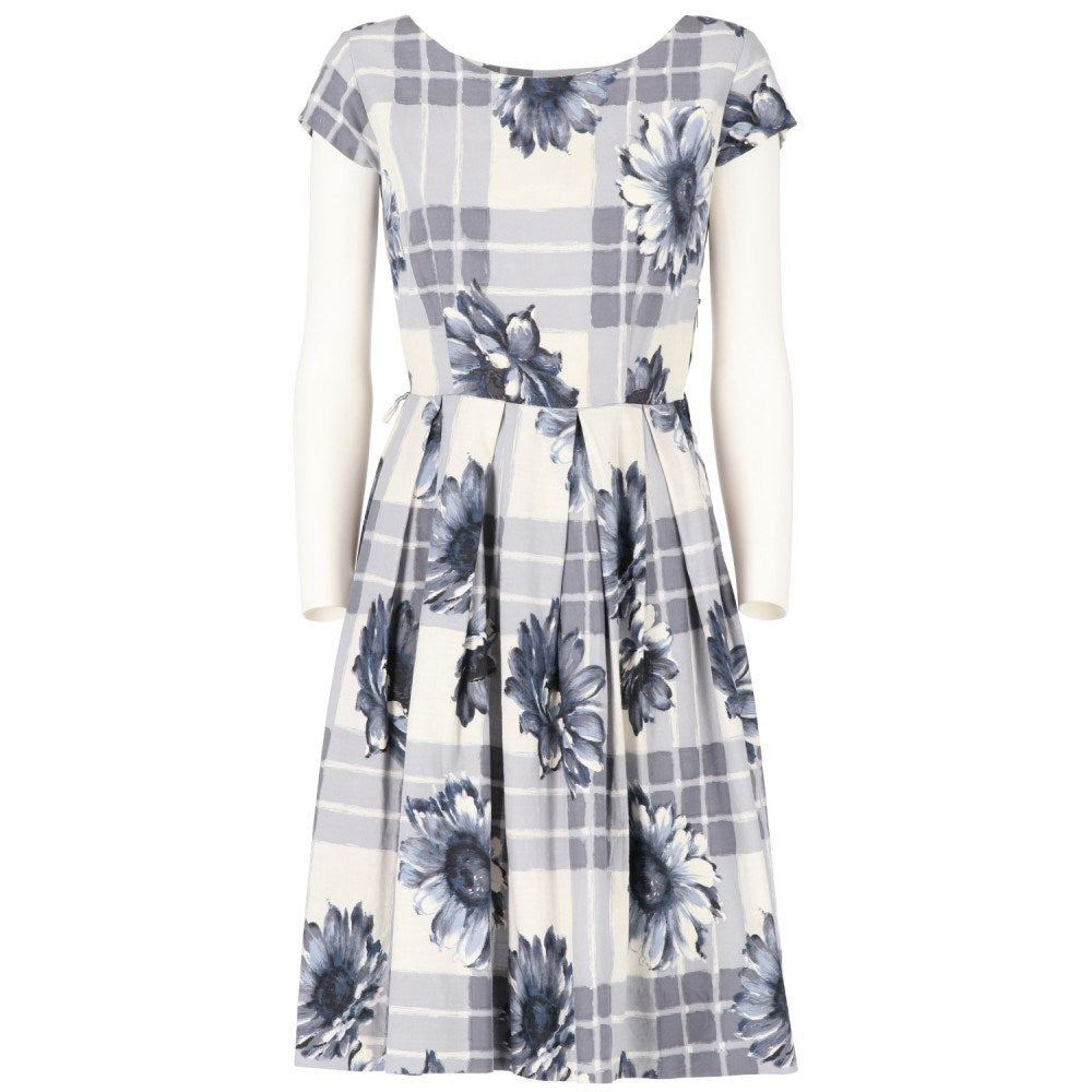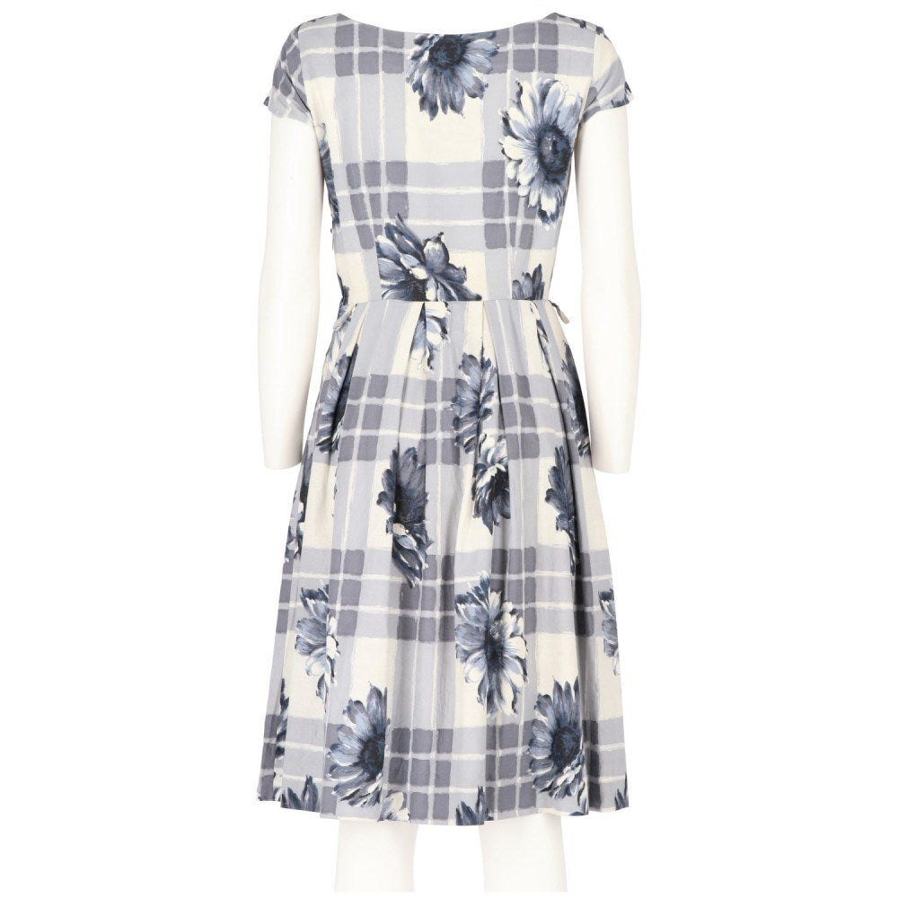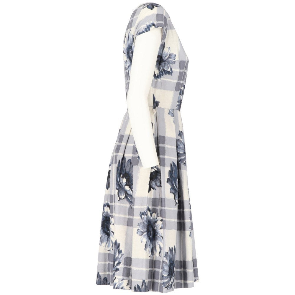 Short white cotton dress with checked and floral pattern in shades of blue and gray. Round neckline, short sleeves and pleats at the waist.