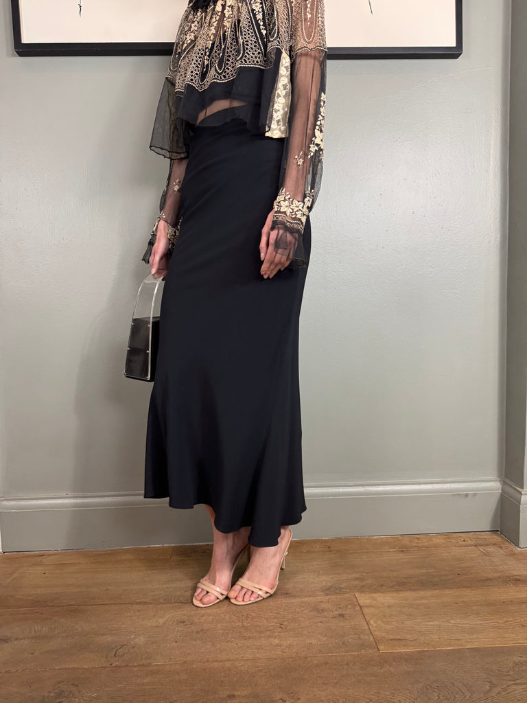 This Alexander McQueen black silk high waisted skirt features a fabulous bias cut for an elegant and sculpted fit. Made with high quality silk, this skirt is a perfect addition to your wardrobe for a timeless and stylish look. Complete with a side zip for easy and comfortable wear.