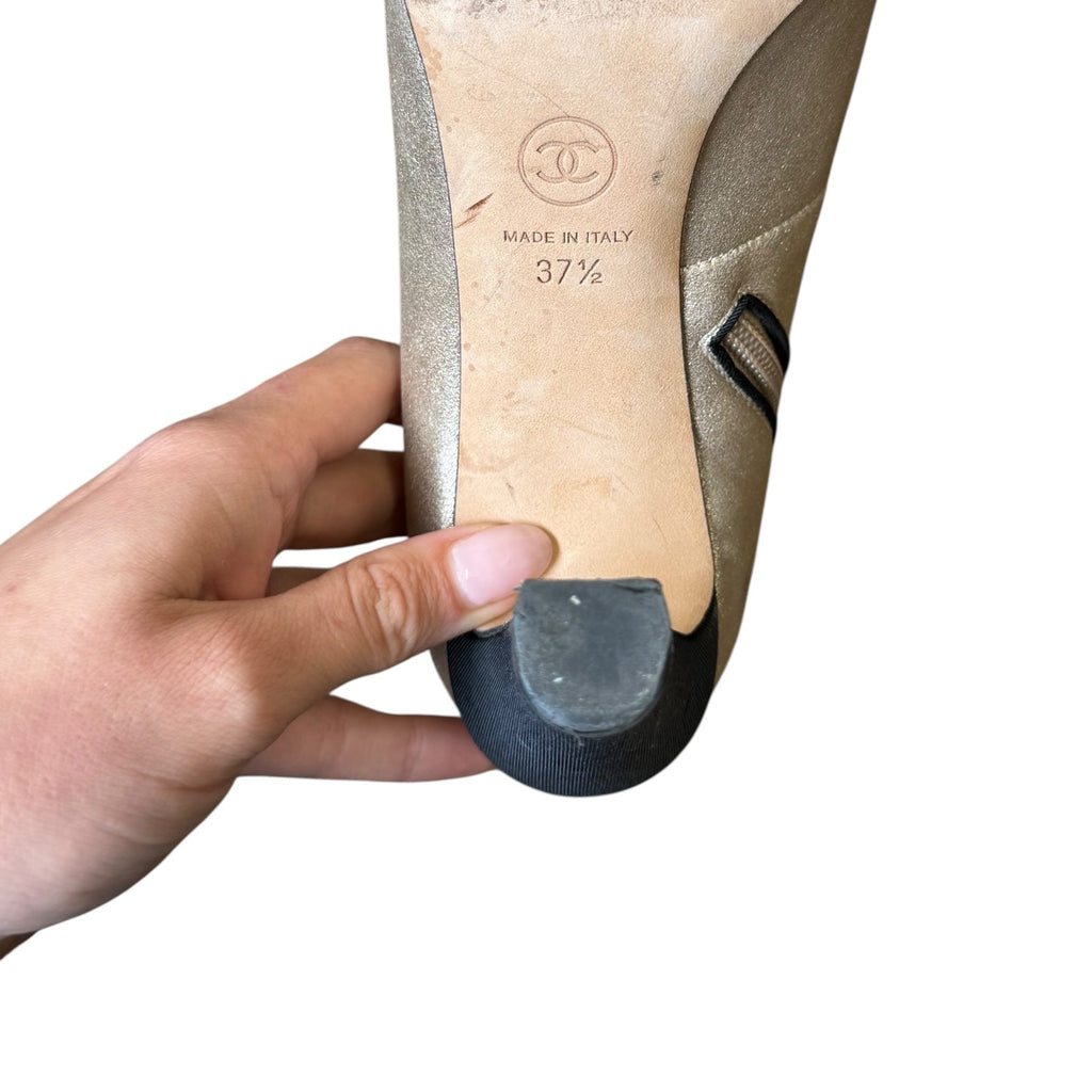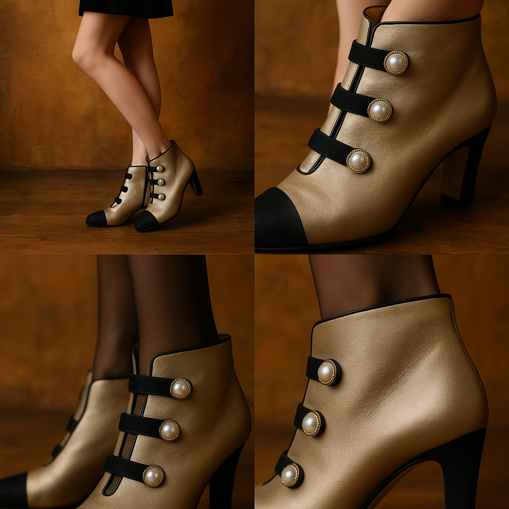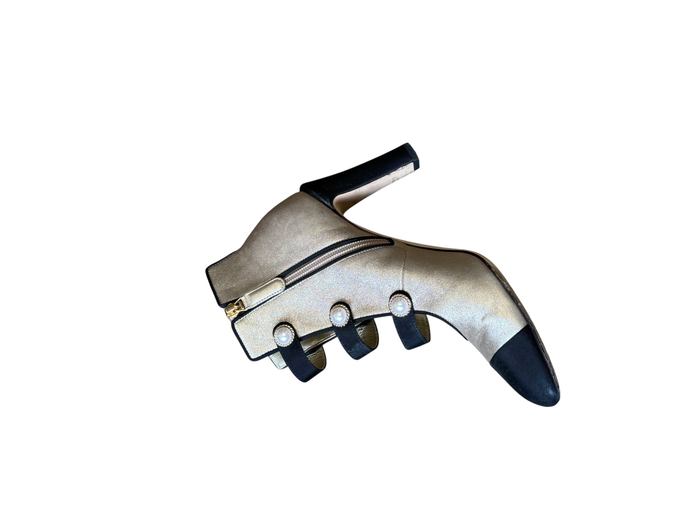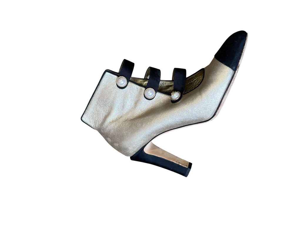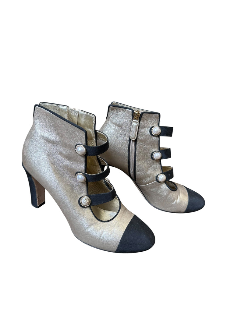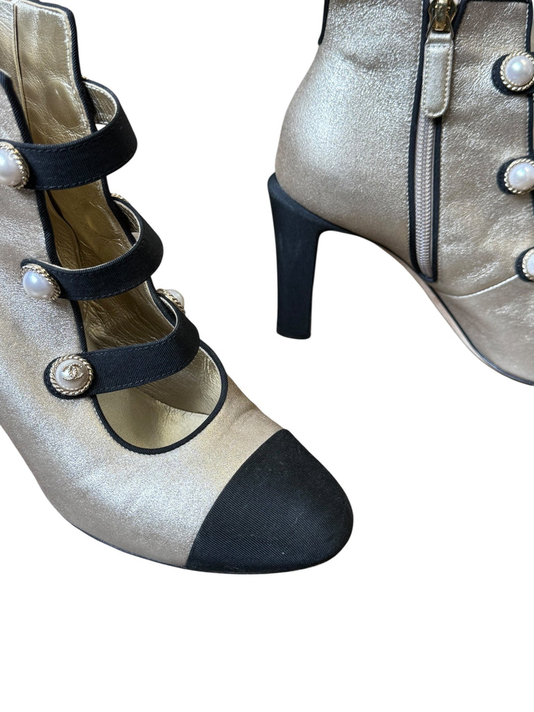 Experience timeless elegance with these pre-loved Chanel Y2K light gold and black toe heeled pearl button booties. Featuring three delicate pearl buttons and a 3-inch heel, these classic yet bold shoes embody the iconic Chanel sophistication.