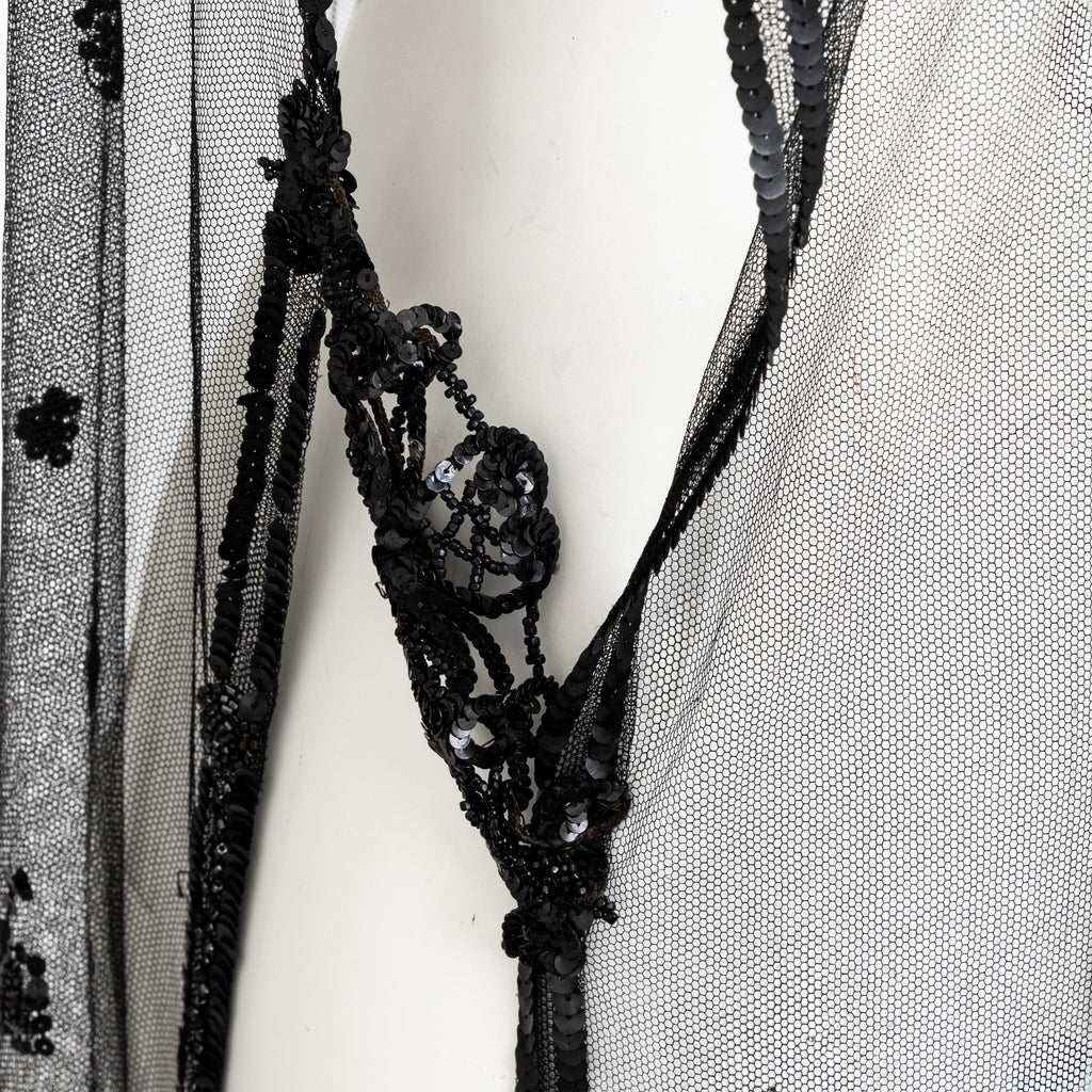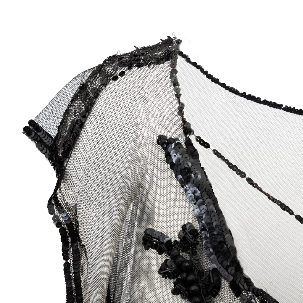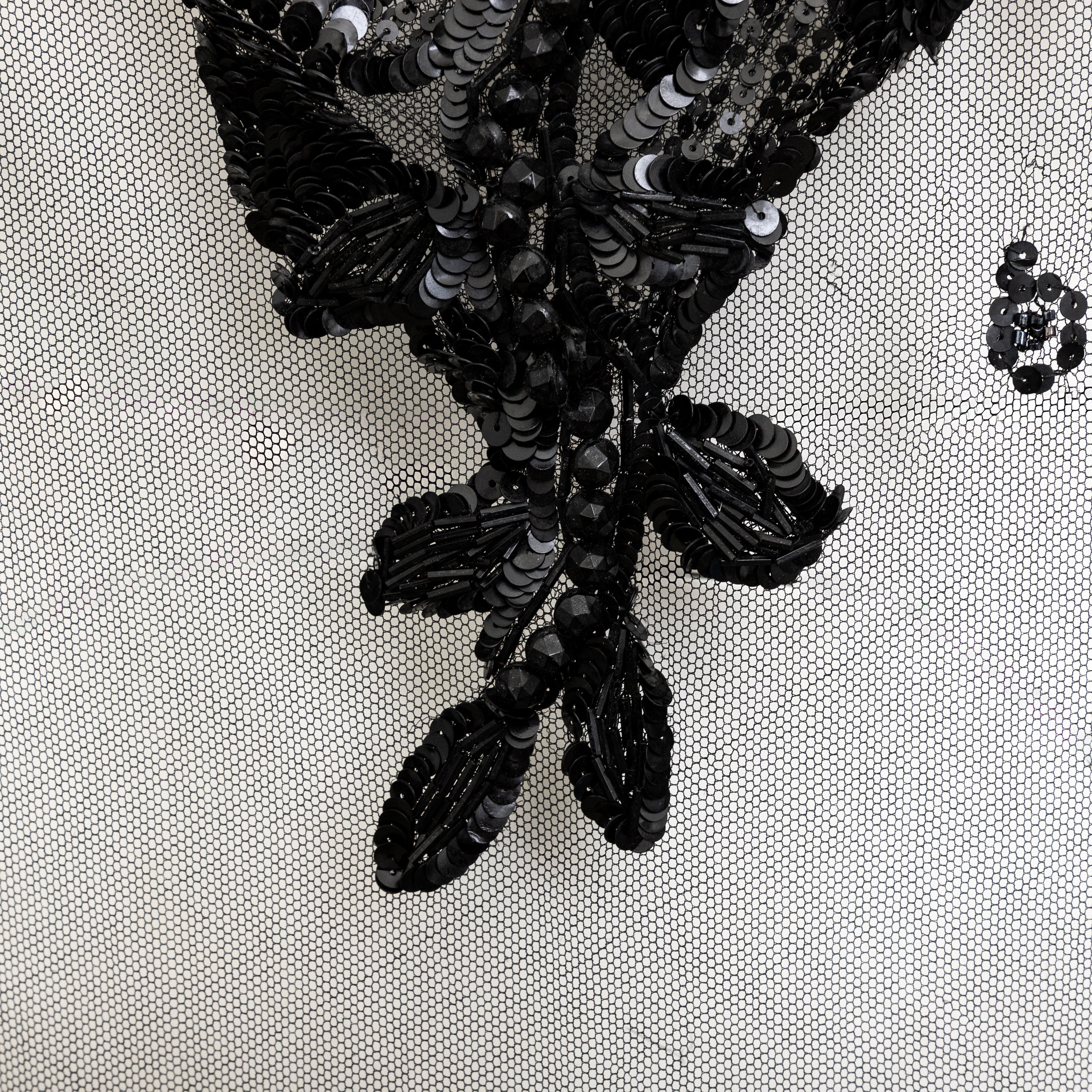 Expertly designed in sheer mesh fabric with black sequins and beads, this 90s long top is a vintage find. The intricate embellishments add a touch of glamour, while the sheer material and open side design provide an alluring silhouette.