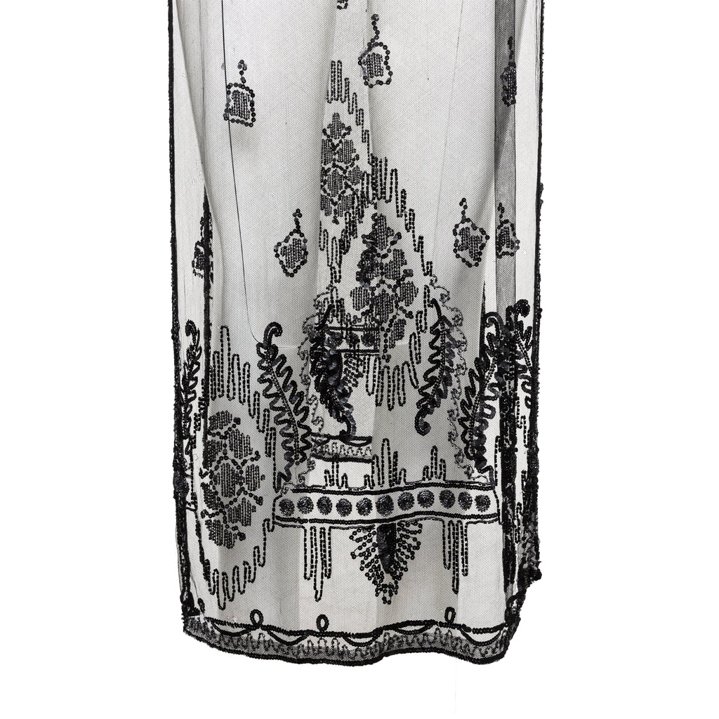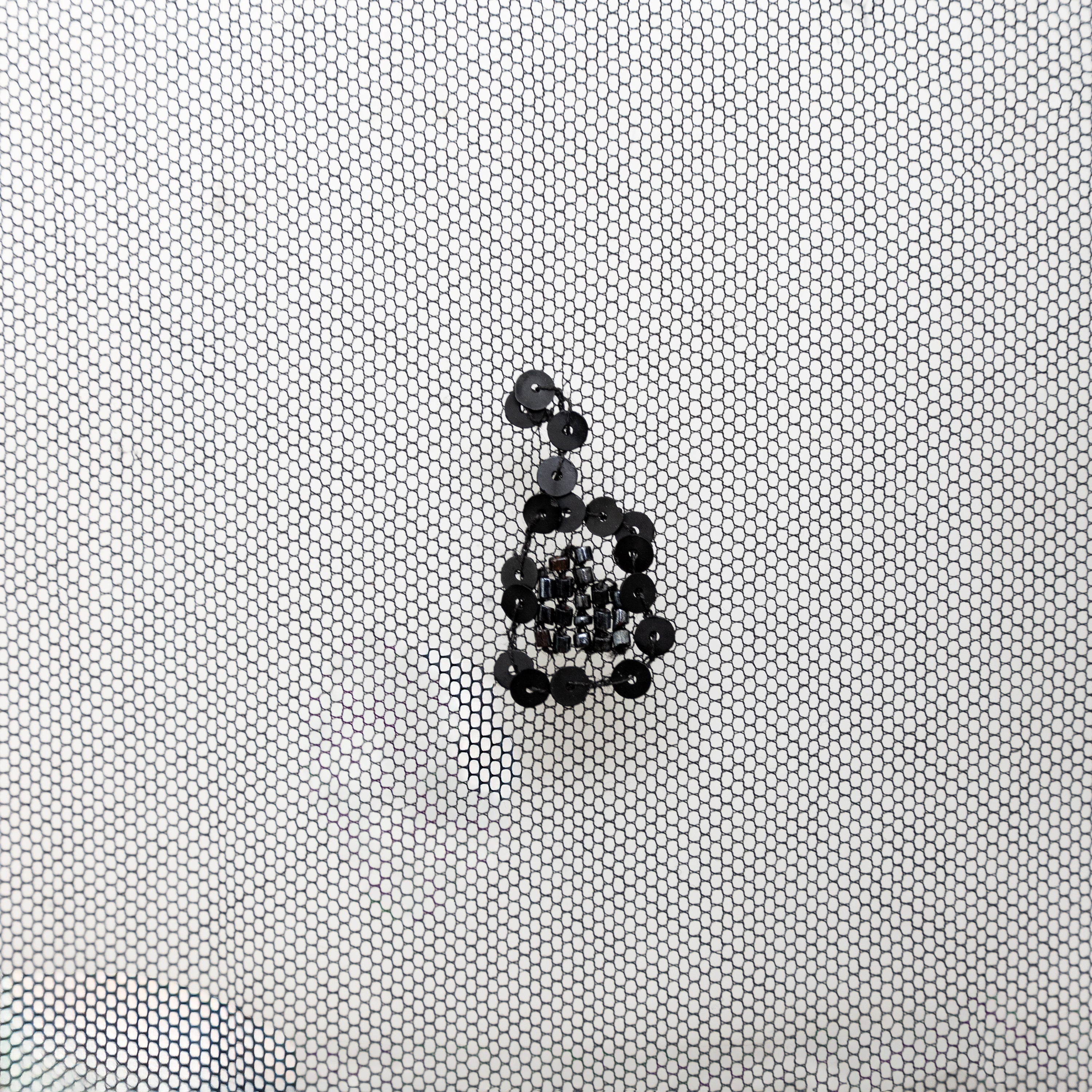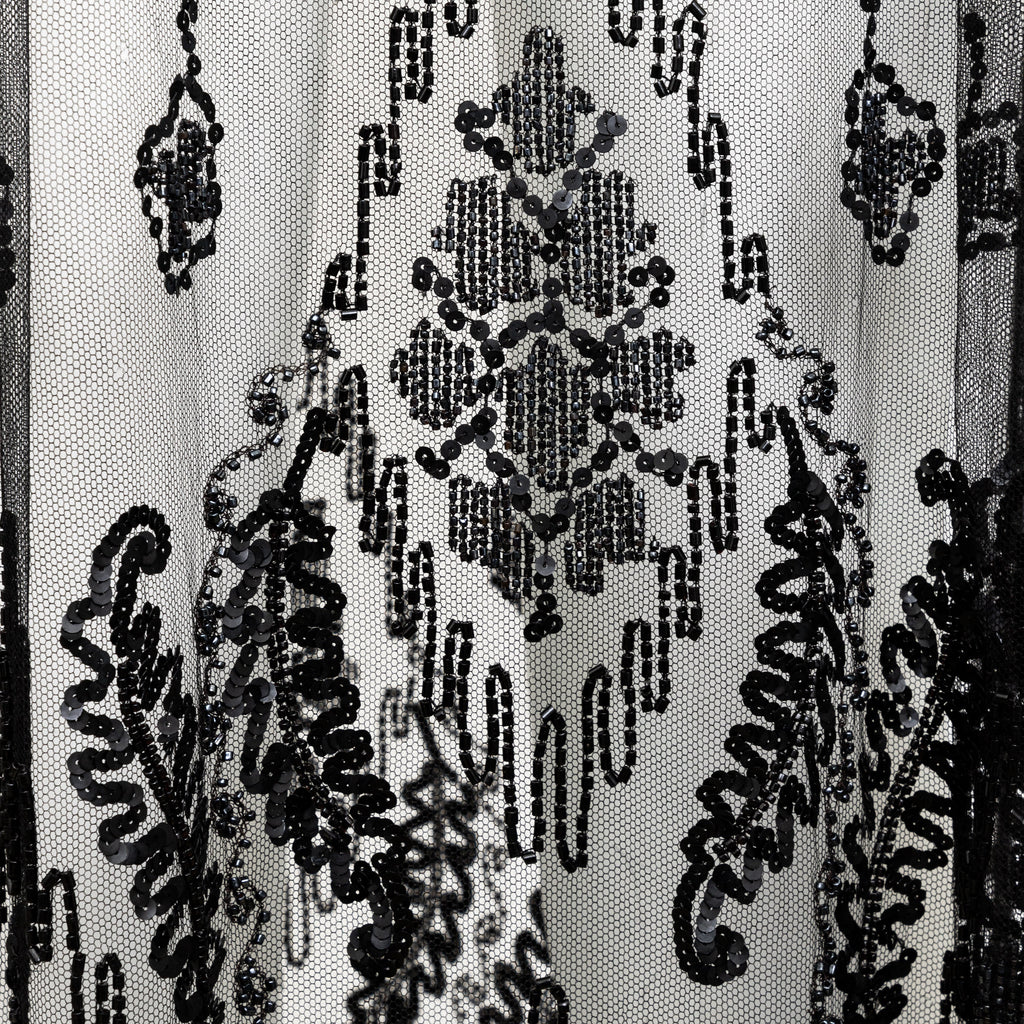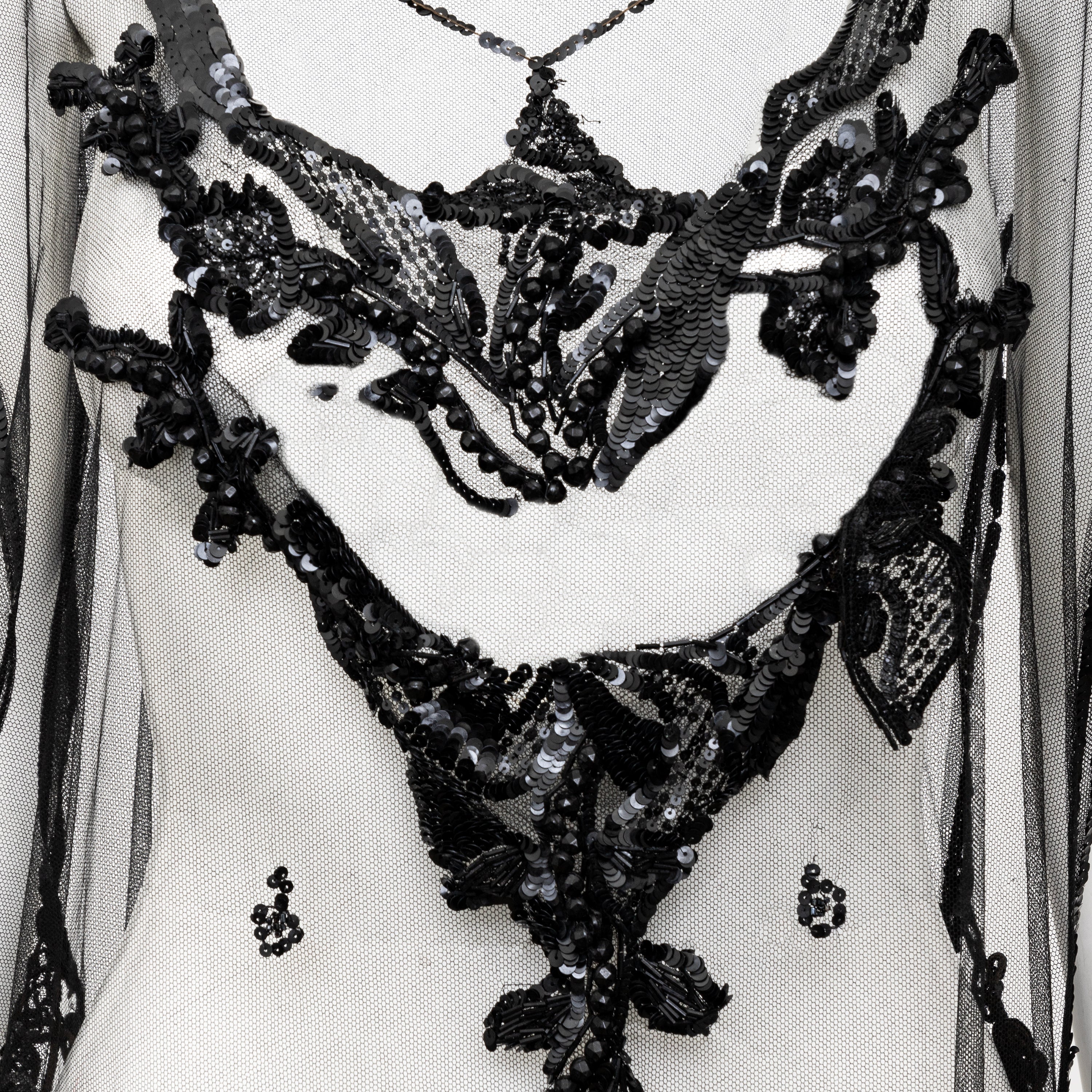 Expertly designed in sheer mesh fabric with black sequins and beads, this 90s long top is a vintage find. The intricate embellishments add a touch of glamour, while the sheer material and open side design provide an alluring silhouette.