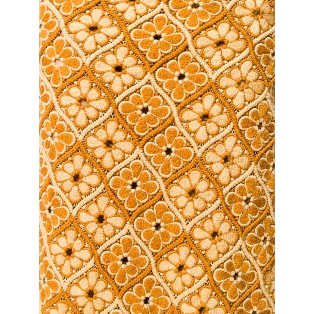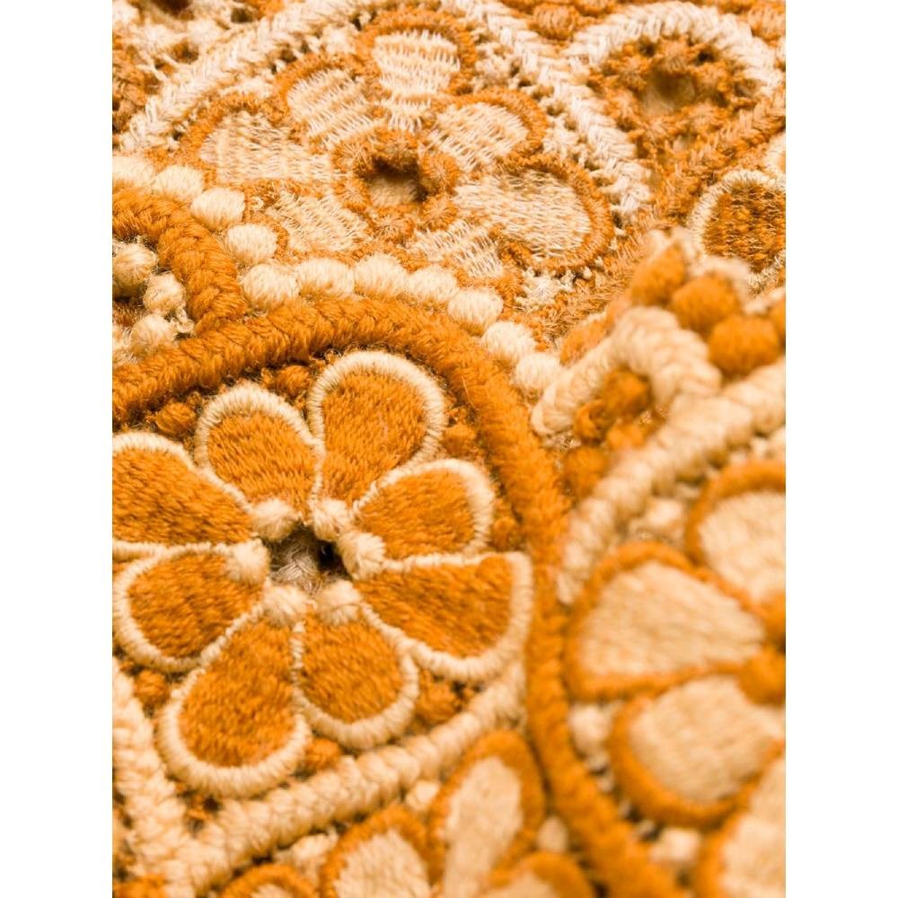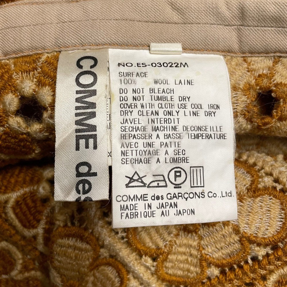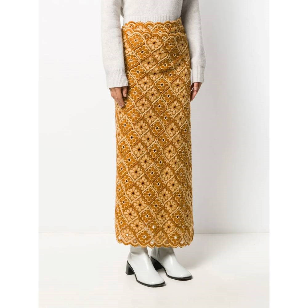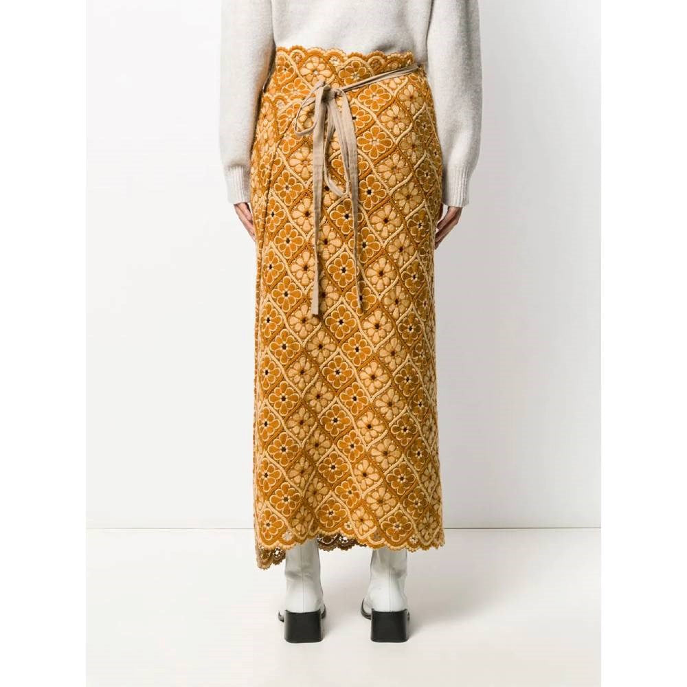 Comme des Garçons ocher and beige long wool skirt with floreal embroideries. Beige lace-up closure at the waist. Scalloped hem.