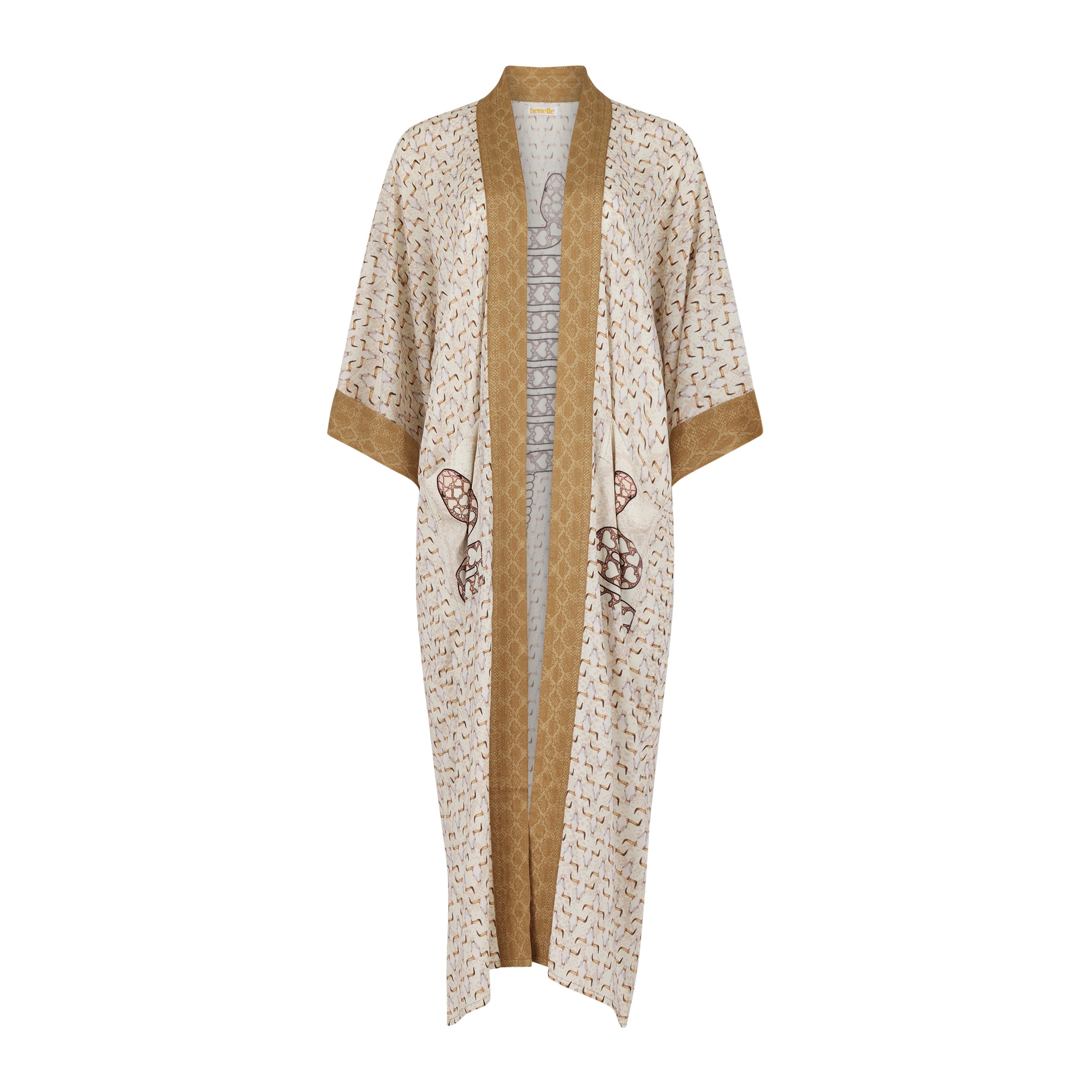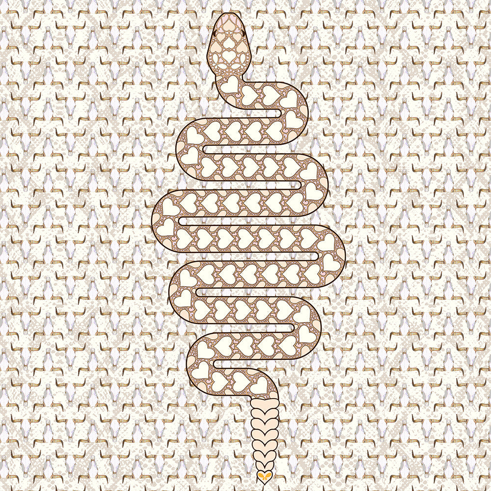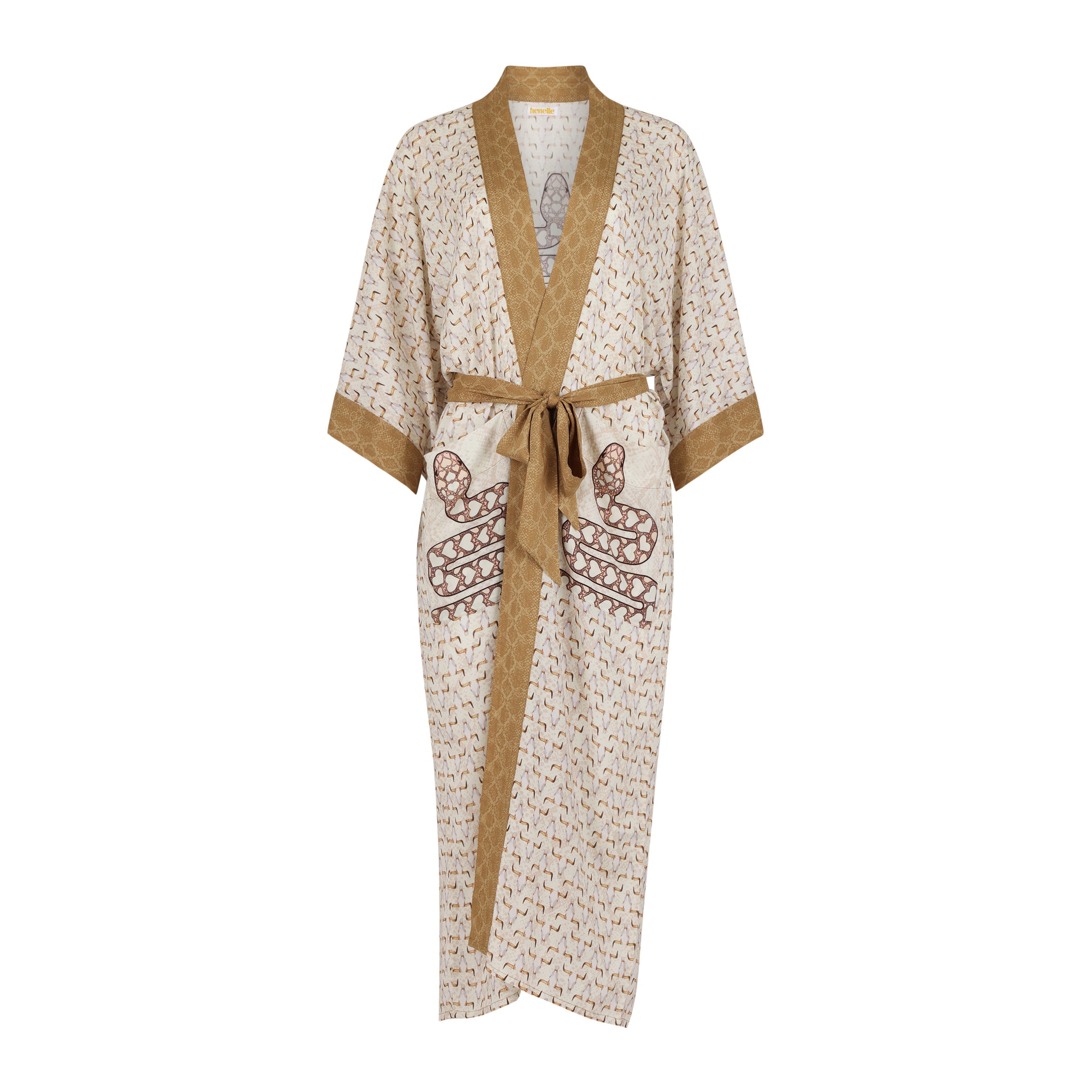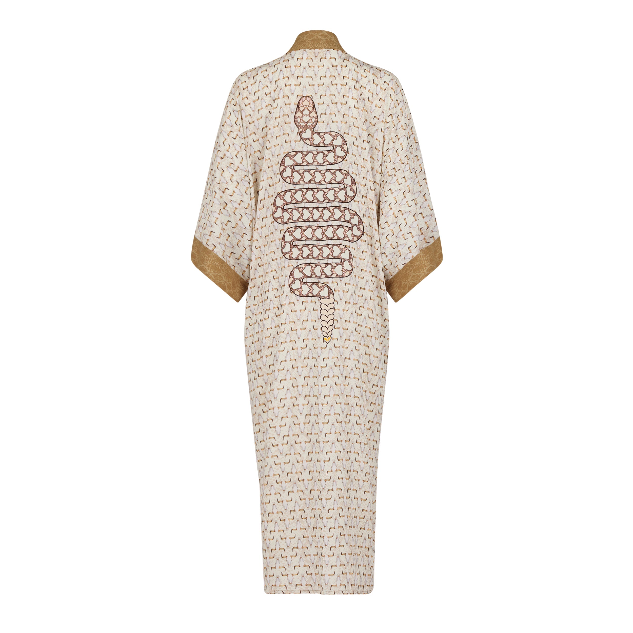 A swirl of snakeskin and goats skulls. Inspired by the extreme, barren and mysterious desert landscapes of Death Valley. All original artwork with hand drawn snake design featuring repeat hearts. A versatile kimono-style robe with wear anywhere appeal, a seamless transition from a poolside cover-up to a statement evening layer .