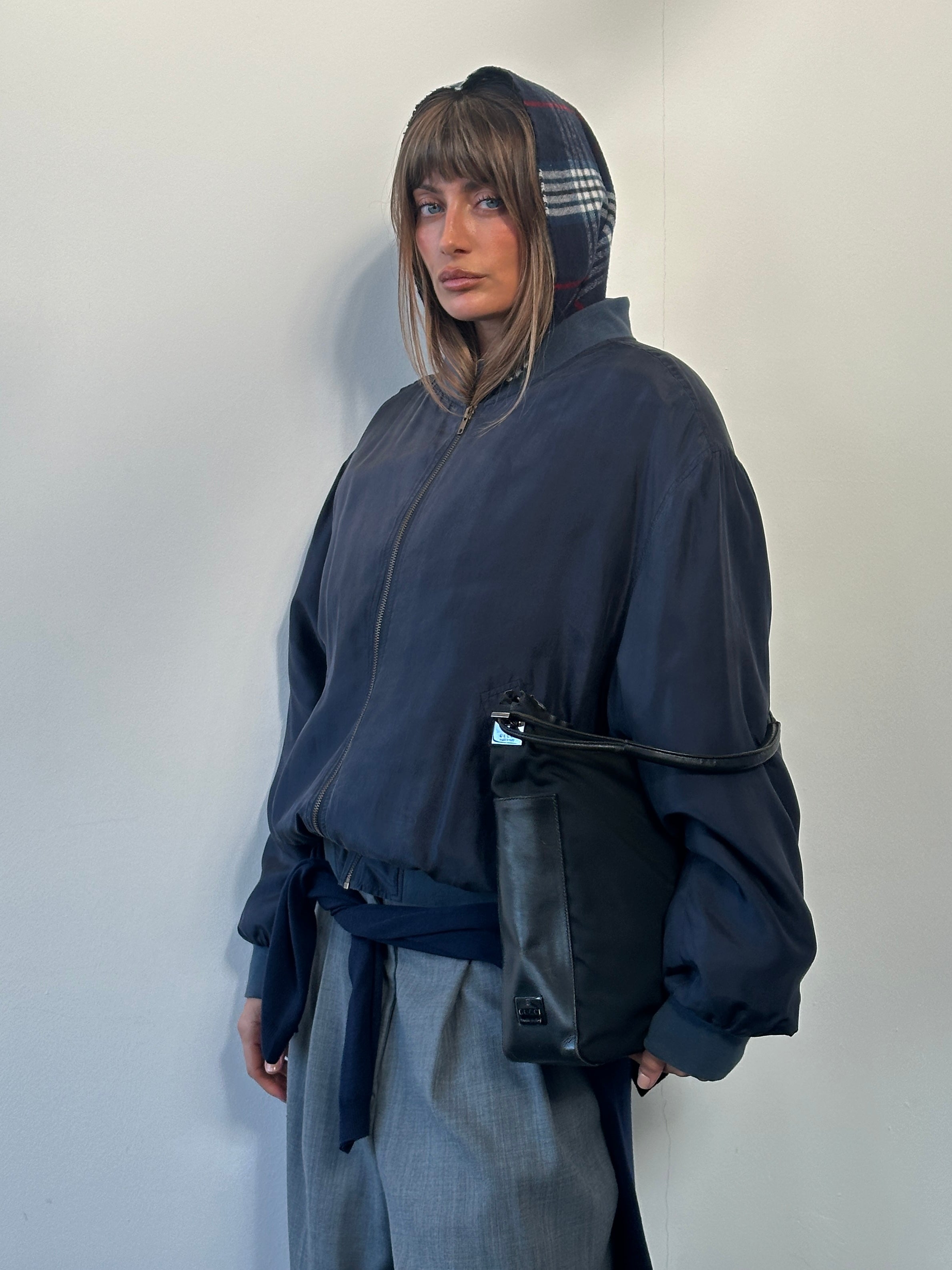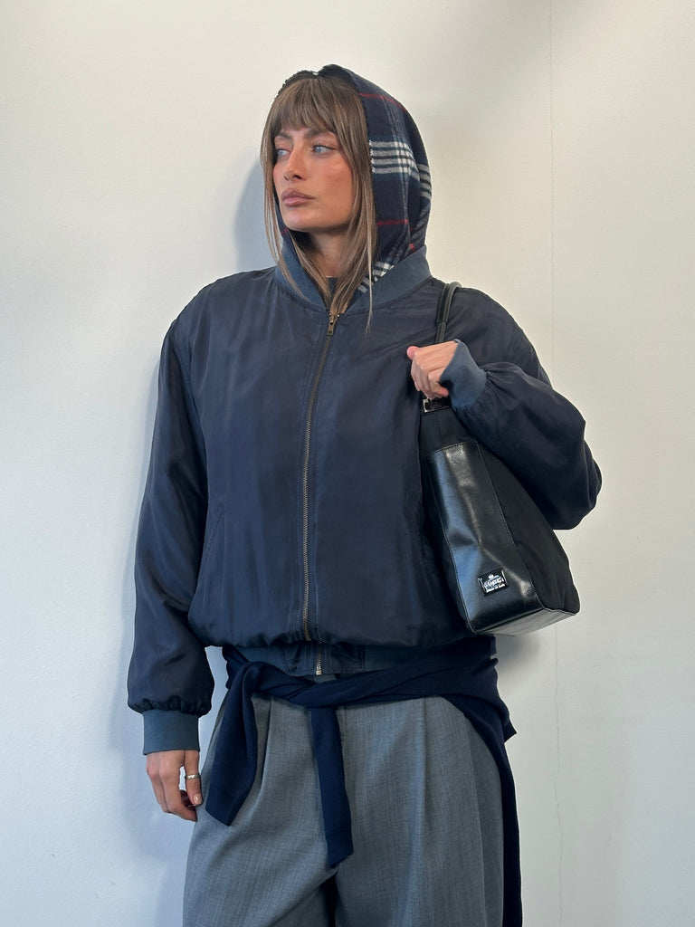 A vintage 1990s Italian lightweight navy silk bomber jacket with subtle shoulder structure, rib trims and a bronze zip. A refined minimal silhouette with a soft drape.