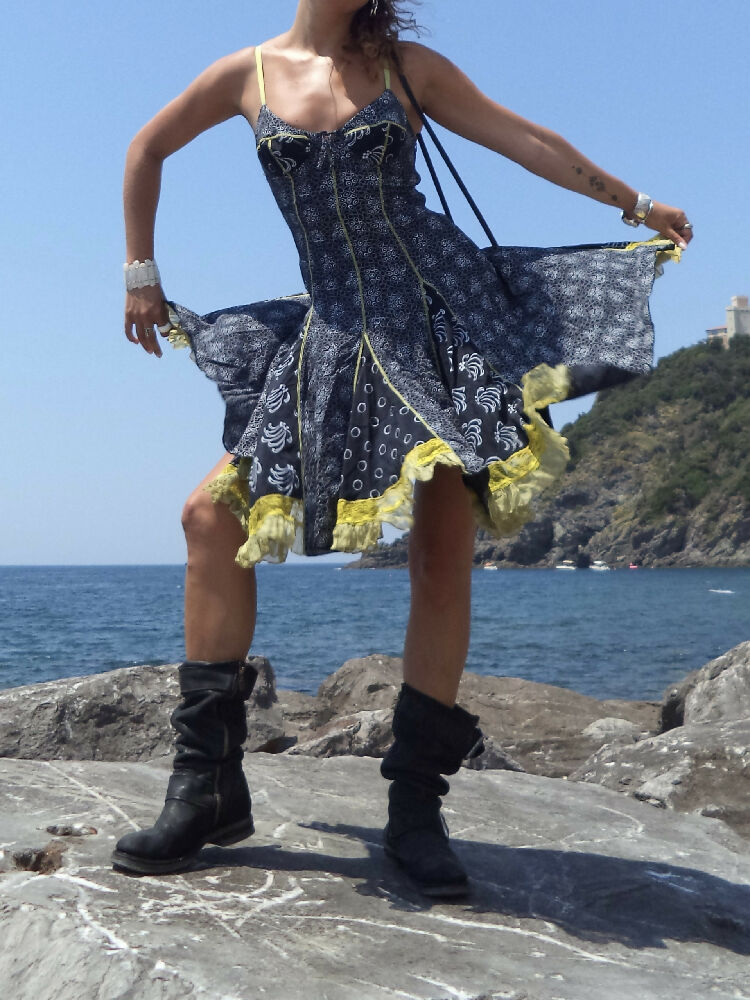 This rare Italian vintage mini dress is crafted from pure breathable silk, combining structure with free-spirited movement. The fabric features a bold black bandana-style print, trimmed with vivid sunshine-yellow ruffles that dance along the hem — a playful contrast that brings the piece to life.