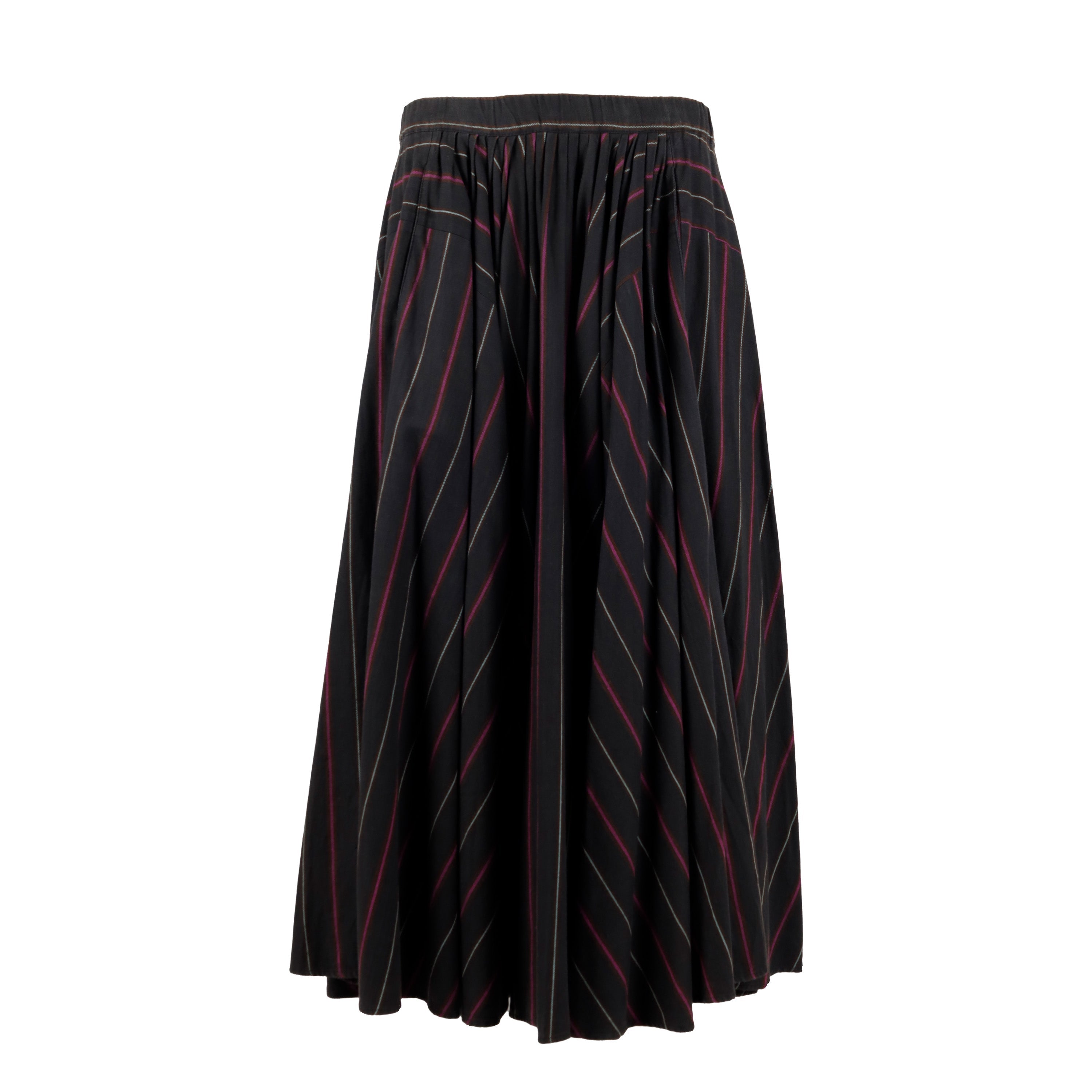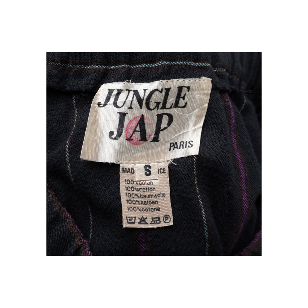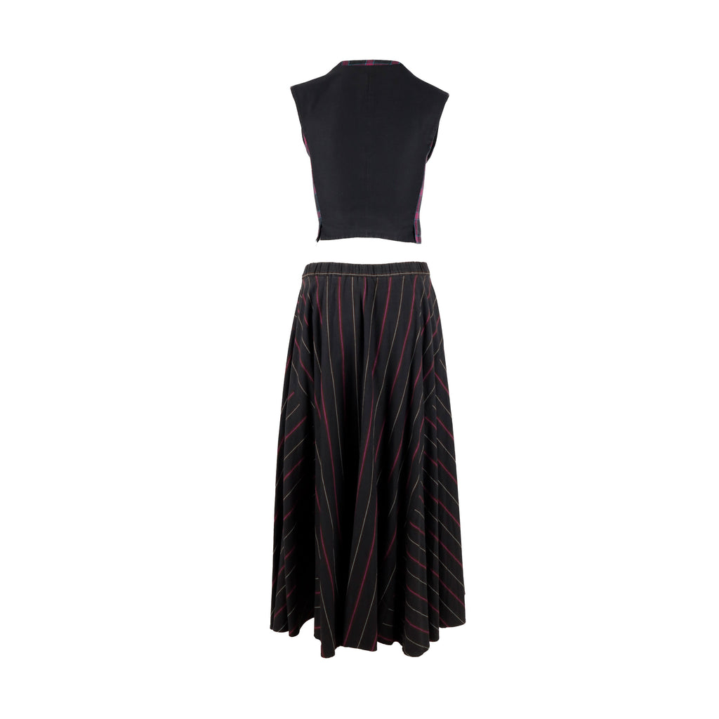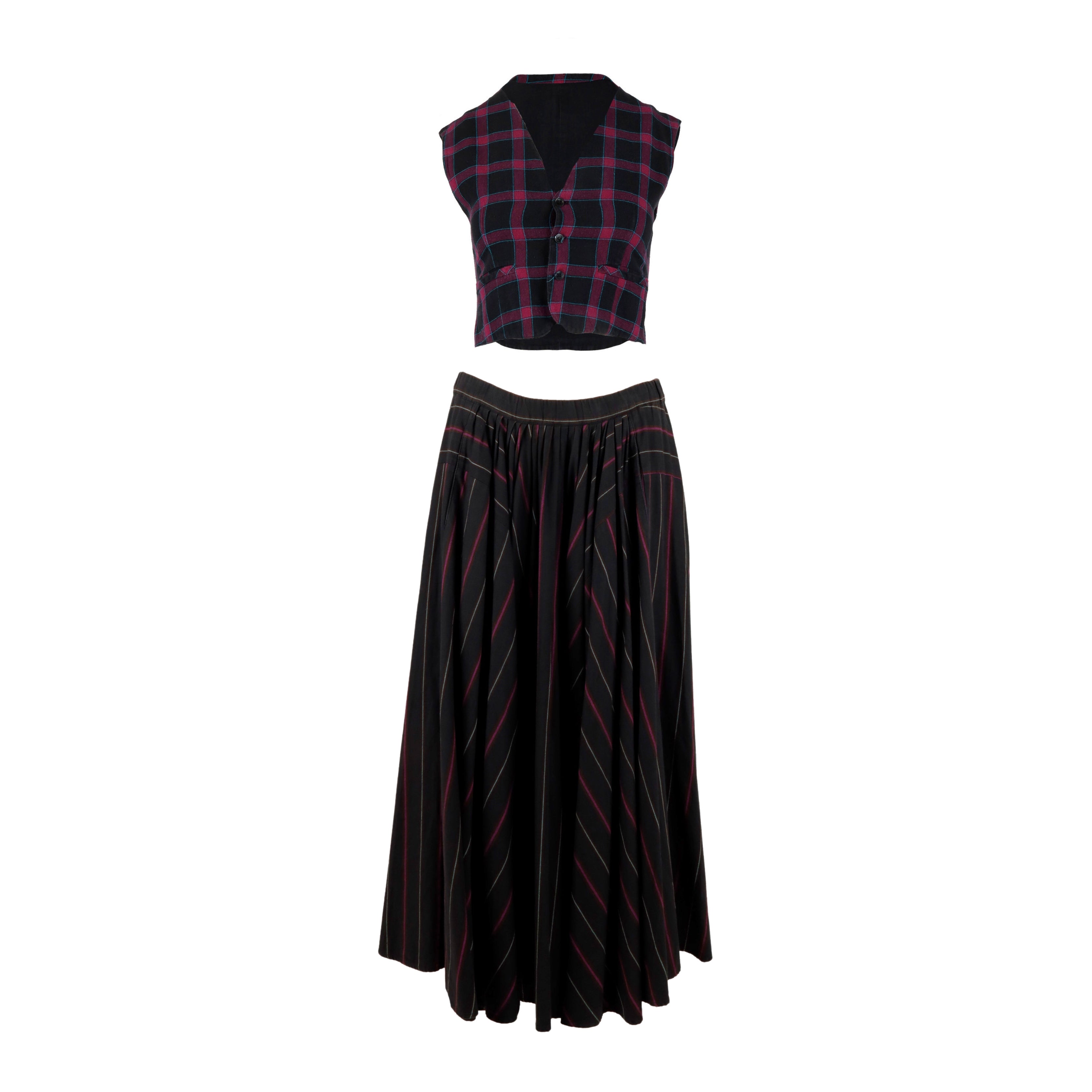 Discover the retro chic style of Jungle Jap by Kenzo with this vintage skirt and vest set from the 70s. Made of cotton, the v-neck vest boasts a checkered pattern while the long skirt features both horizontal and vertical stripes, creating a flattering and pleated silhouette. Designed by Kenzo for his initial line, Jungle Jap.