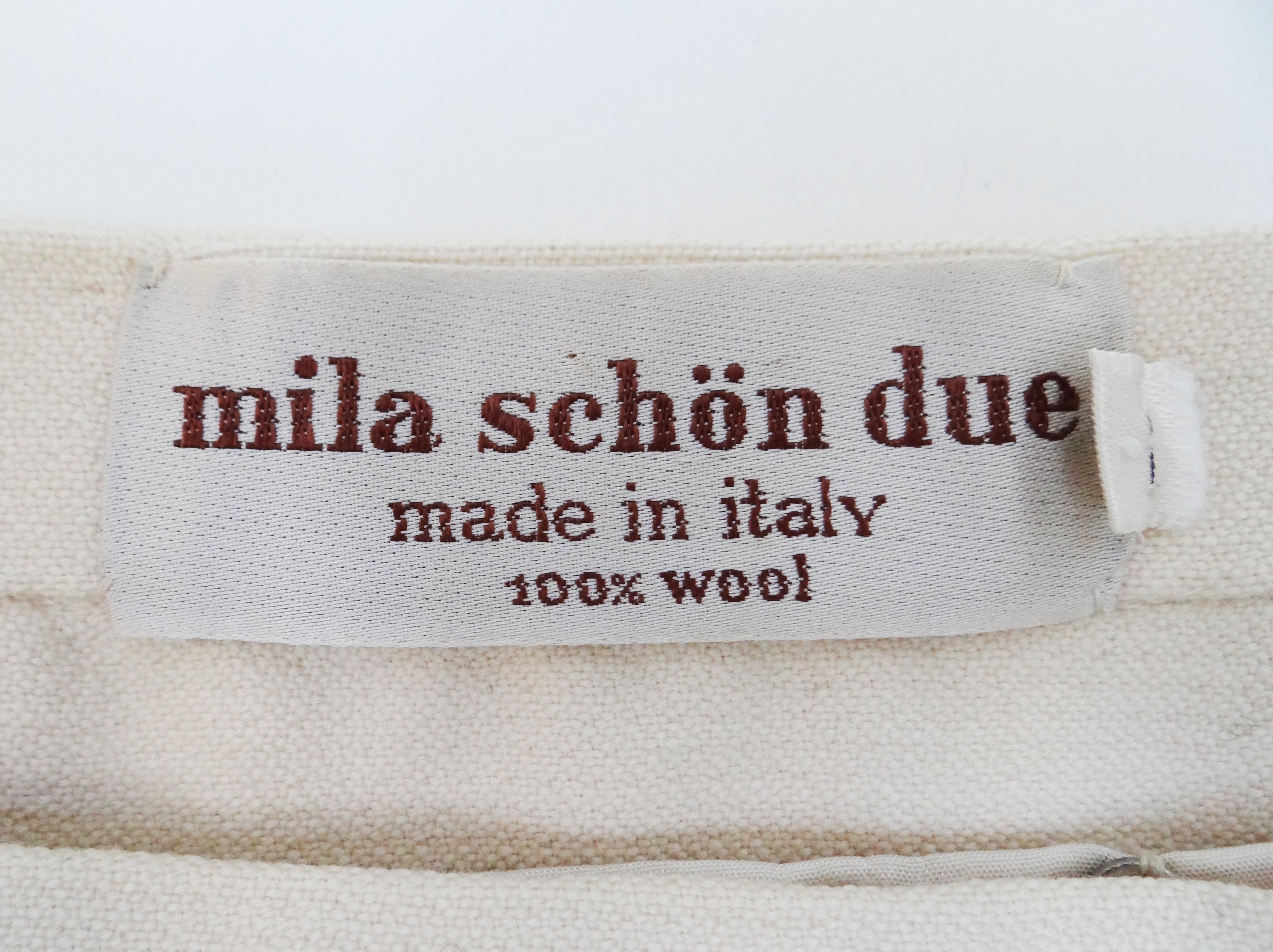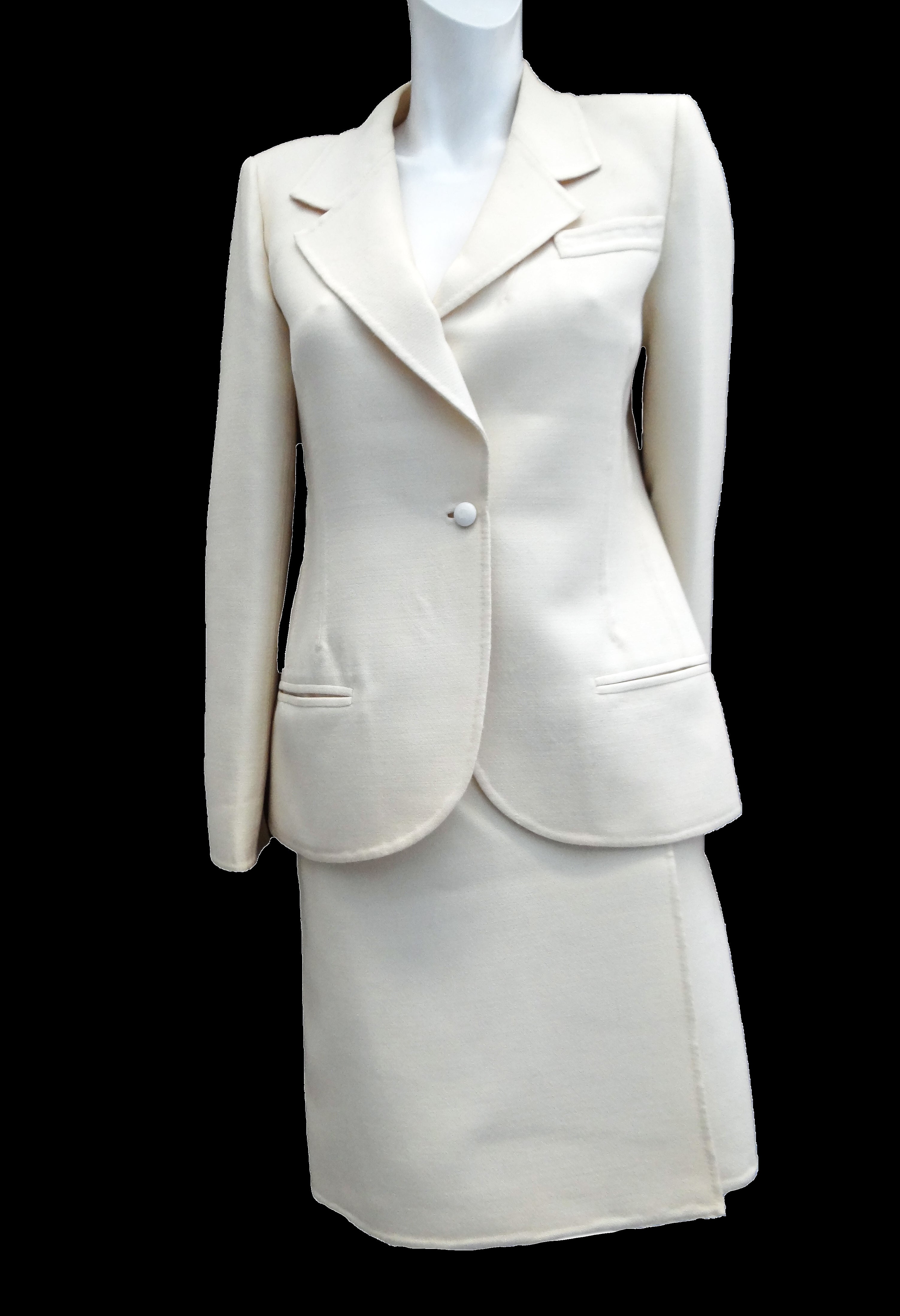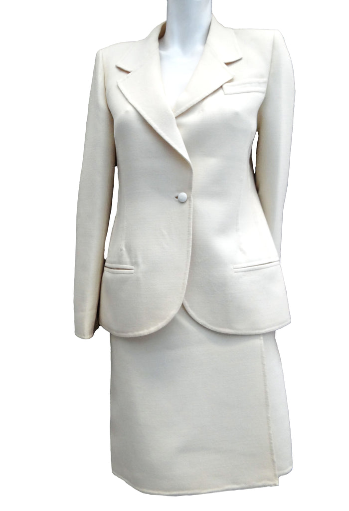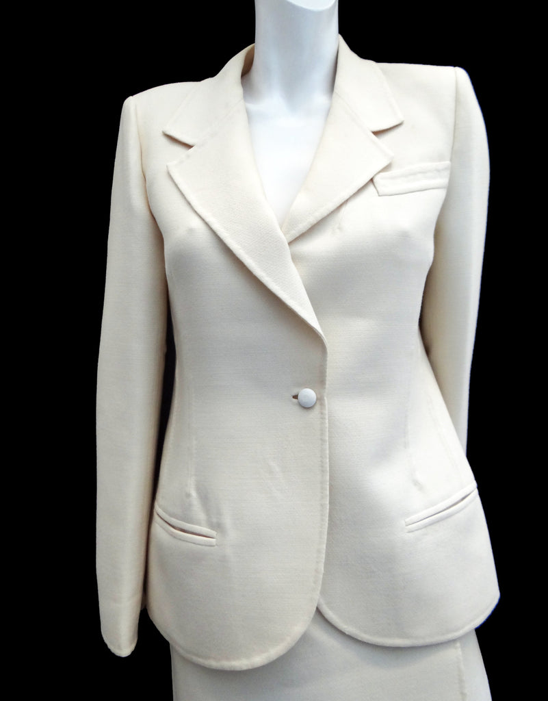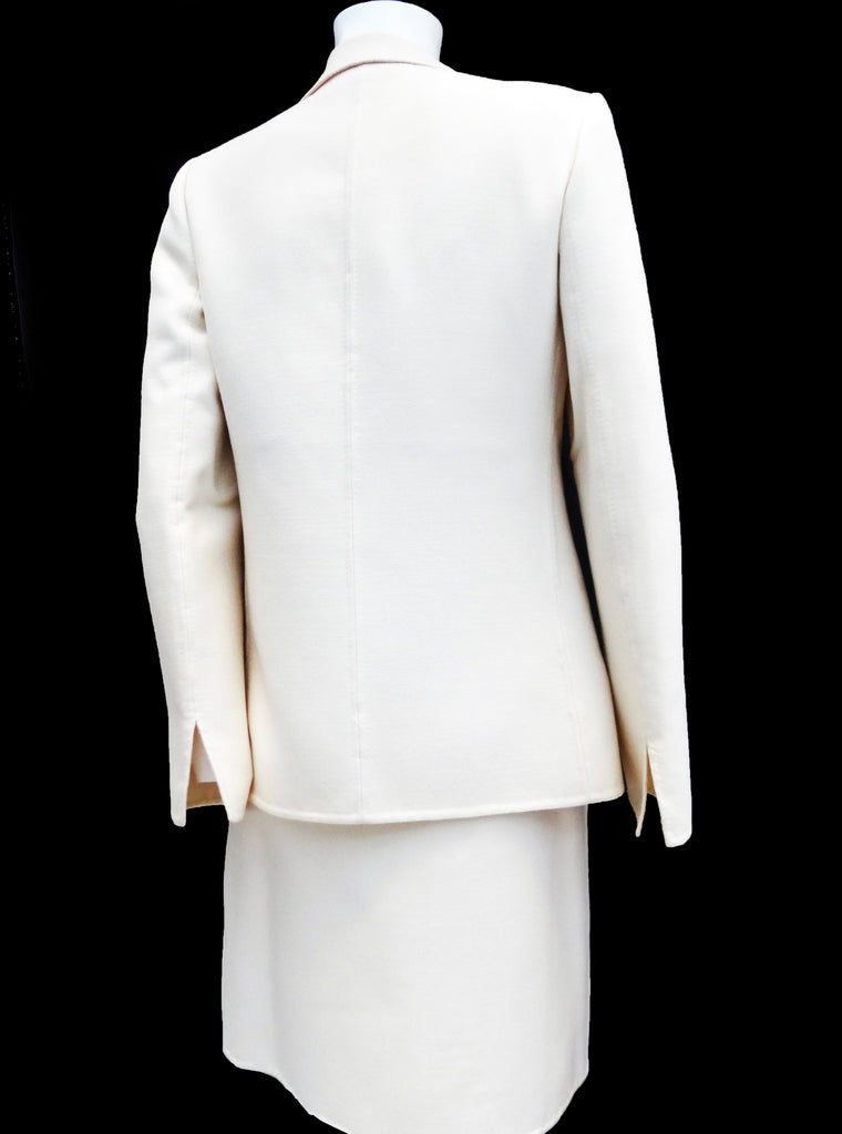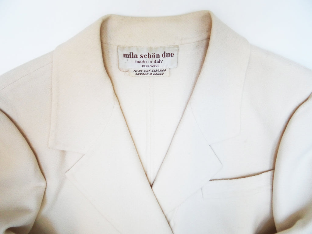 A classy tailored vintage skirt suit in cream wool, c.1990, made in Italy by designer Mila Schön, whose clients included Jackie Kennedy, her sister Lee Radziwill, and Marella Agnelli.  In fact this suit belonged to a former princess.