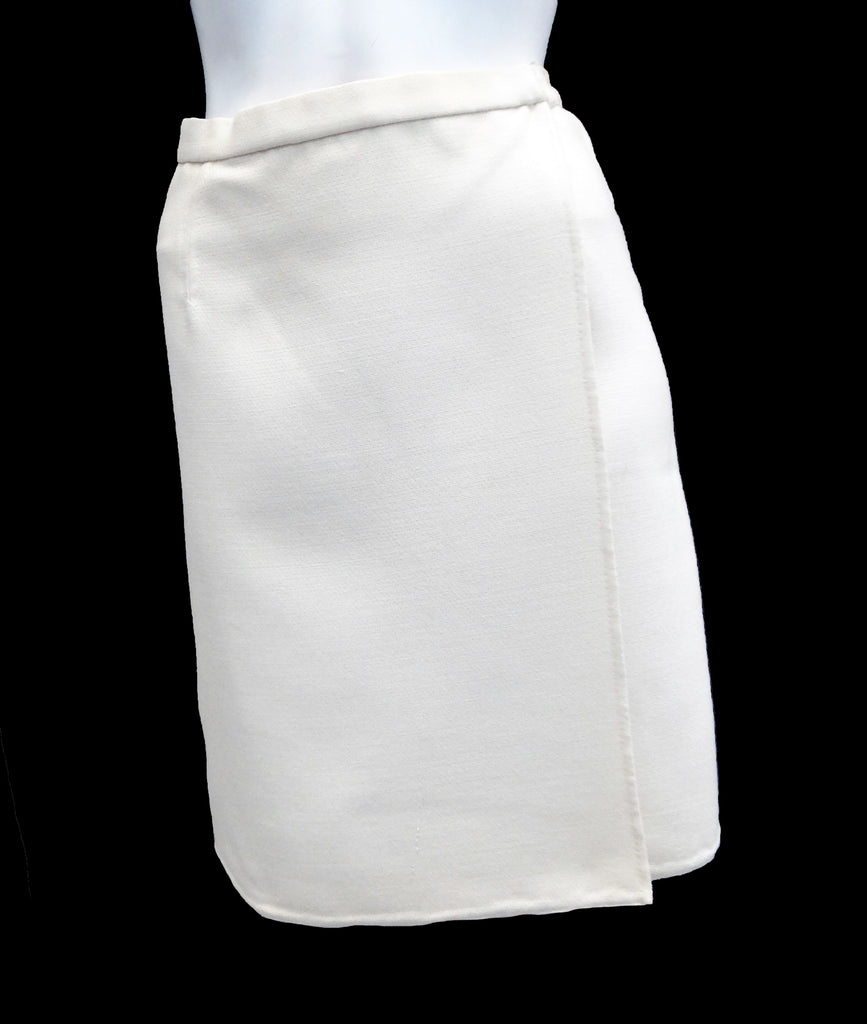 The suit has a straight, knee-length wrap skirt.  The jacket has notched lapels and a single button fastening.  Long sleeves with no cuff, slit opening.  Darted to give an impeccable shape, the jacket has slit front pockets and a single breast pocket.  Hand finished; unlined; gorgeous.