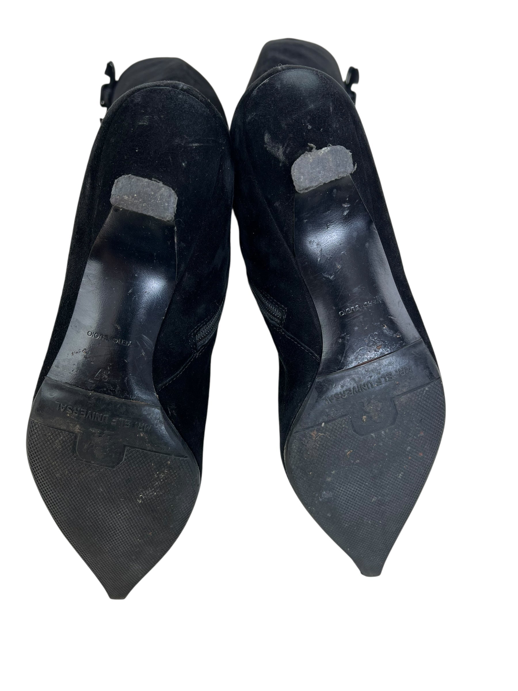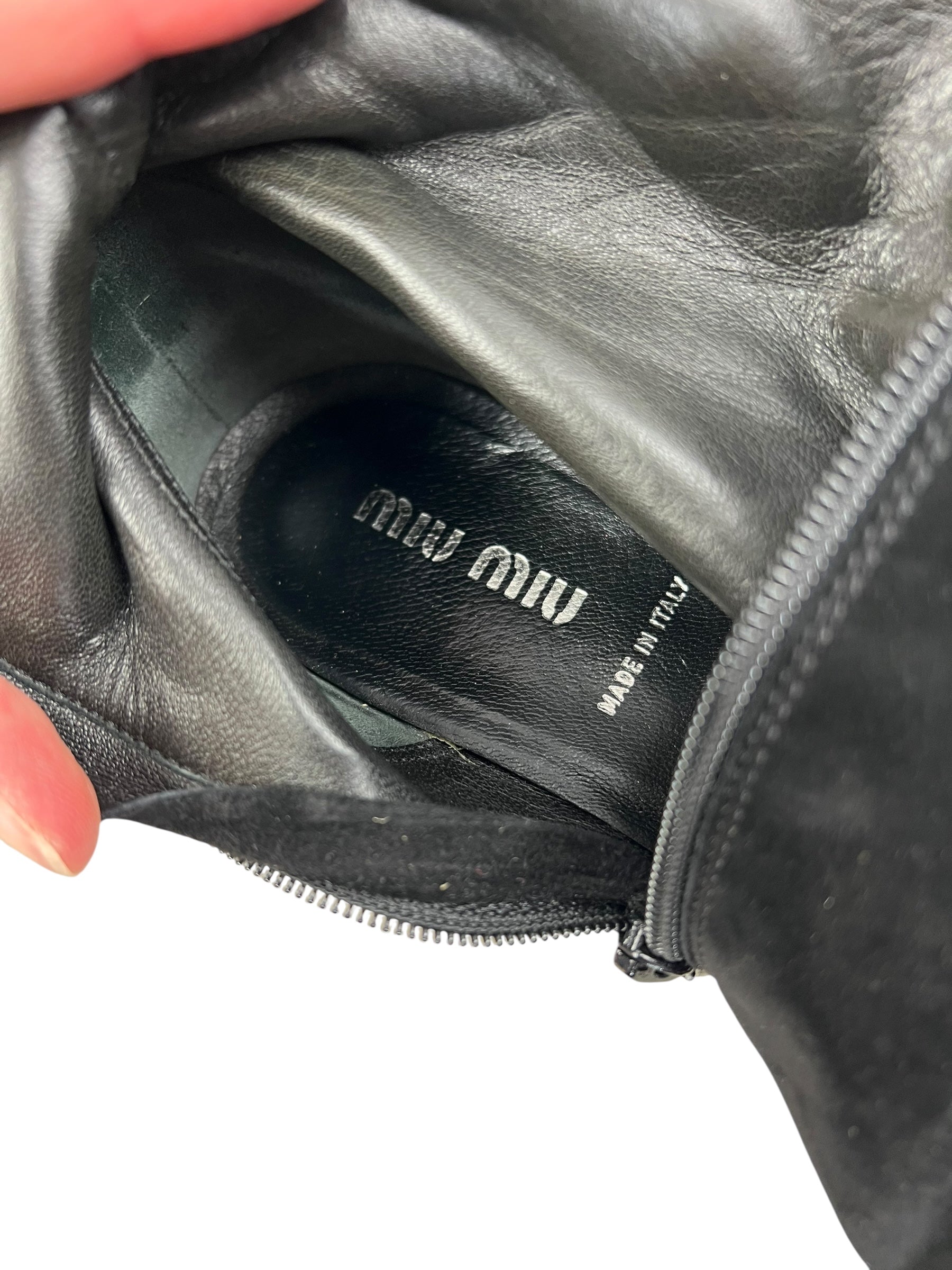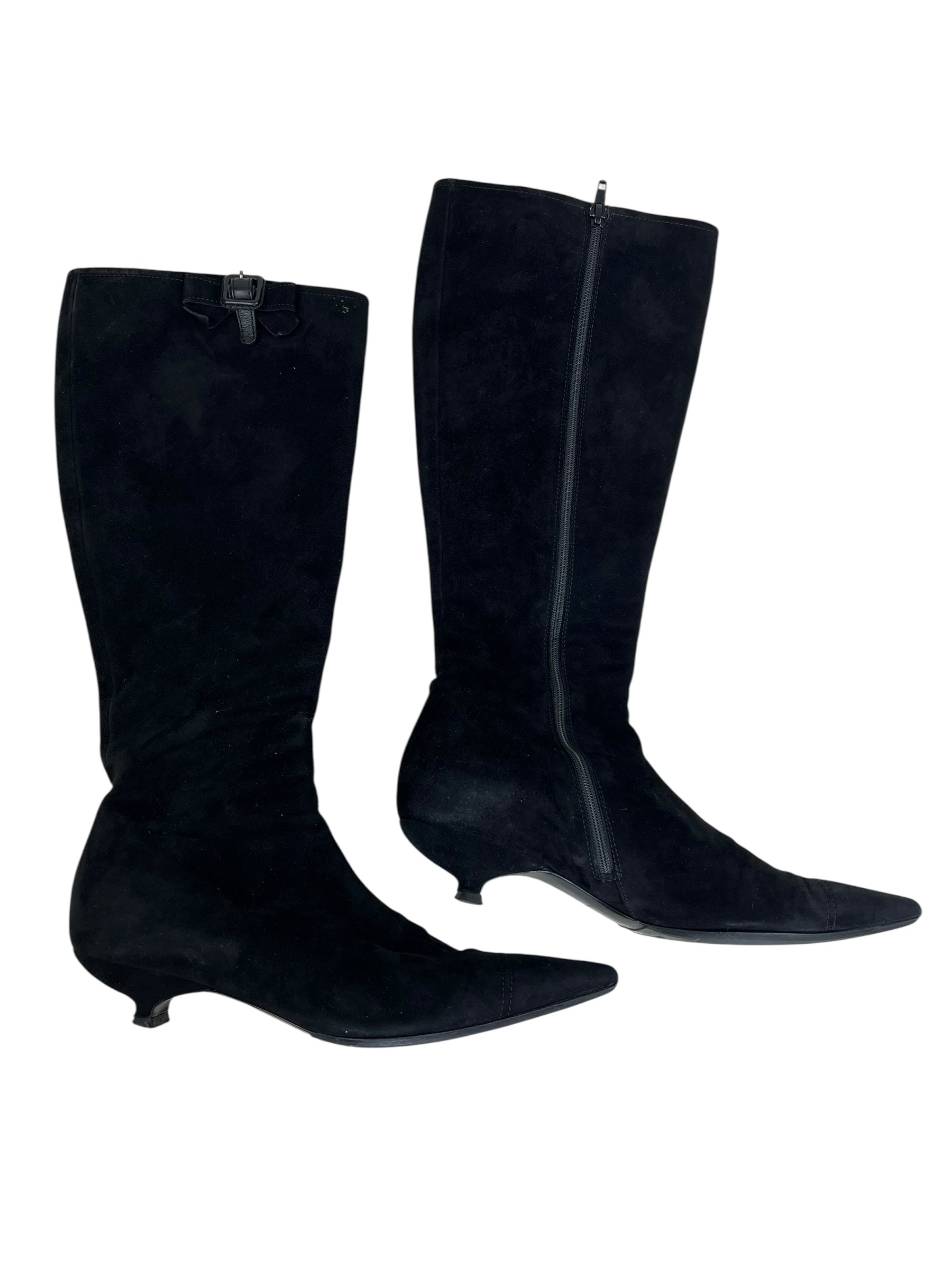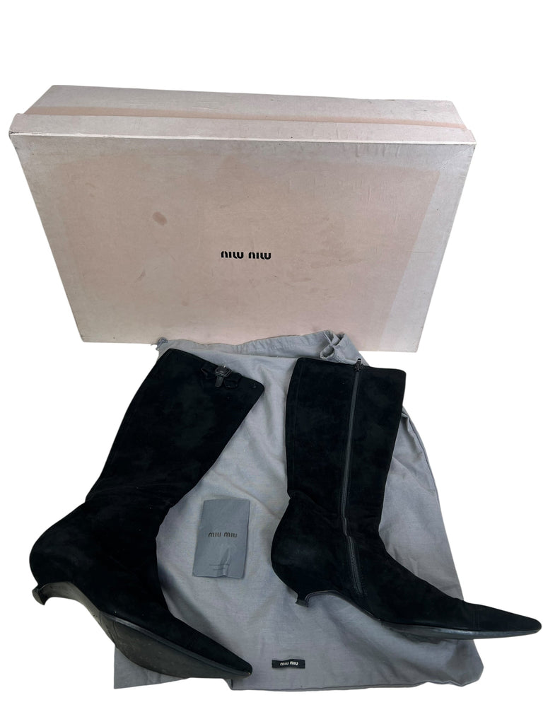 Miu Miu 2000s black suede kitten heel boots with buckled bow details. Size UK4 (EU37/ US6). All details below 👇