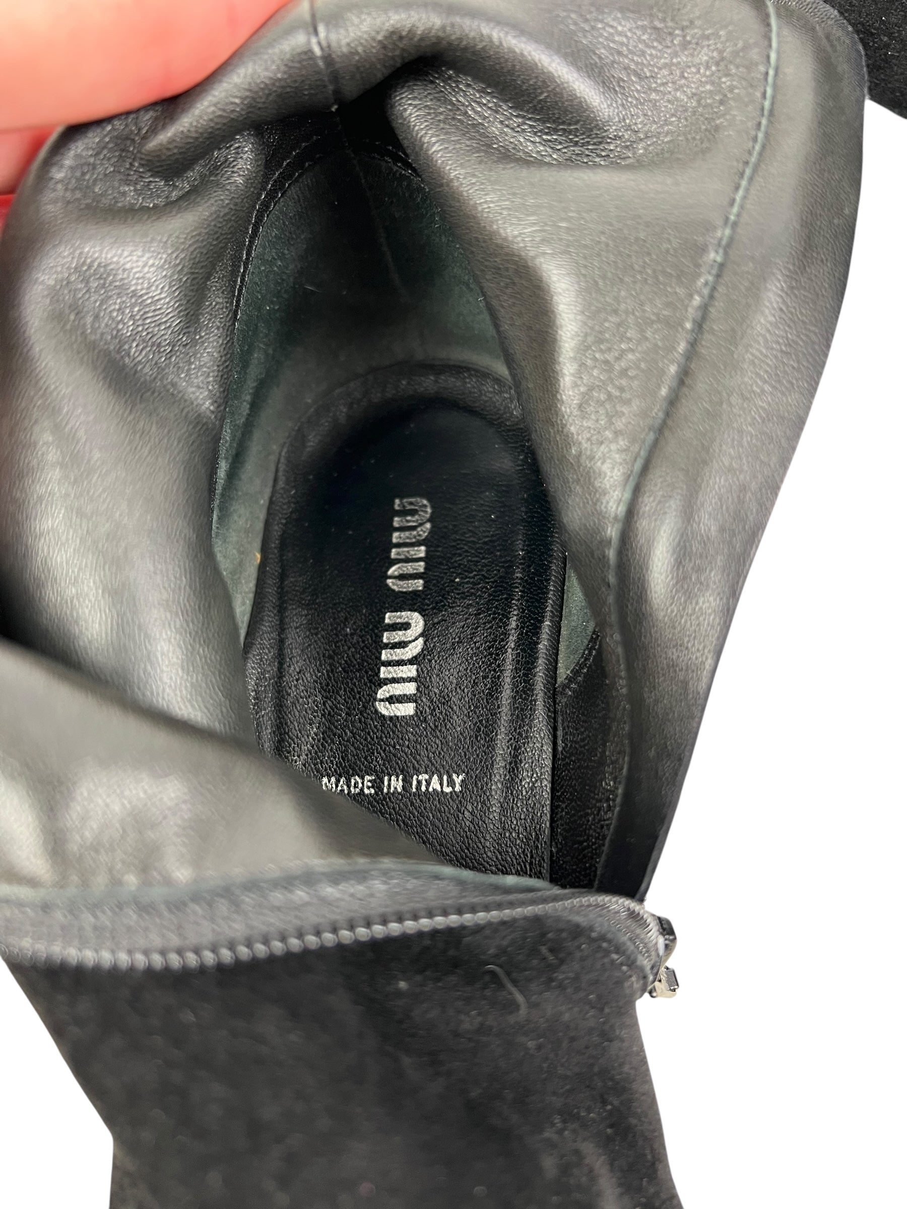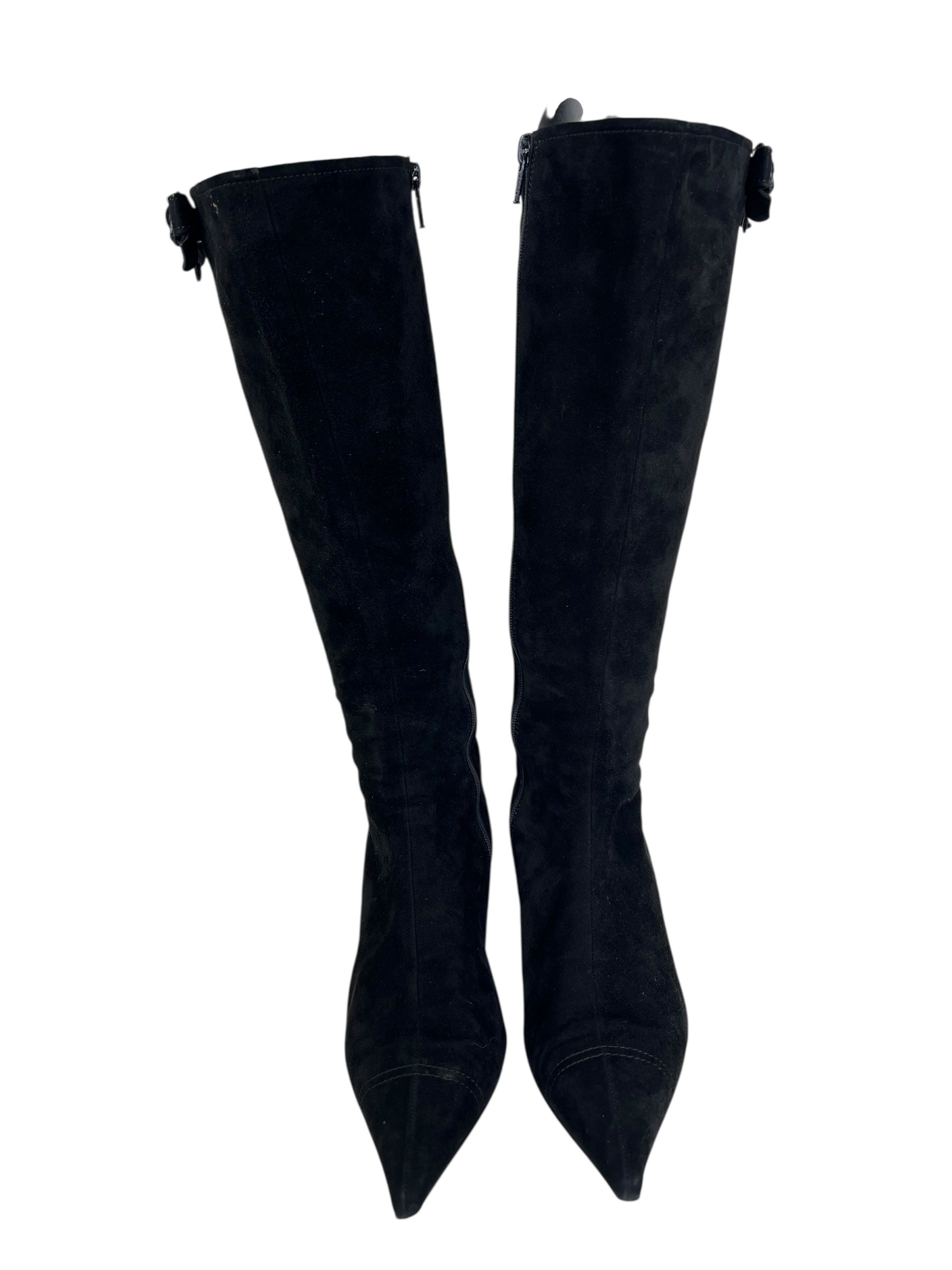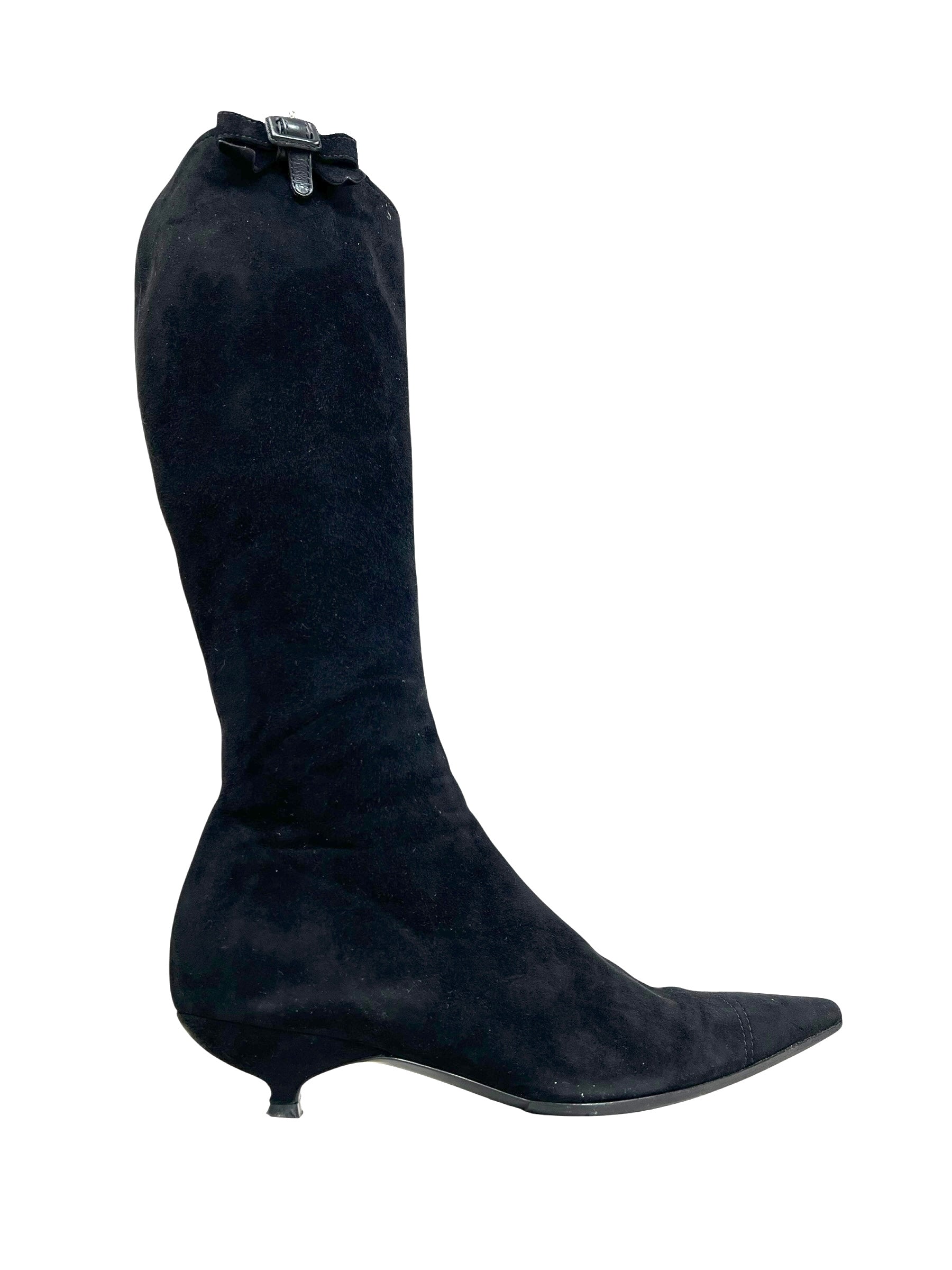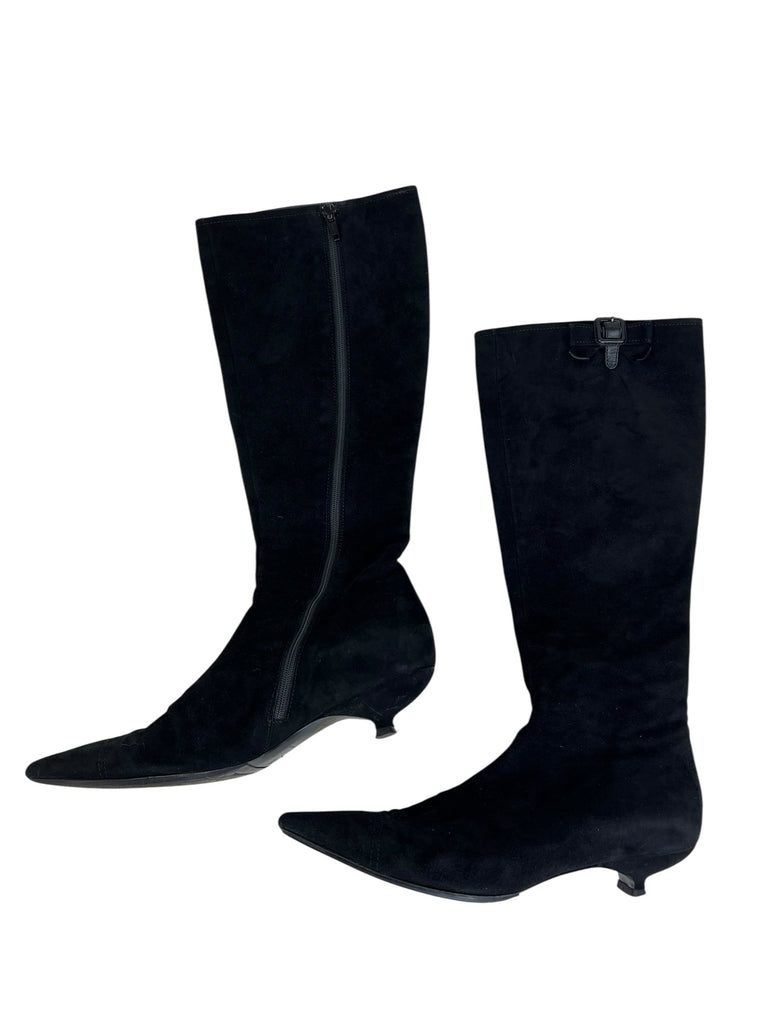 Miu Miu 2000s black suede kitten heel boots with buckled bow details. Size UK4 (EU37/ US6). All details below 👇