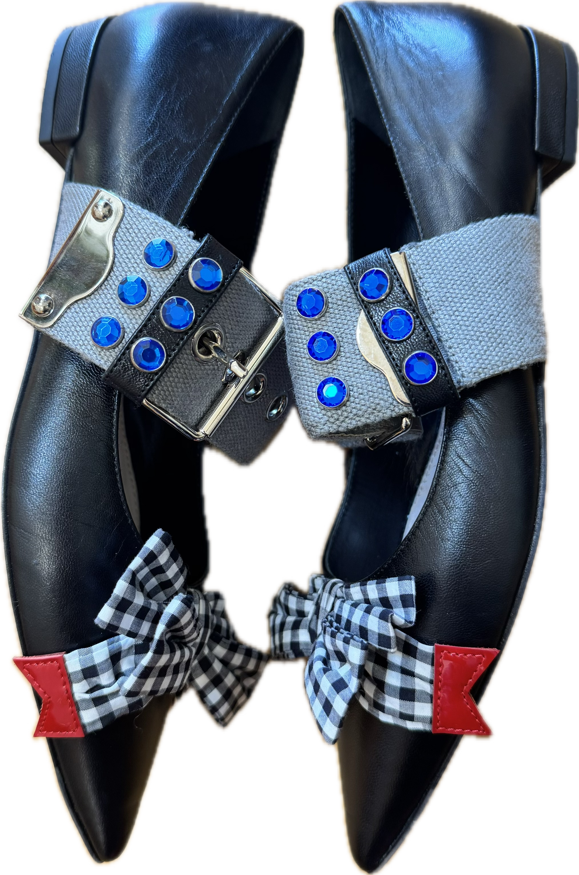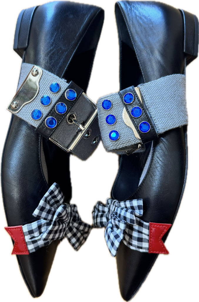 Straight from Miu Miu’s iconic Fall/Winter 2016 runway, these cult-favorite flats blend sweetness with subversion. Crafted in black leather with a sharply pointed toe, they feature oversized gingham bows, red leather flag tips, and thick canvas ankle straps decked out in silver grommets and electric blue rhinestones.