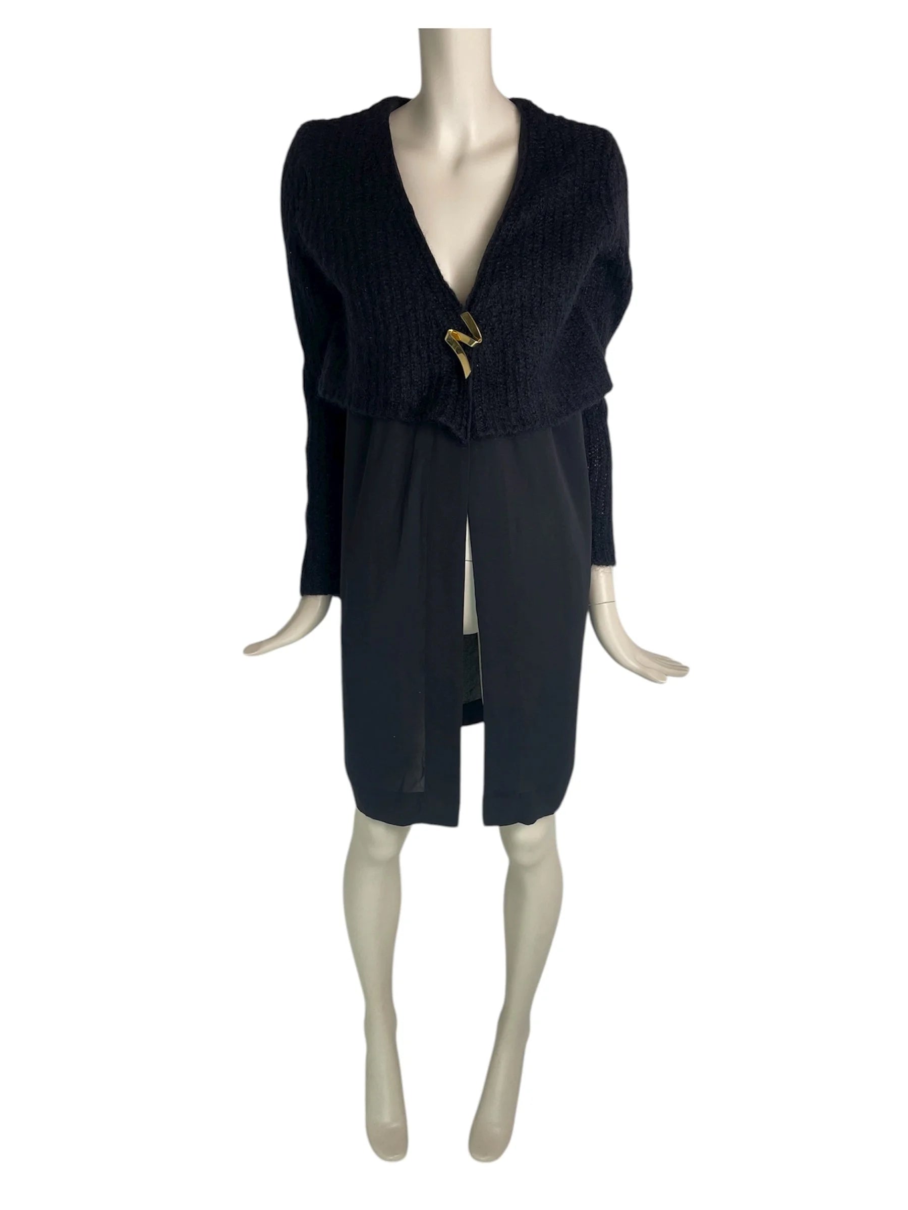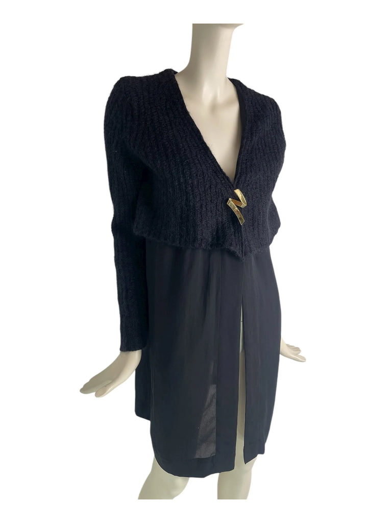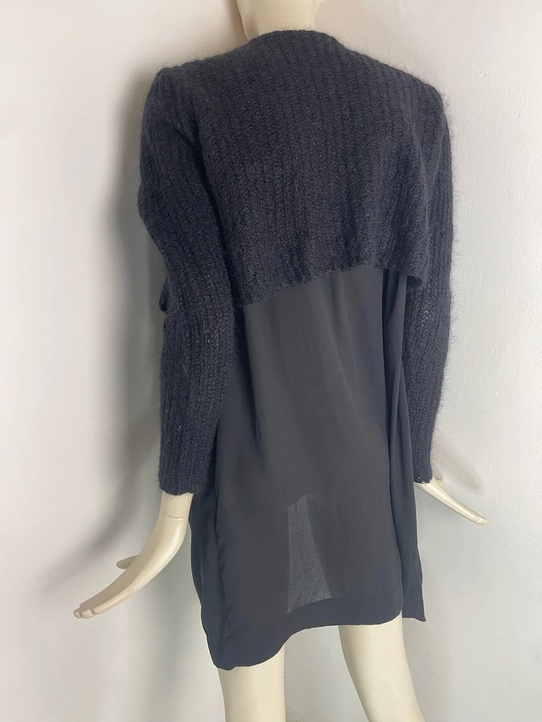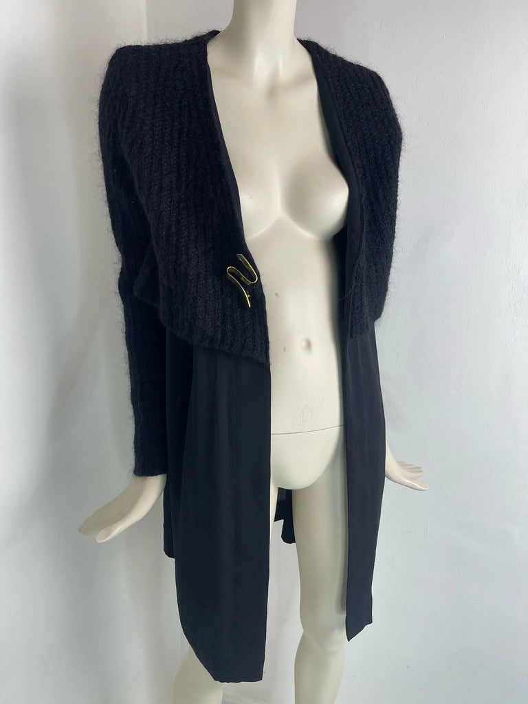 This unique cardigan combines cozy texture with elegant flow. The upper portion is crafted from a soft mohair knit, adding warmth and a touch of volume, while the lower section transitions into lightweight chiffon for graceful movement. The deep V-neckline is accented with a removable vintage-style gold brooch, offering a chic focal point and versatile styling option. Perfect for layering over dresses or sleek separates, this piece blends comfort, sophistication, and a hint of retro charm.