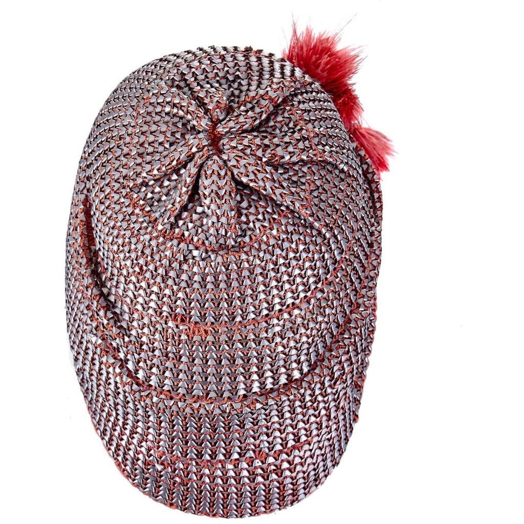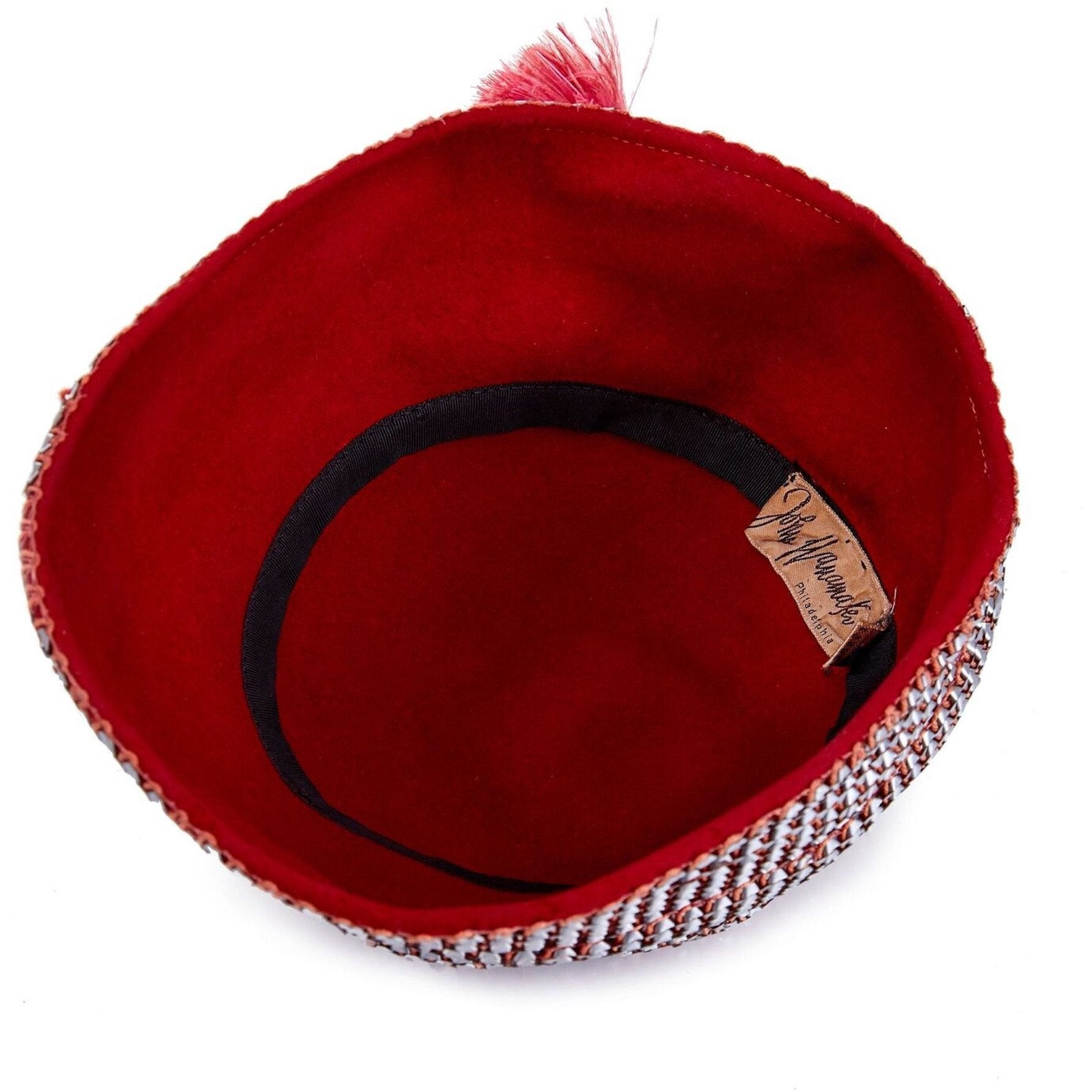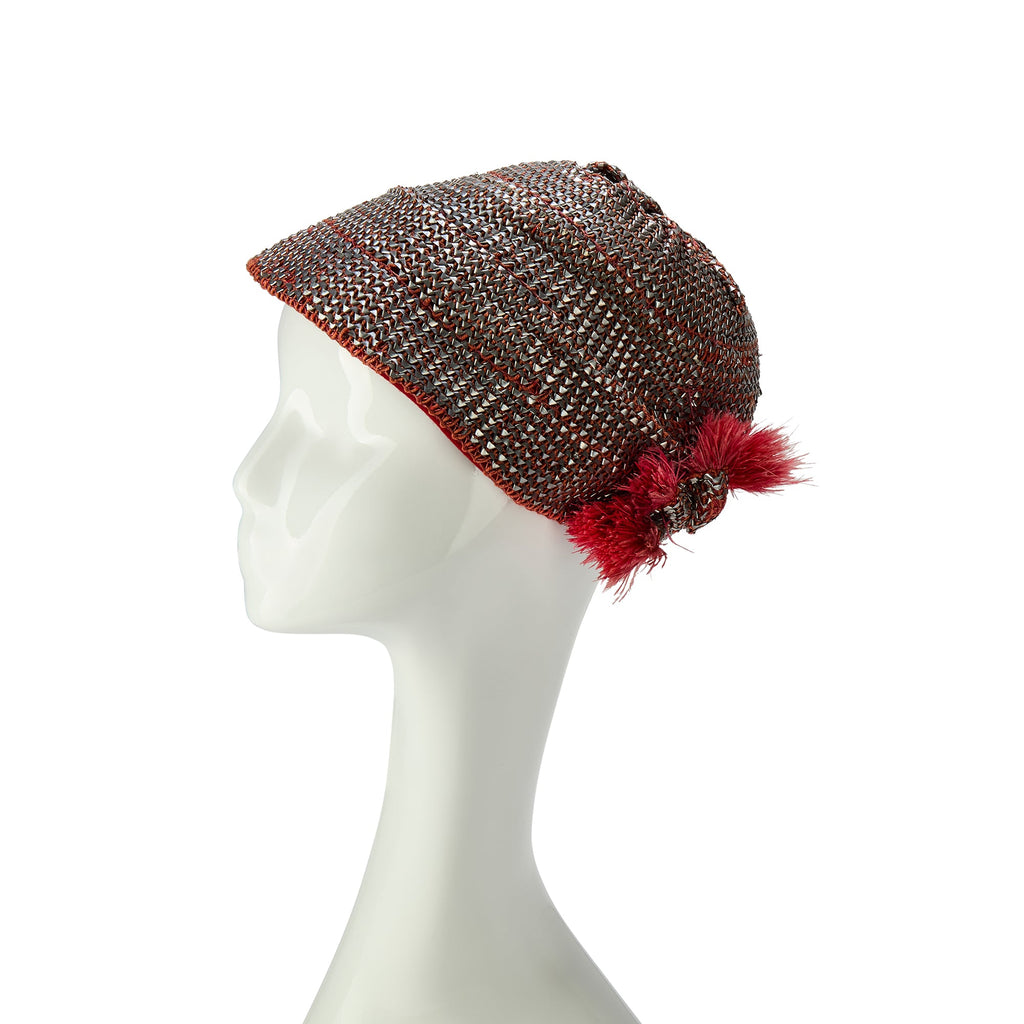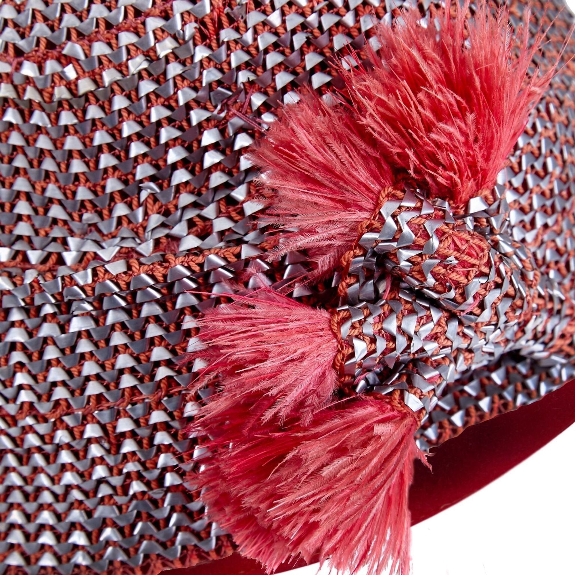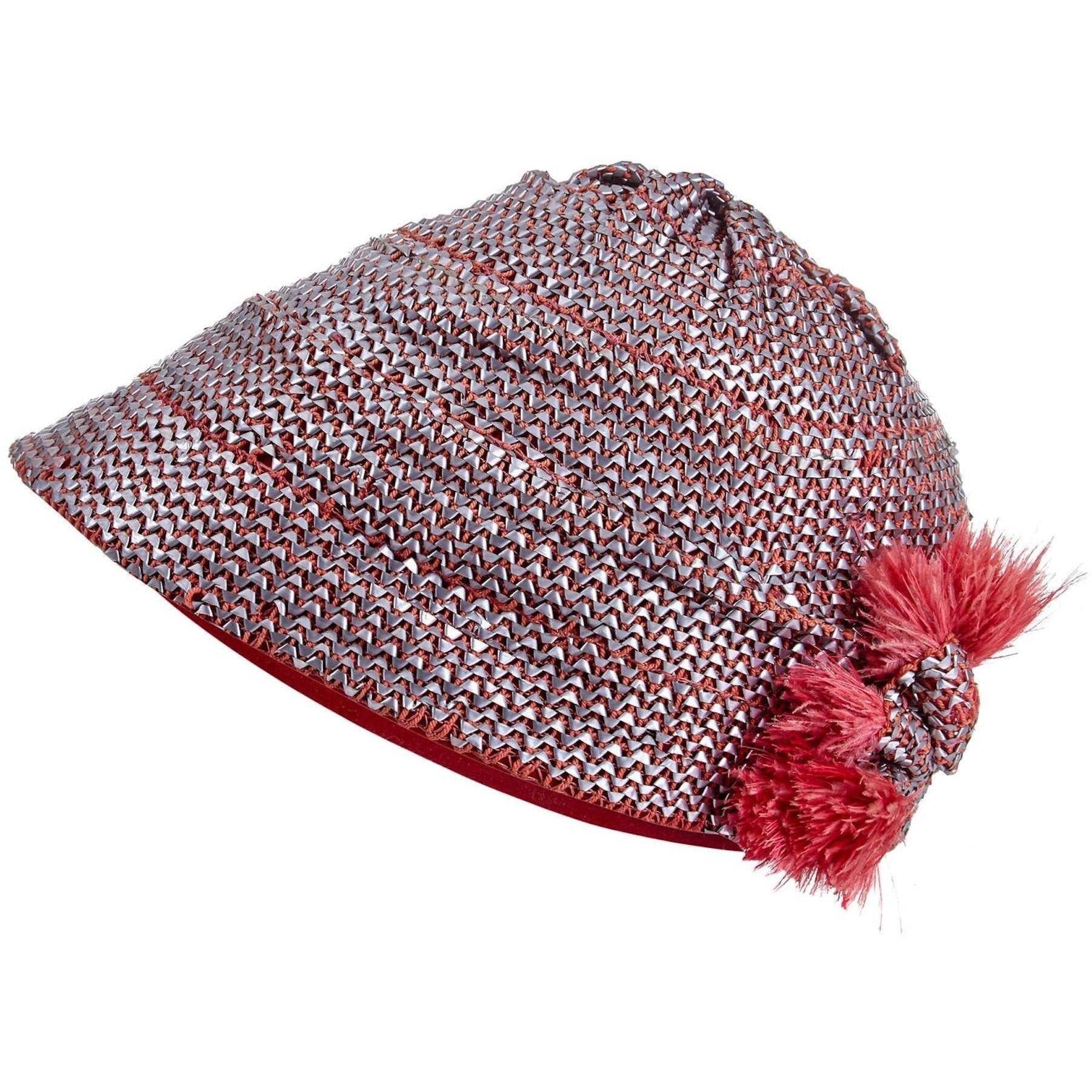 This exquisite 1920s flapper cloche hat with metallic raffia weave is in excellent vintage condition. The hat is molded in soft red felt, with a gross-grain band on in the interior so that the hat easily retains its position when worn. The exterior is an elaborately textured weave of coral cotton thread and gunmetal raffia sculpted to form stylish folds and culminates with a starburst arrangement at the crown. The reverse of the piece is beautifully embellished with a spray of fabric styled to look like thistles, with coral coloured feather trim to finish. The designer is unknown, however the label holds the signature of the famous John Wannamaker Department Store of Philadelphia which was synonymous with luxury during this era and considered one of the most beautiful store buildings in the world. Will fit the full range of female head sizes due to the soft flexible construction.