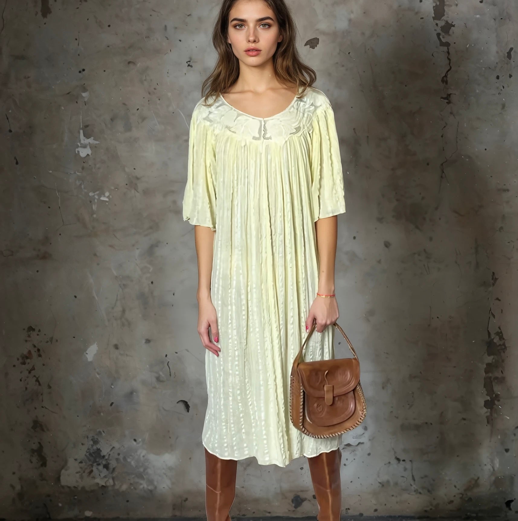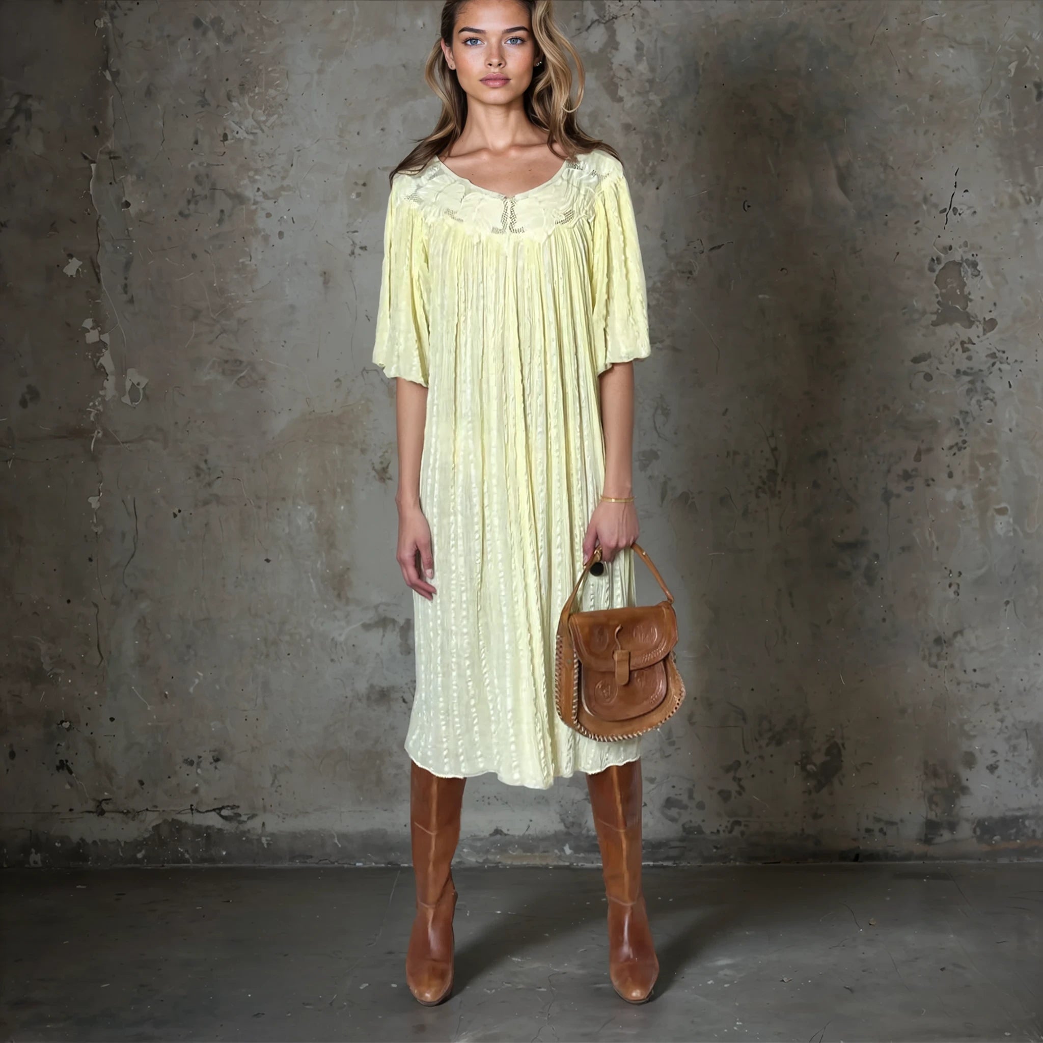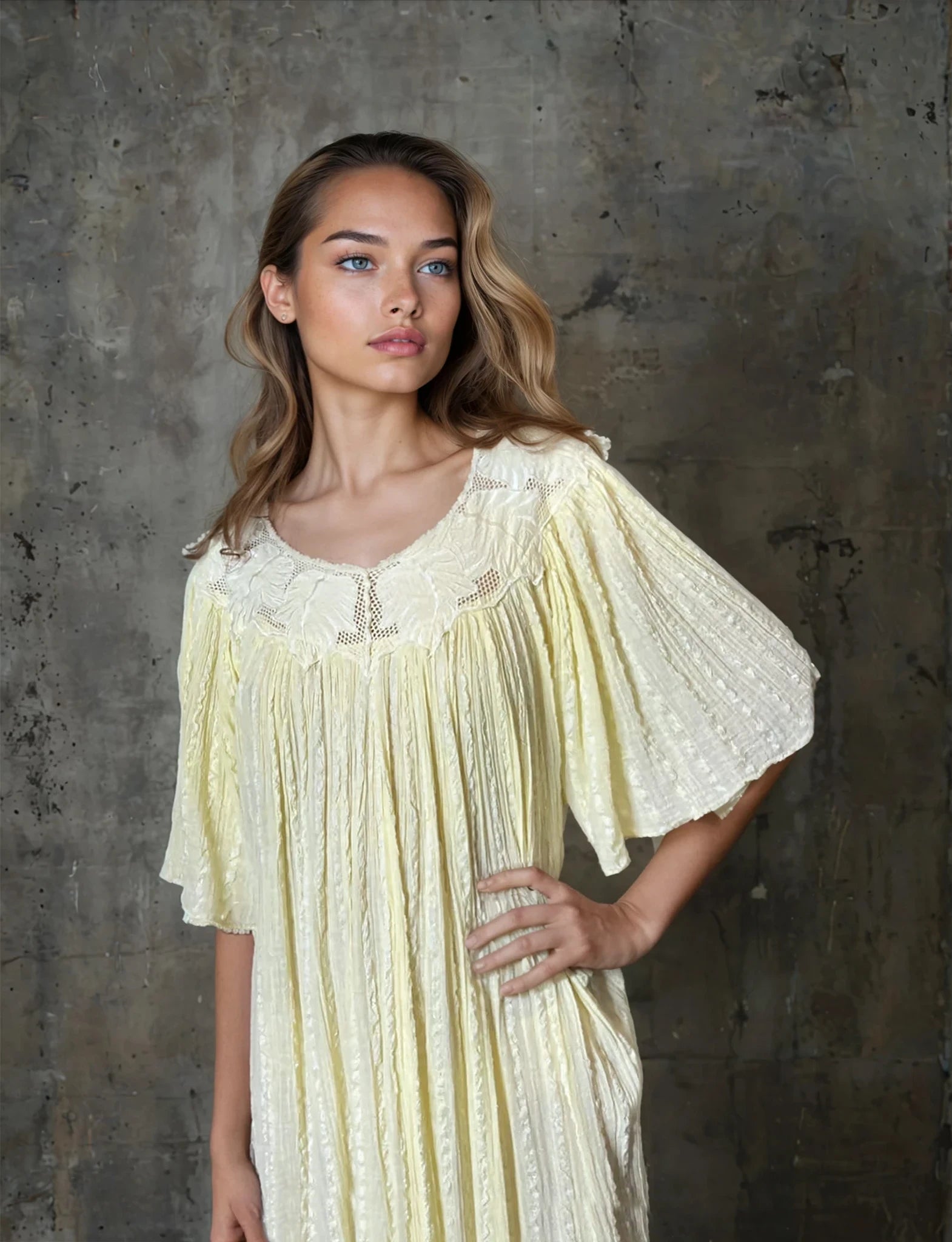 This Rare Original 1970's Vintage Cheesecloth Yellow Dress is in amazing condition for its age. With intricate leaf detailing around the top it truly is stunning. Due to its design it would fit a UK size 8 - 12 so please do check the measurements to avoid disappointment.