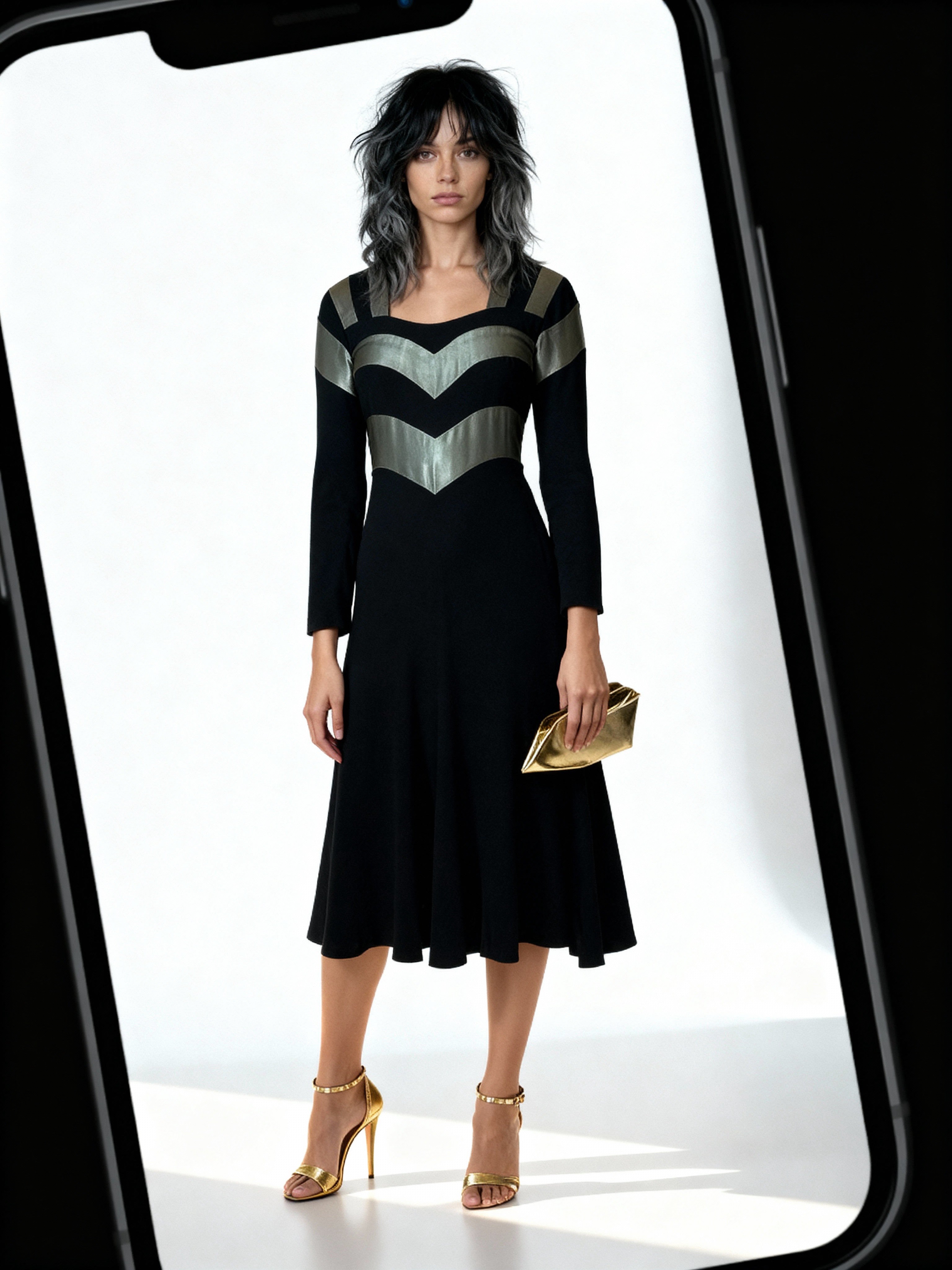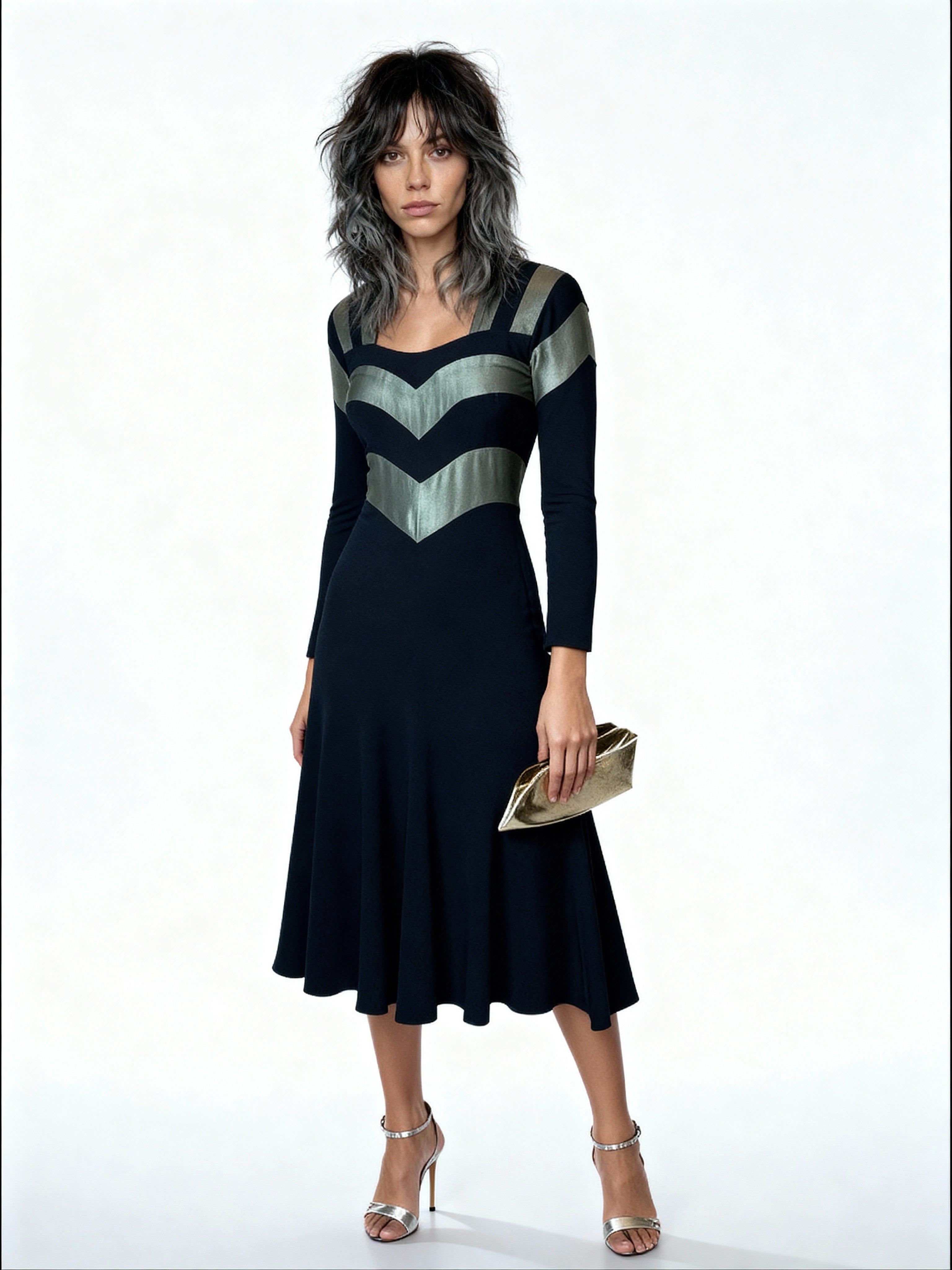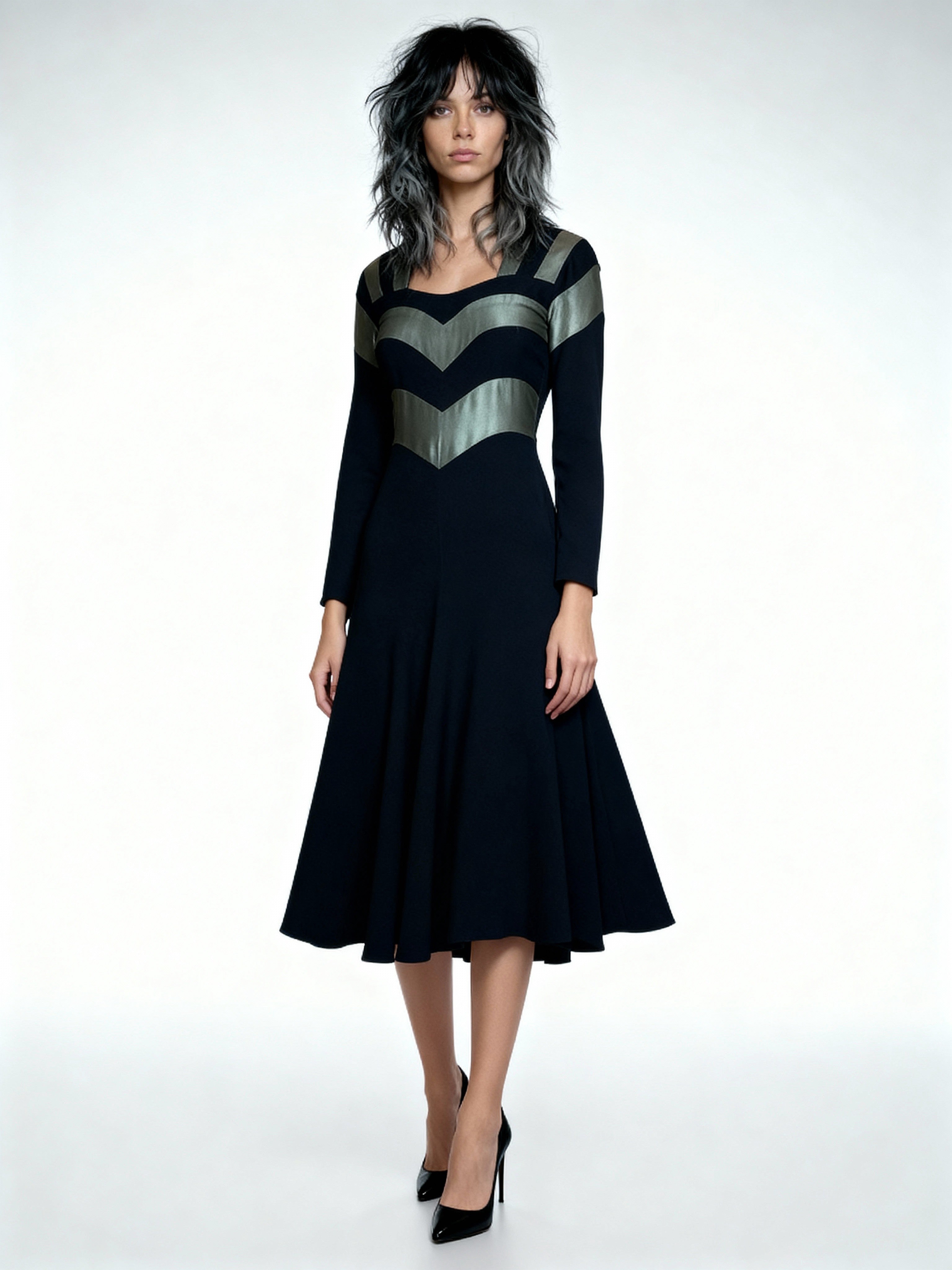 1970's Original Vintage Very Rare Ossie Clark Black & Metallic Green Dress UK 8 - 10