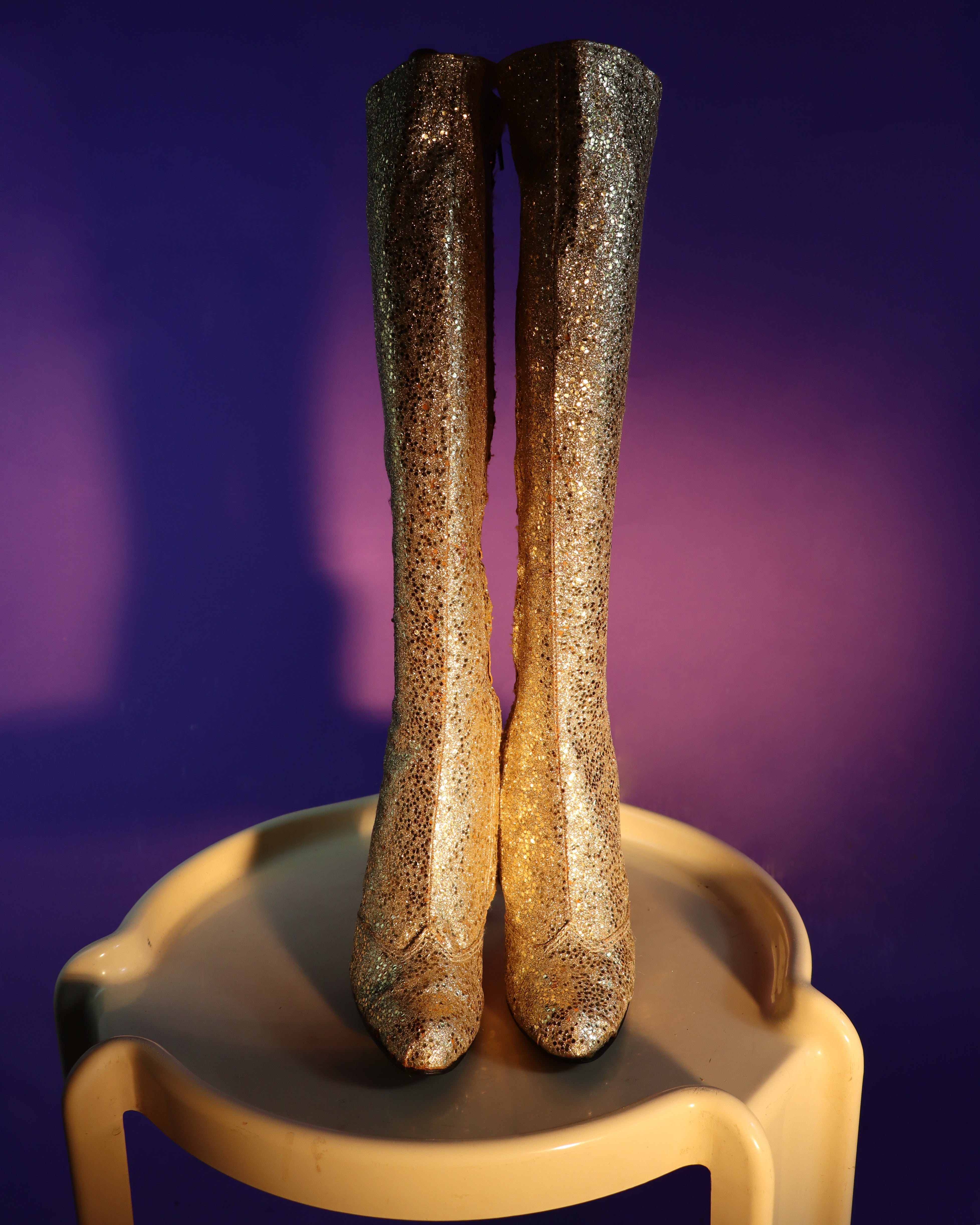 RARE truly spectacular vintage 1970s golden glitter boots. Covered in different sized glitters - the disco ball sparkle effect under the lights is totally mesmerising! Beautifully crafted- featuring self covered block heel, sleek pointed toe, slanted knee high length, heavyweight zipper. A very special pair of boots.