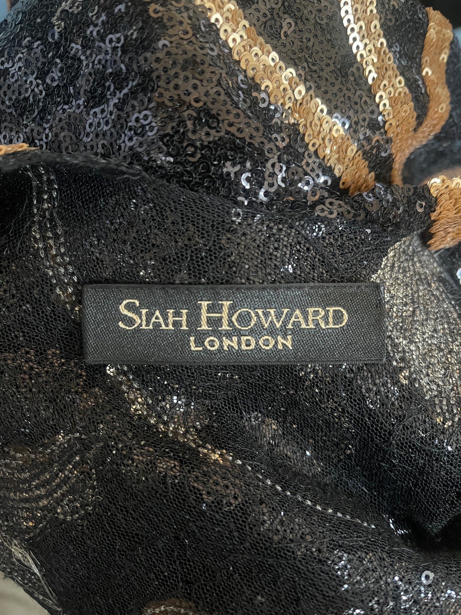 Siah Howard is a haute couture fashion label established in London in 2017. An eveningwear and wedding dress specialist, Howard’s fantastical designs are elaborate, elevated and otherworldly. This incredible couture-crafted ensemble was created as part of the designer’s whimsical ‘Le Femme’ collection and the fabric featured prominently throughout. The bodysuit was worn by actor Georgia Mayfoote in the 2019 short film Queen of Diamonds. Decadently embellished, the set is composed of bodysuit and full-length cover-up. The sleeveless bodysuit is crafted from a sheer pale blush pink mesh with a rounded neckline and raw hems at the shoulders and neck. It fastens down the back with a tonal zip. The bodysuit is detailed with appliqué florals. Formed from glistening sequins in rose gold and black, the flowering vines climb up the front and back of the bodysuit, somewhat preserving the wearer’s modesty. Below the waistband, black sequins form an opaque background to the florals and cover the body entirely. At the side of the waist, the rose gold vine appliqués hang from the body, rippling with movement, as though they are growing around the body. The bodysuit is lined with black satin from the waist down.