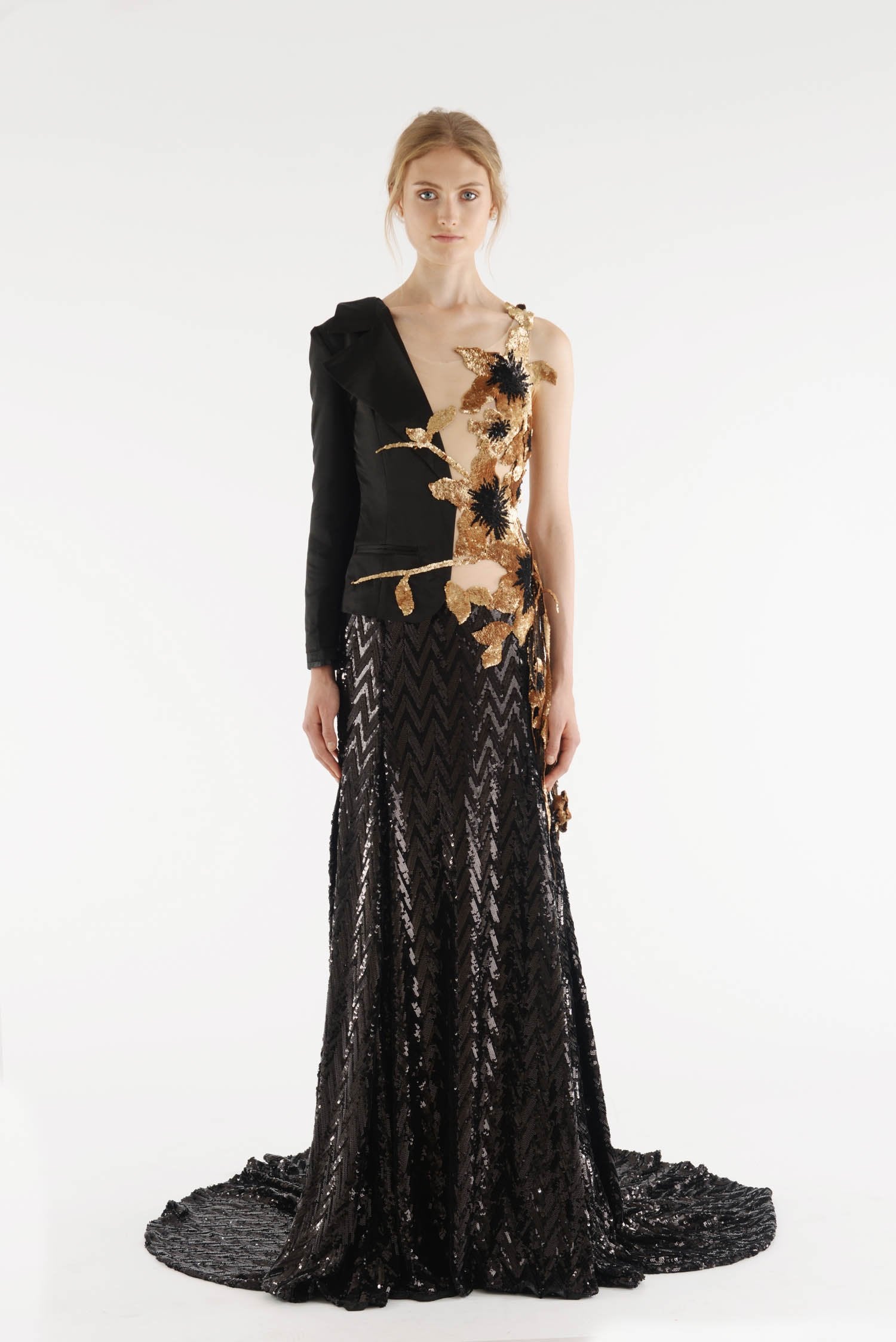 The decadent, coordinating cover-up is cut extremely generously. It has very wide batwing sleeves and hangs open at the front, cascading like a waterfall down and around the body. The raw-hemmed fabric is incredibly detailed; a black sequin background covered in rose gold sequin florals with intricate black detailing. The cover-up is very long, meaning that it flows out behind the wearer as a long, theatrical train, puddling on the floor around the wearer. It is unlined. It has no fastenings.