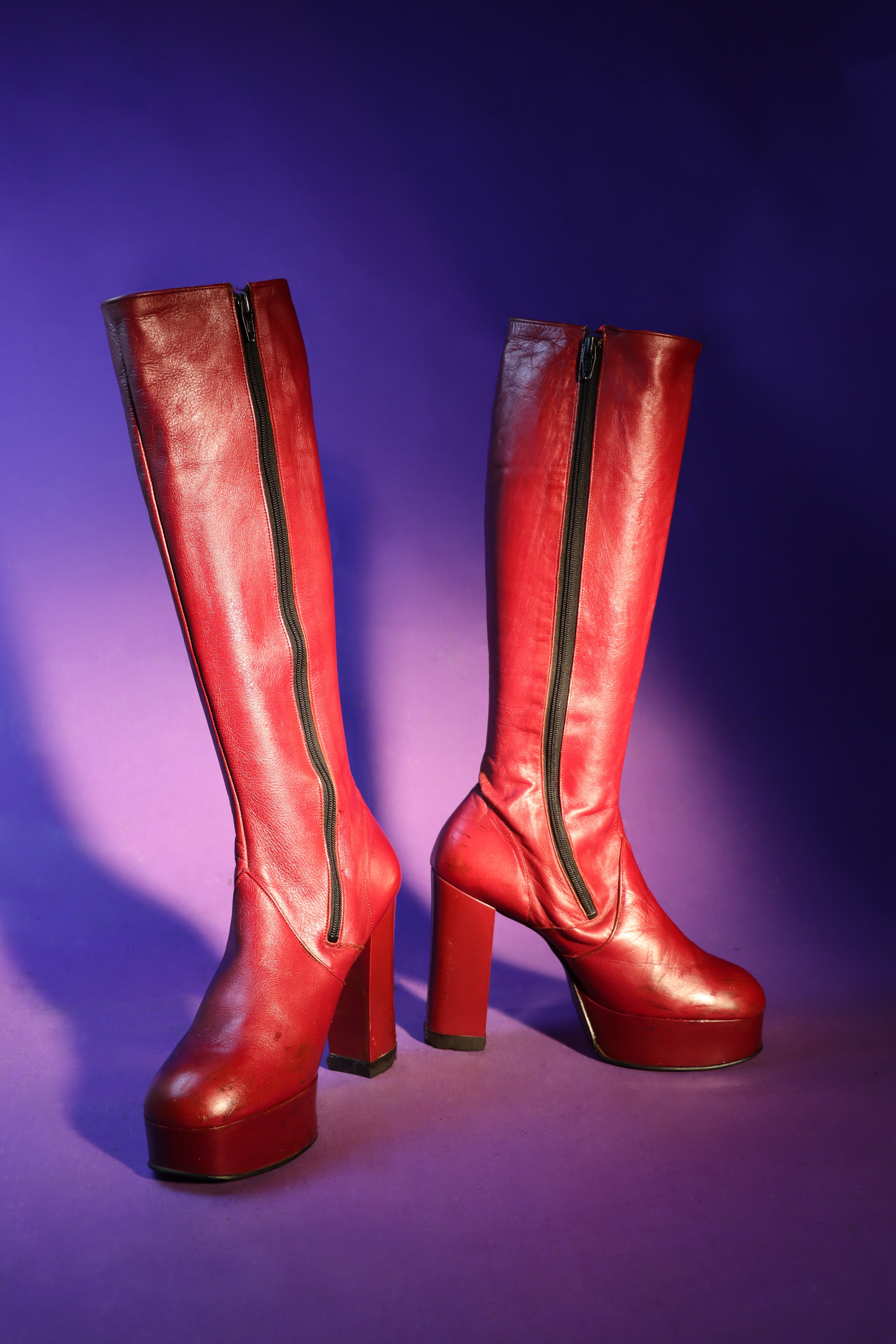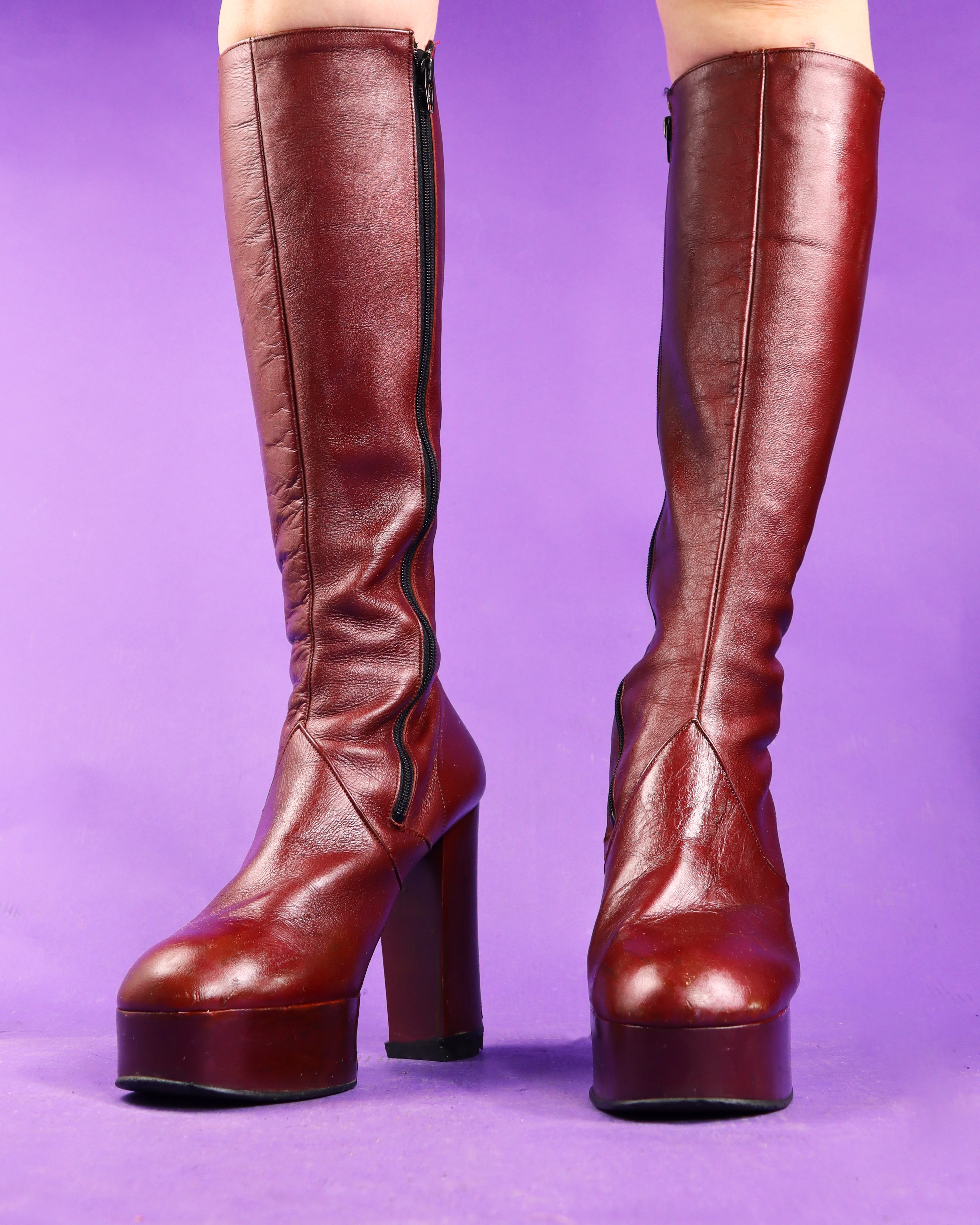 Absolutely stunning vintage 1970s leather knee high stacks by The Bootery. These platform boots are made from a high-shine dark red / burgundy leather and feature a *mega* platform and heel with a tight calf. Incredible, near unworn condition and just the ultimate 70s boot shape.