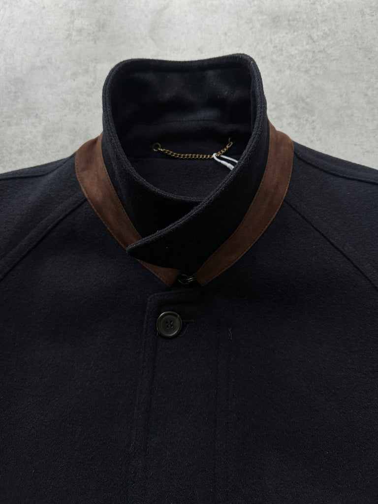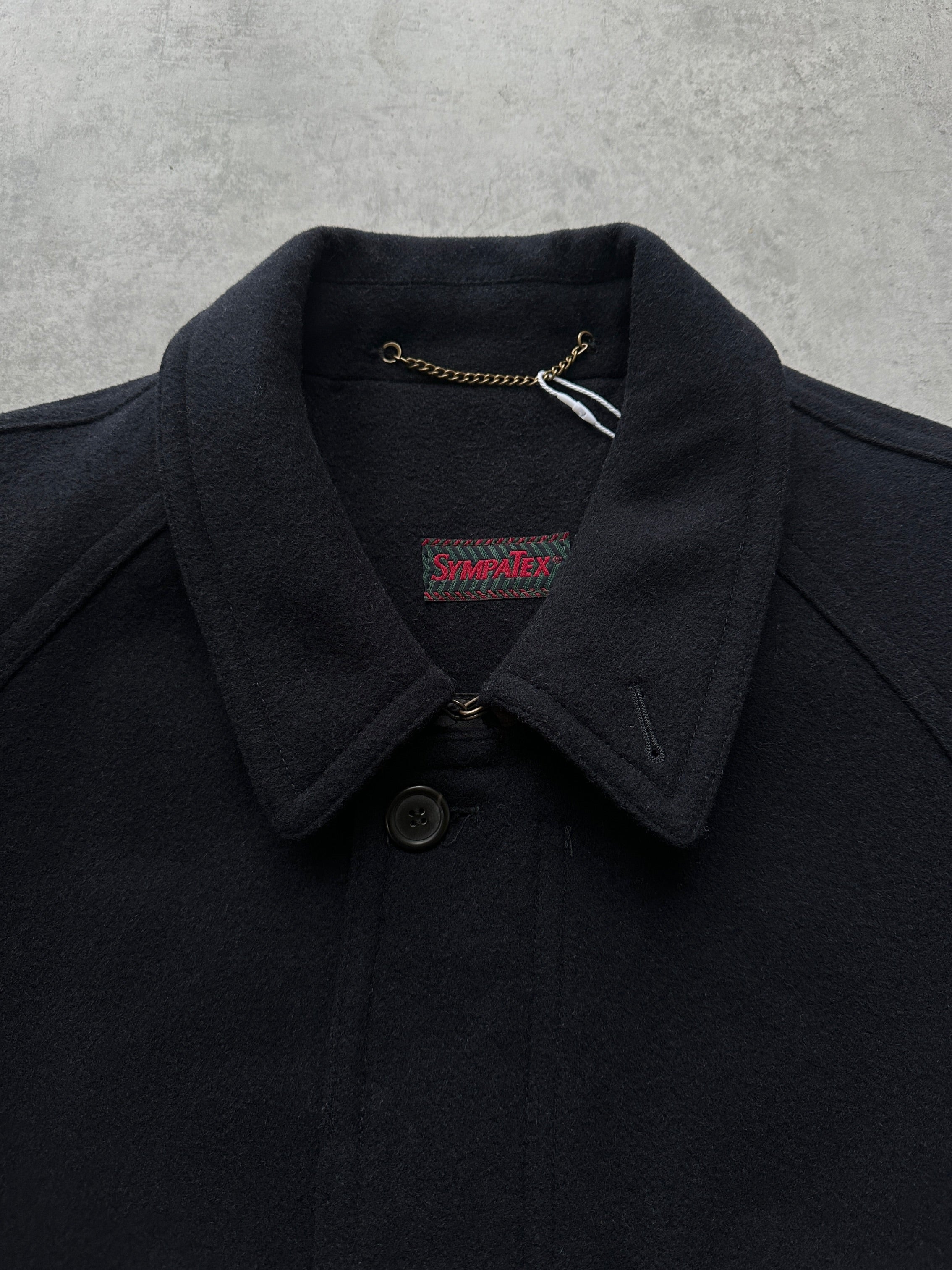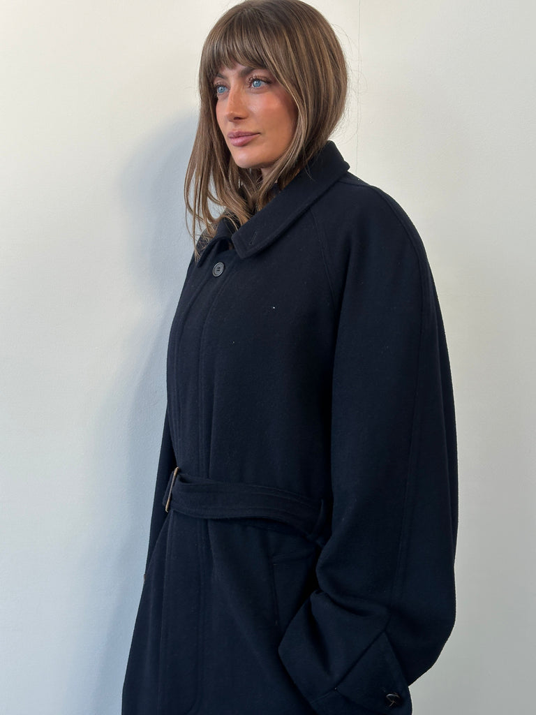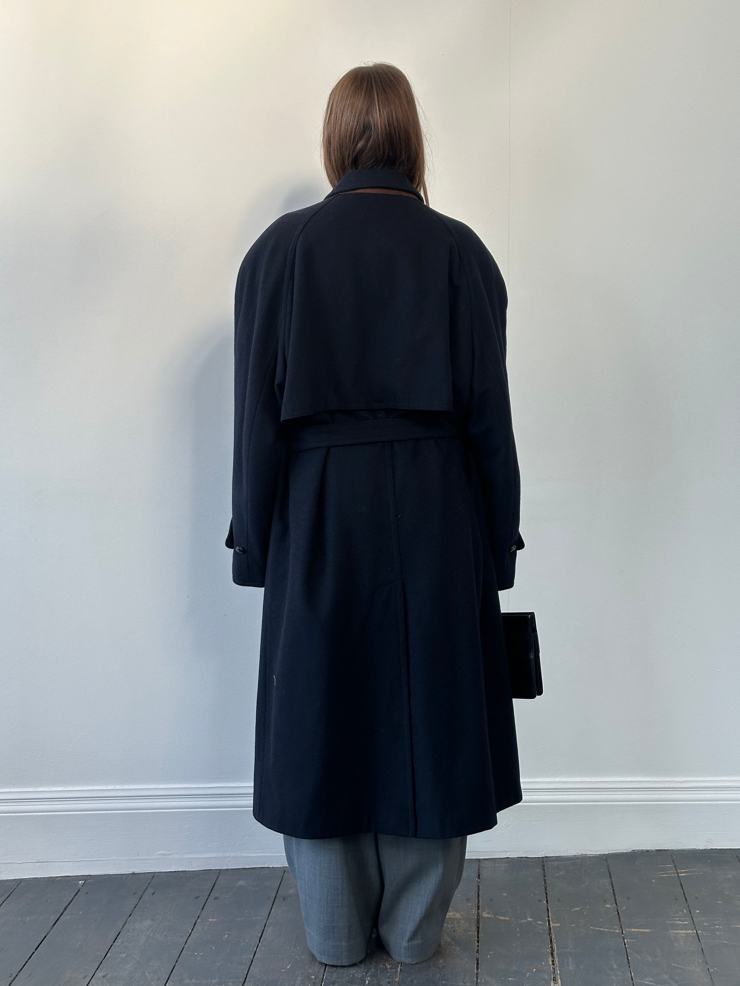 Vintage 1980s navy concealed-placket wool coat with a belted waist, high neck fastening hook and a long clean silhouette. Features SympaTex climate-membrane lining for added structure and comfort.