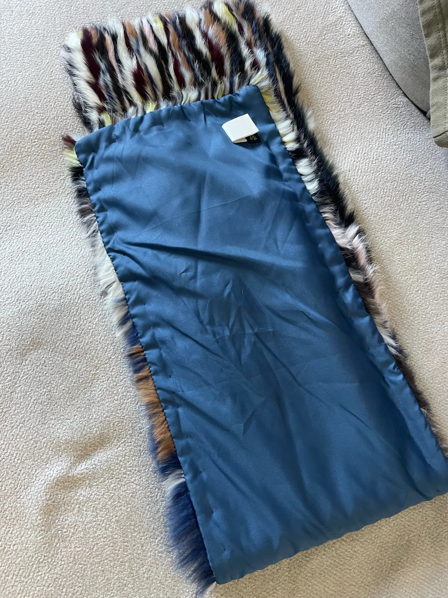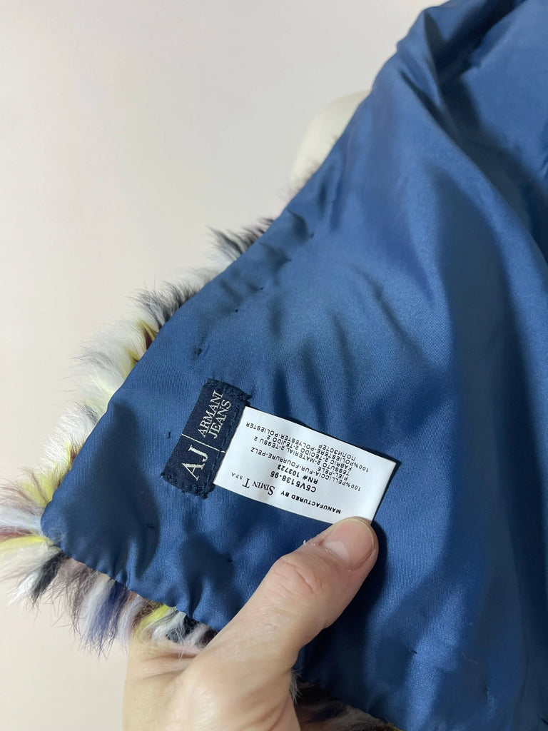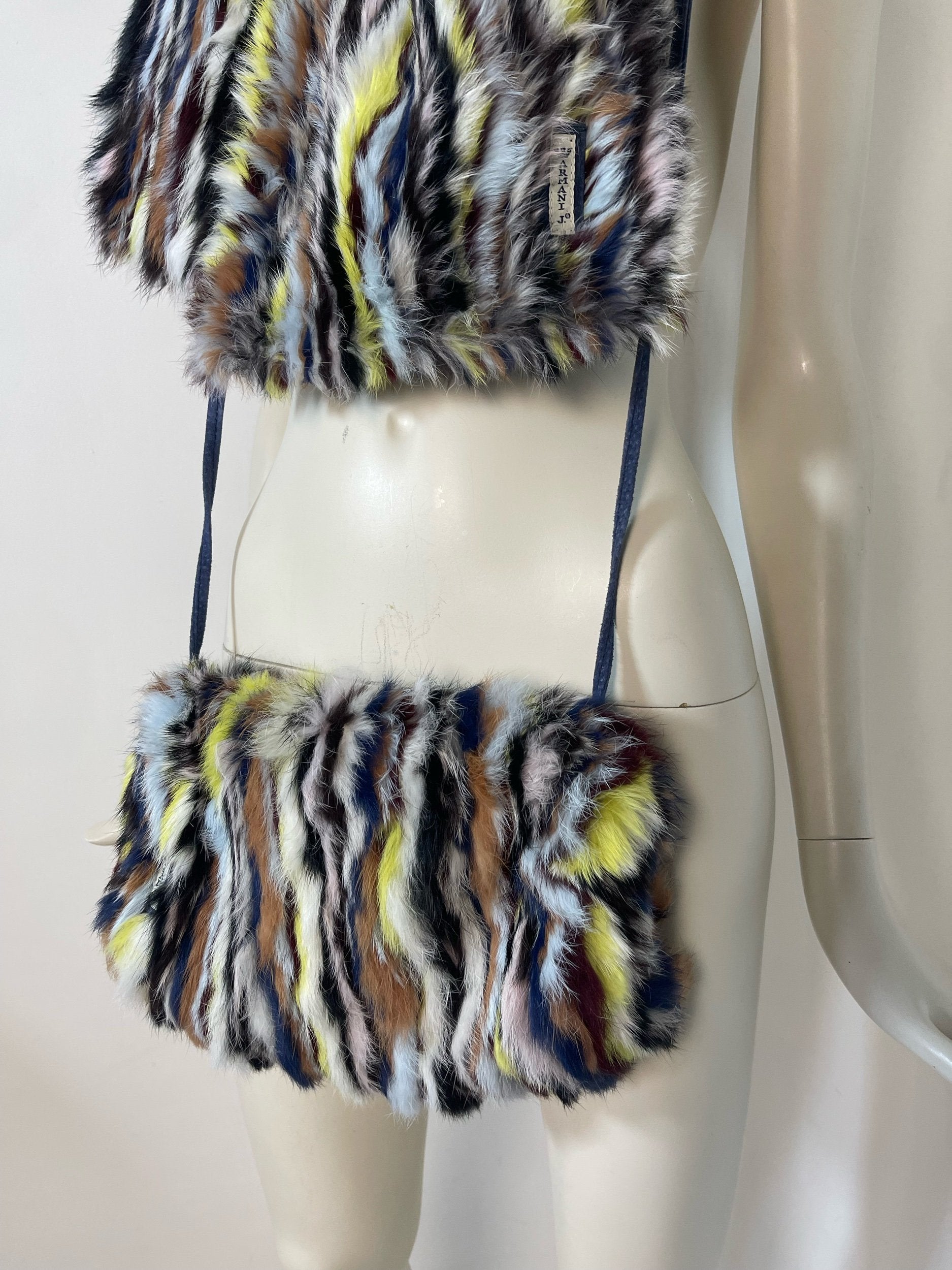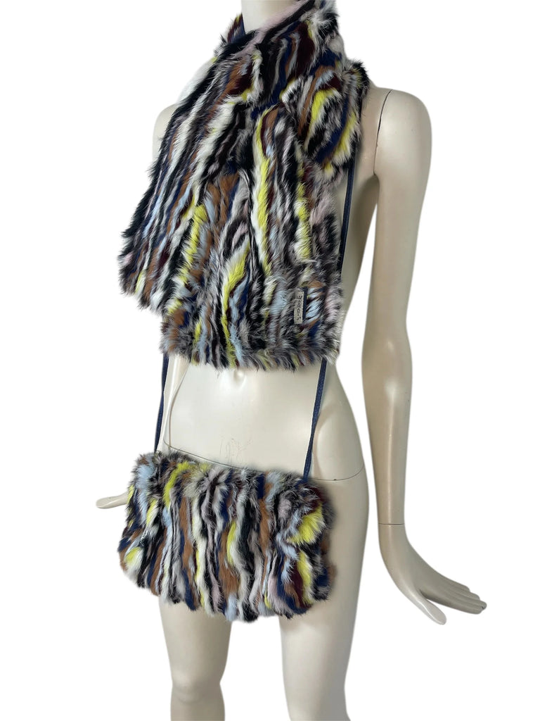 Step straight into the bold, eclectic energy of the early 2000s with this authentic vintage Armani Jeans fur scarf and matching muff. Crafted from luxuriously soft rabbit fur, this rare set features a striking multicolor striped pattern—mixing cobalt blue, soft pink, rich brown, yellow, black, and white for an unmistakably Y2K look.