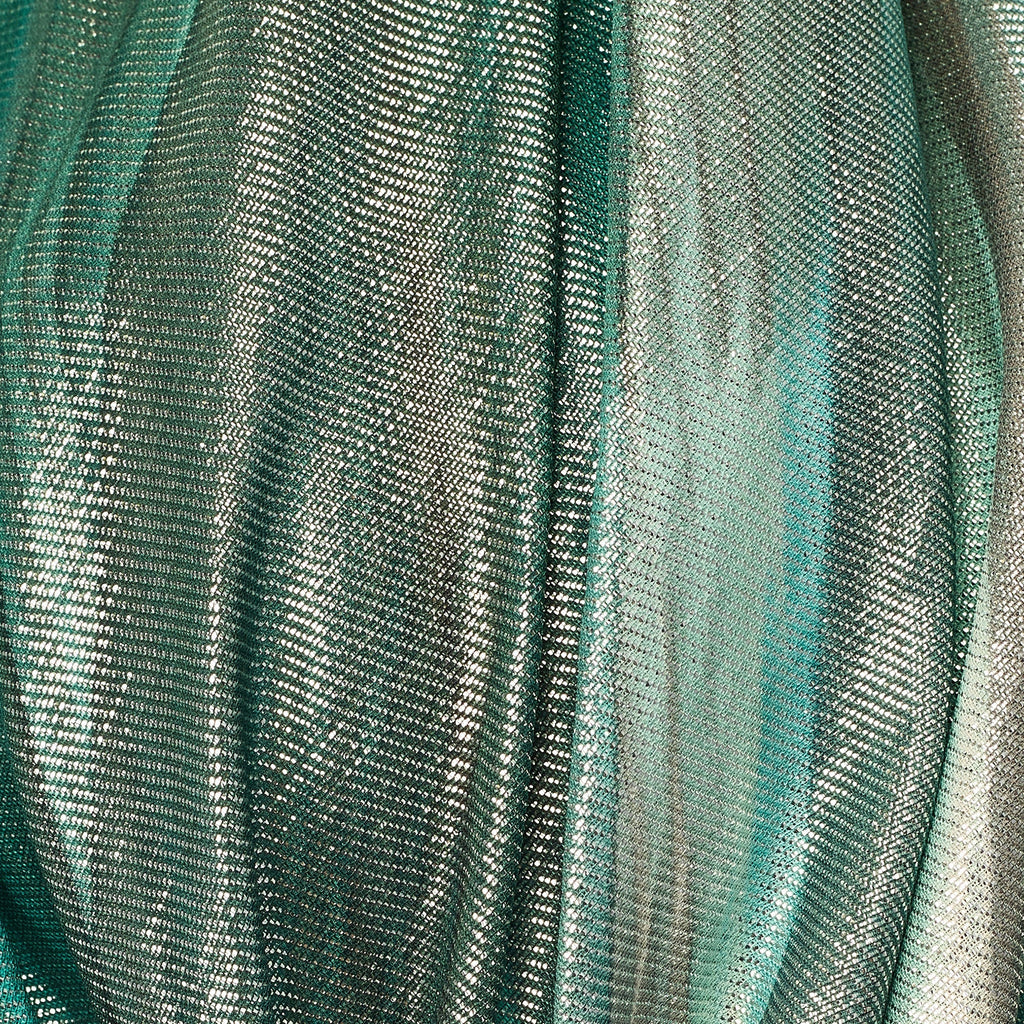 This spectacular Y2K lamé top and skirt ensemble were couture crafted by Manfred Thierry Mugler circa 1998 to 2001. Designed by the master of empowering, hyper-feminine tailoring, the ensemble twists around the body in a manner that recalls Grecian draping and the fluid, glittering designs that the patrons of 1970s nightclub Studio 54 wore on the dancefloor. The fabric is dazzling; a lightweight silk lamé with an aqua hue, detailed with a subtle pink-bronze ombré stripe. The attention-grabbing look is composed of two parts: a skin-flashing top and maxi-skirt. The top is tailored almost as though a lamé scarf has been expertly twisted around the body. It has a halter-style neckline that gives way to a racerback at the rear. It has a cropped length and wide waistband that can be adjusted and tied at the side of the waist, the tie then draping down the side over the hips. The incredible, hip-hugging skirt is cut with a high-waist that sits under the top. It has a dramatic fishtail cut which becomes a graceful, floor-sweeping train at the back of the dress. The skirt fastens at the rear with a hidden hook-and-eye clasp and off-white zip with angular pull. Both pieces are unlined.