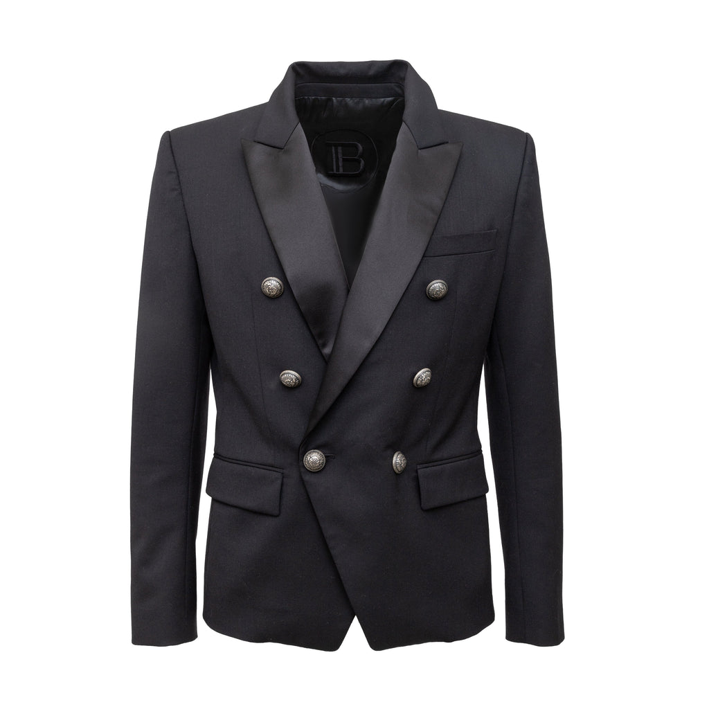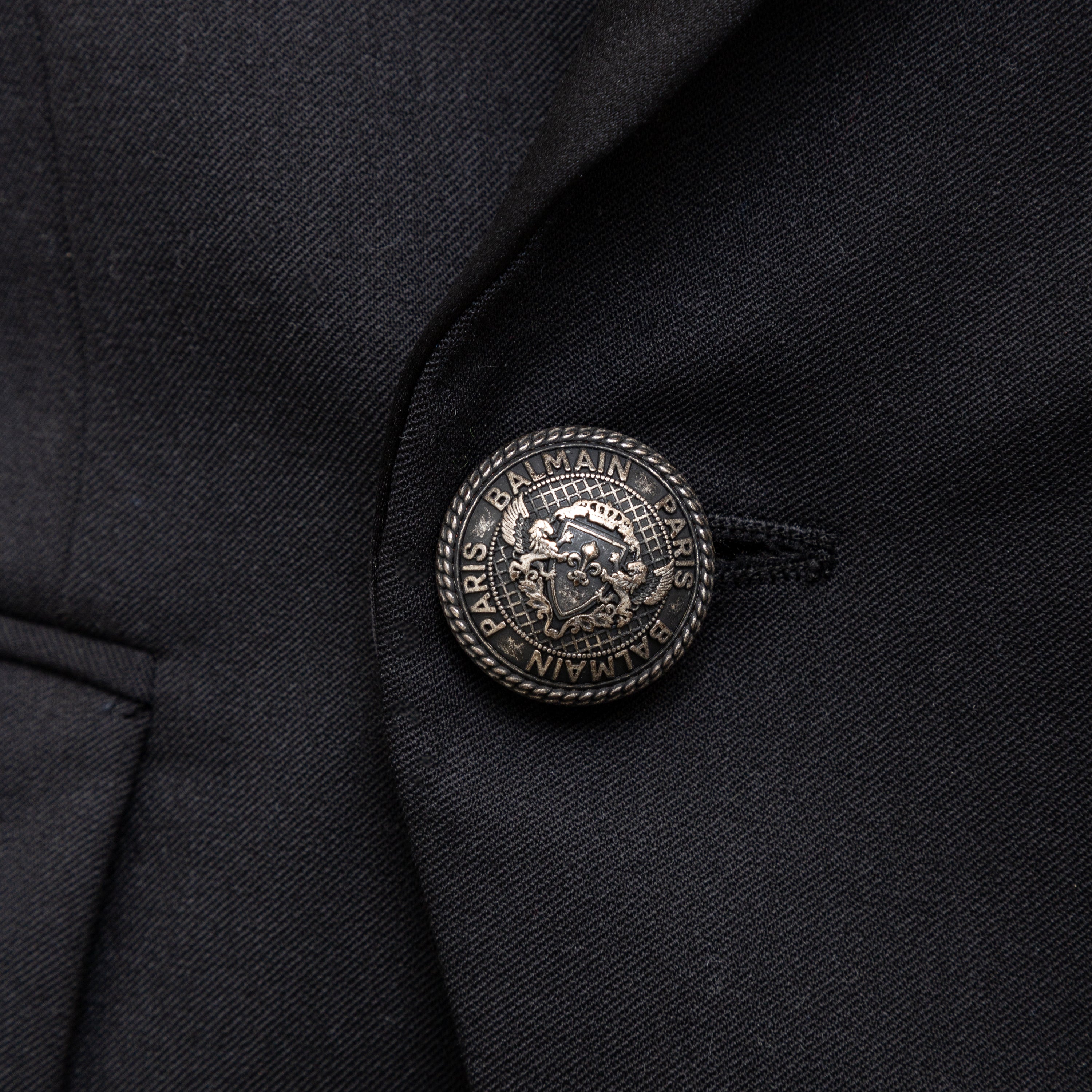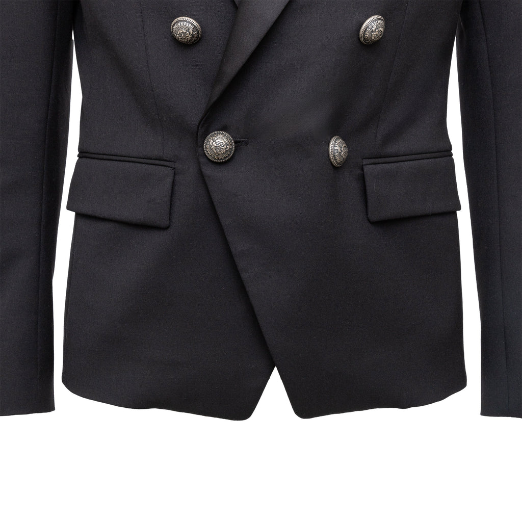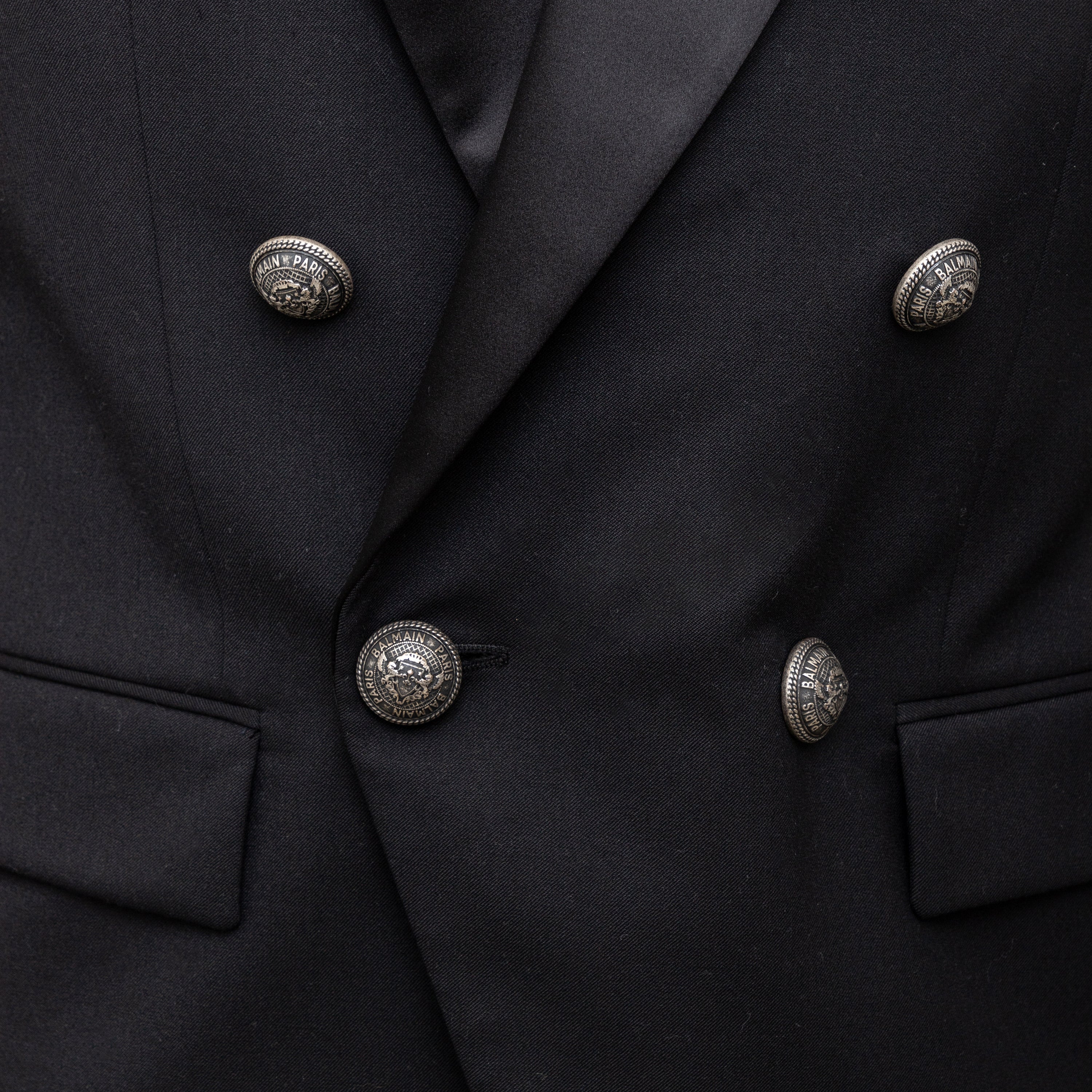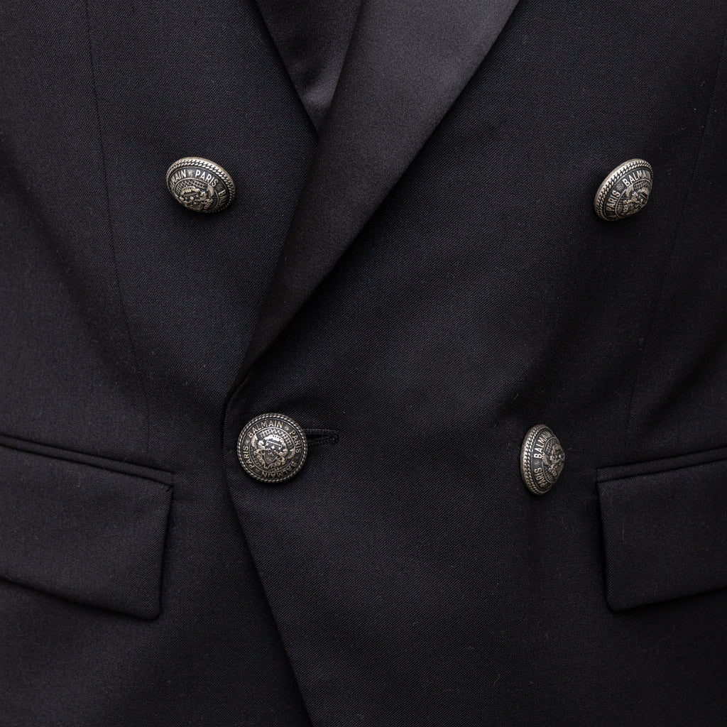 This Balmain Double Breasted Blazer exudes classic elegance with its black wool blend fabric and satin trim on the collar. Featuring embossed silver-tone buttons, peak lapels, and a double-breasted button fastening. With a chest welt pocket and two side flap pockets, it combines both style and practicality.