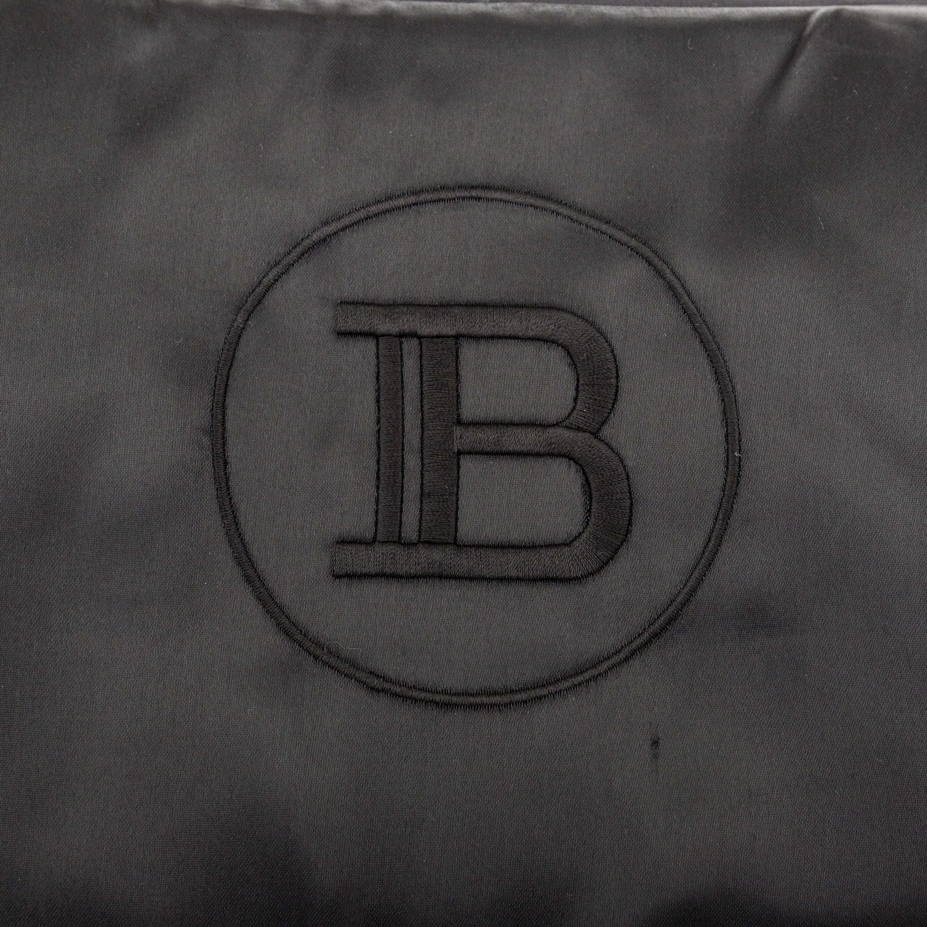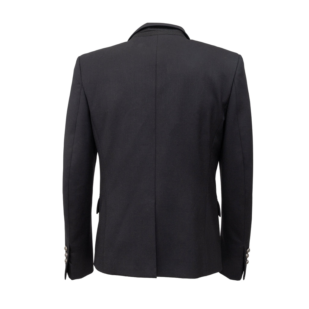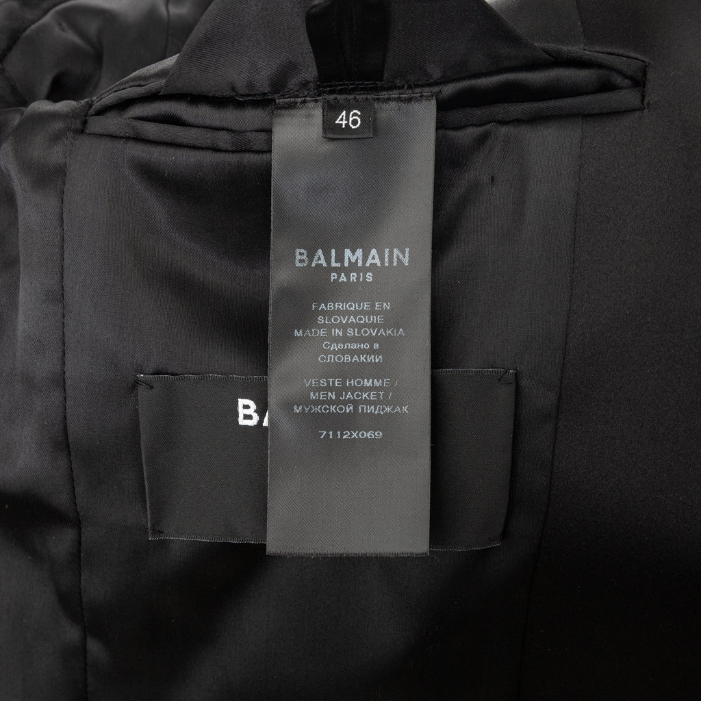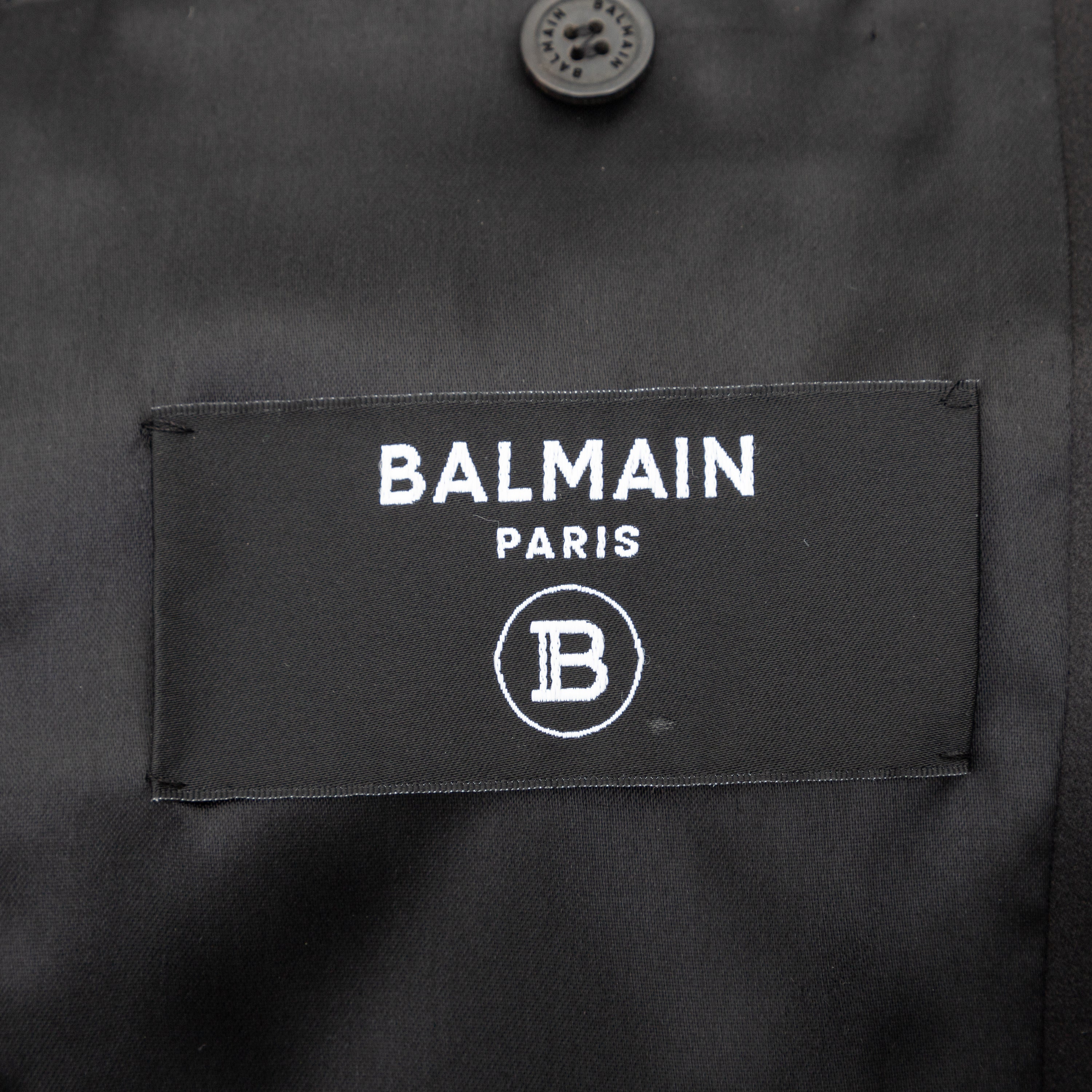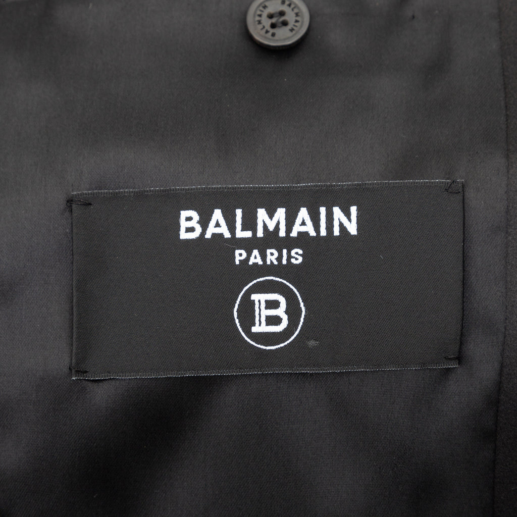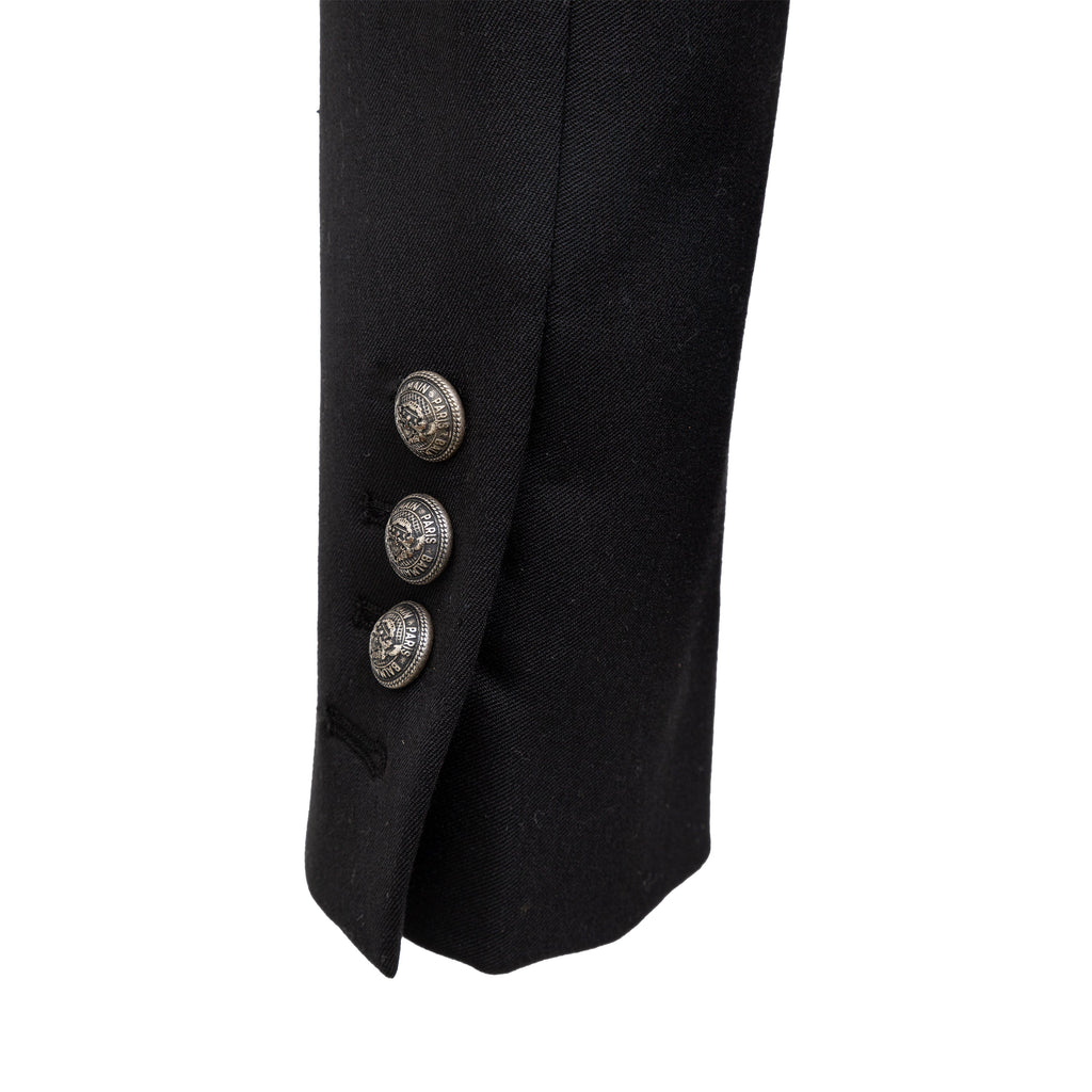 This Balmain Double Breasted Blazer exudes classic elegance with its black wool blend fabric and satin trim on the collar. Featuring embossed silver-tone buttons, peak lapels, and a double-breasted button fastening. With a chest welt pocket and two side flap pockets, it combines both style and practicality.