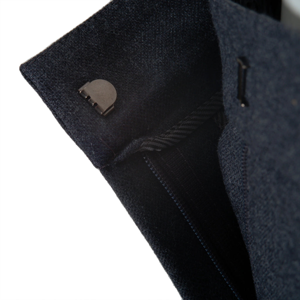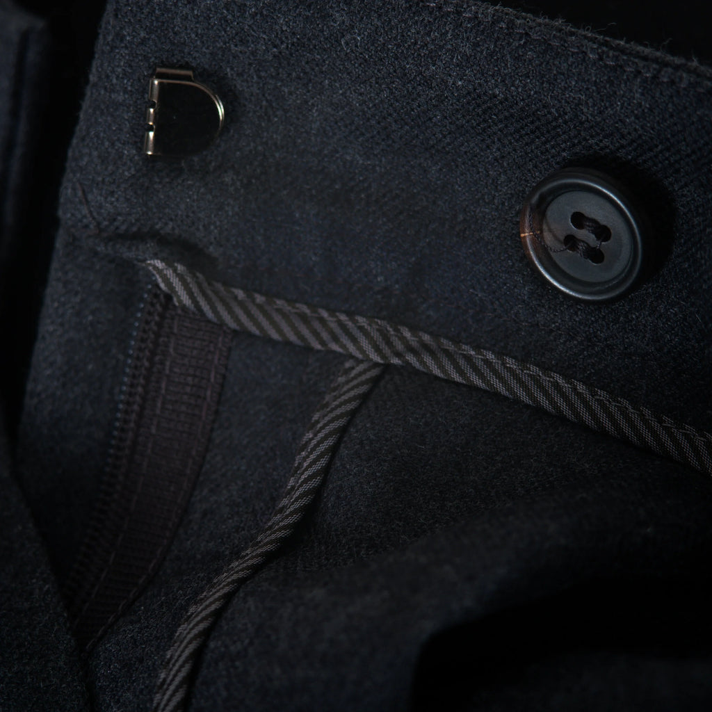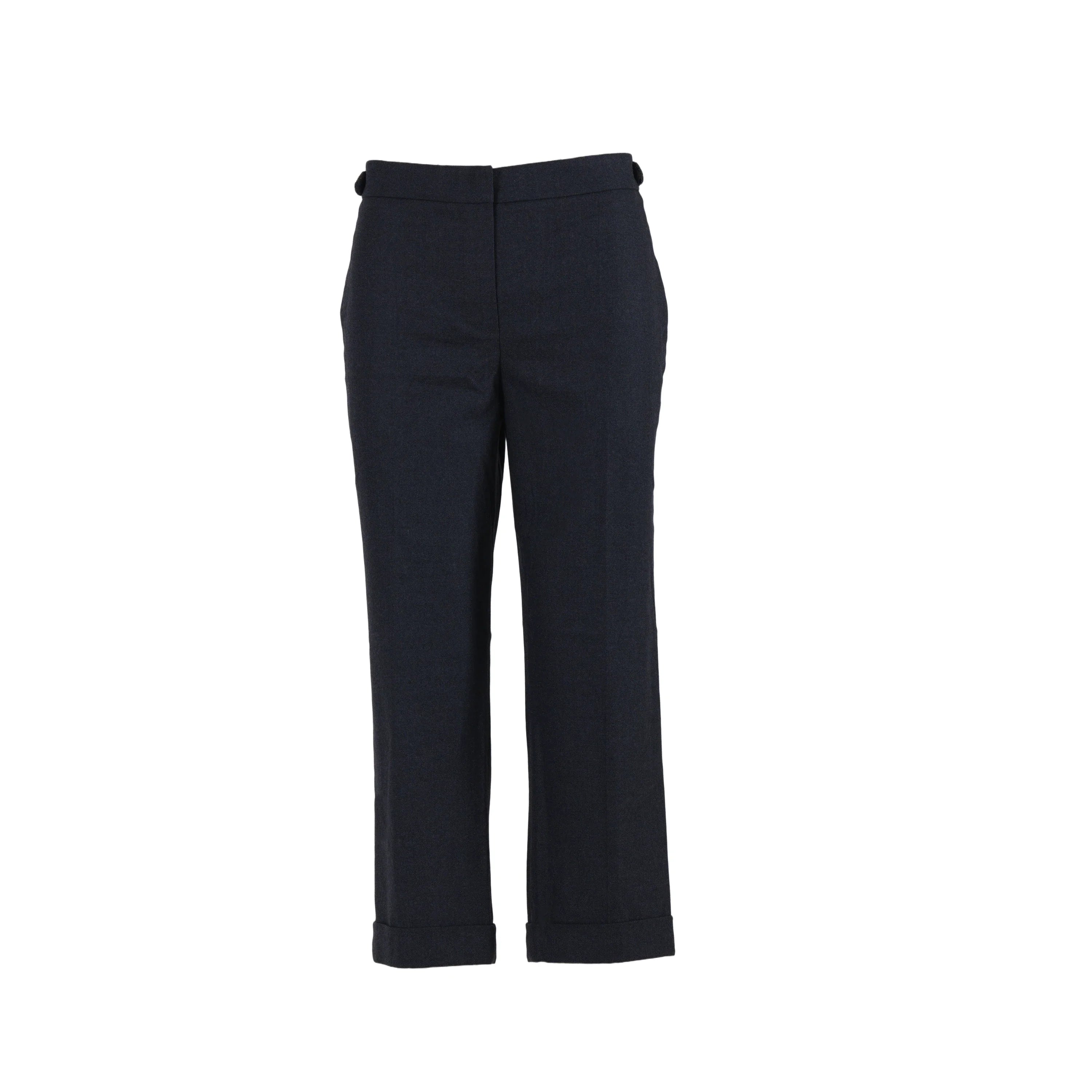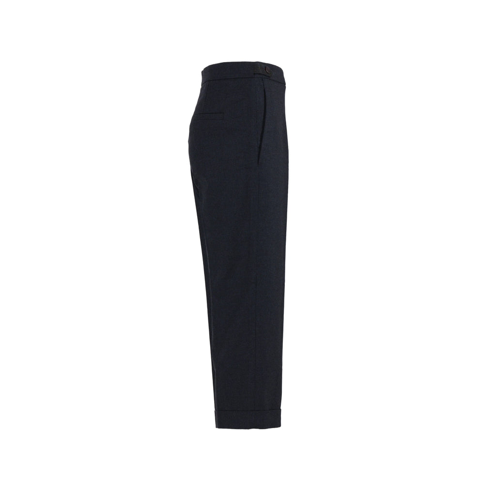 Cut from a soft wool–cotton blend, they feature a mid-rise waist, straight leg, and a deep navy tone with cuffed hems for polished versatility.