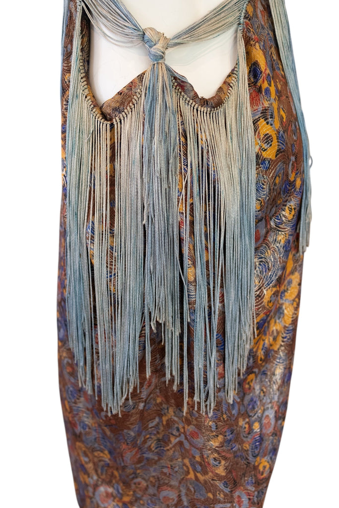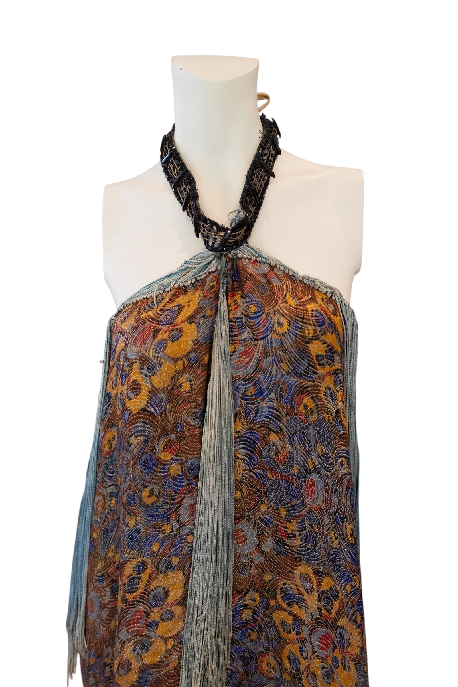 This one-of-a-kind 1920s original floral silk lamé dress showcases exquisite light blue fringing and a refined black 20s jet beaded neckline. Its minimalist shift design creates an effortless silhouette, perfectly capturing the elegance and sophistication of the era. Ideal for discerning collectors and vintage fashion connoisseurs seeking authentic appeal and modern design.