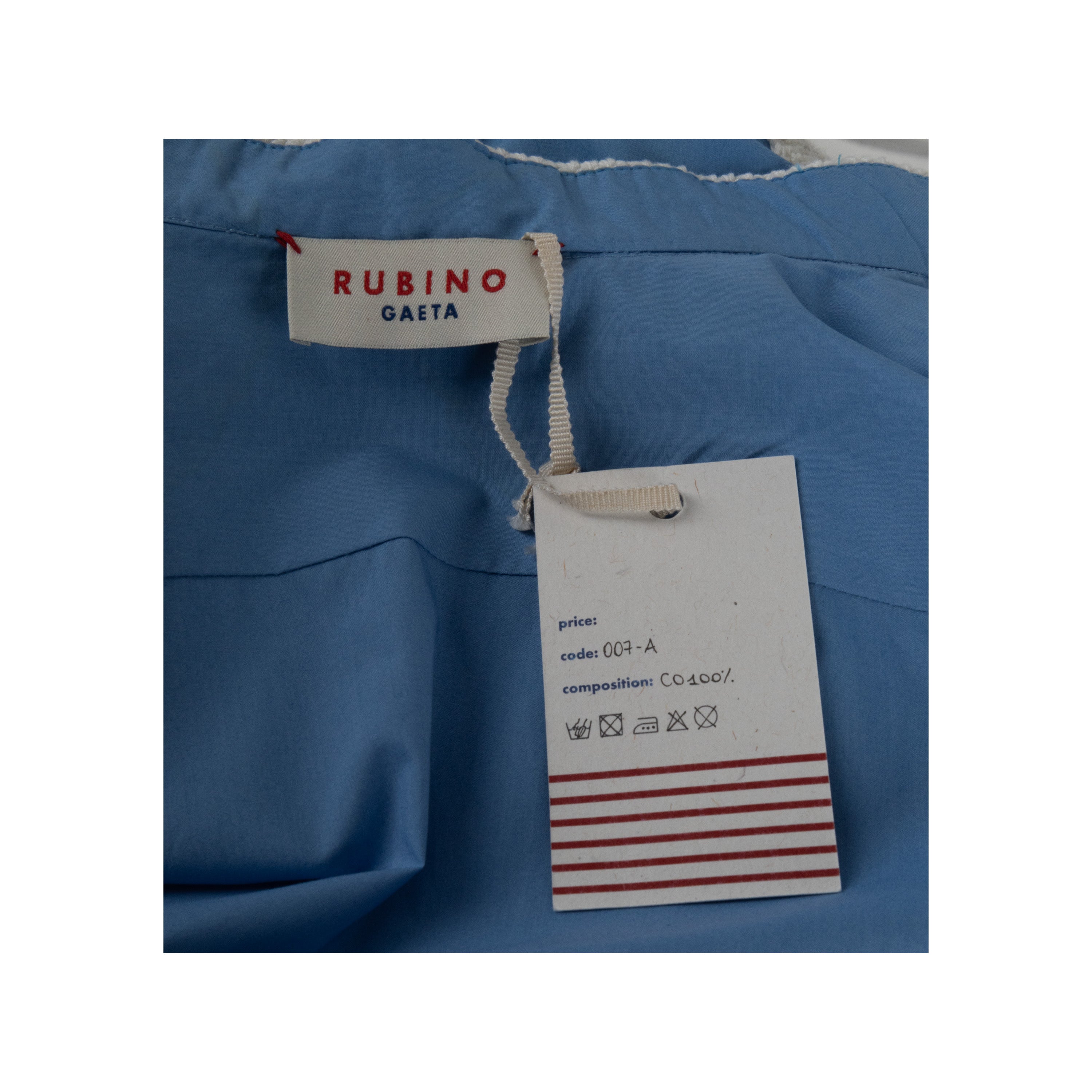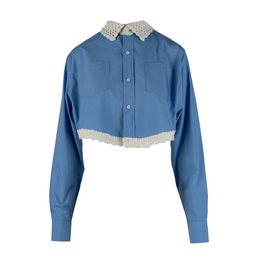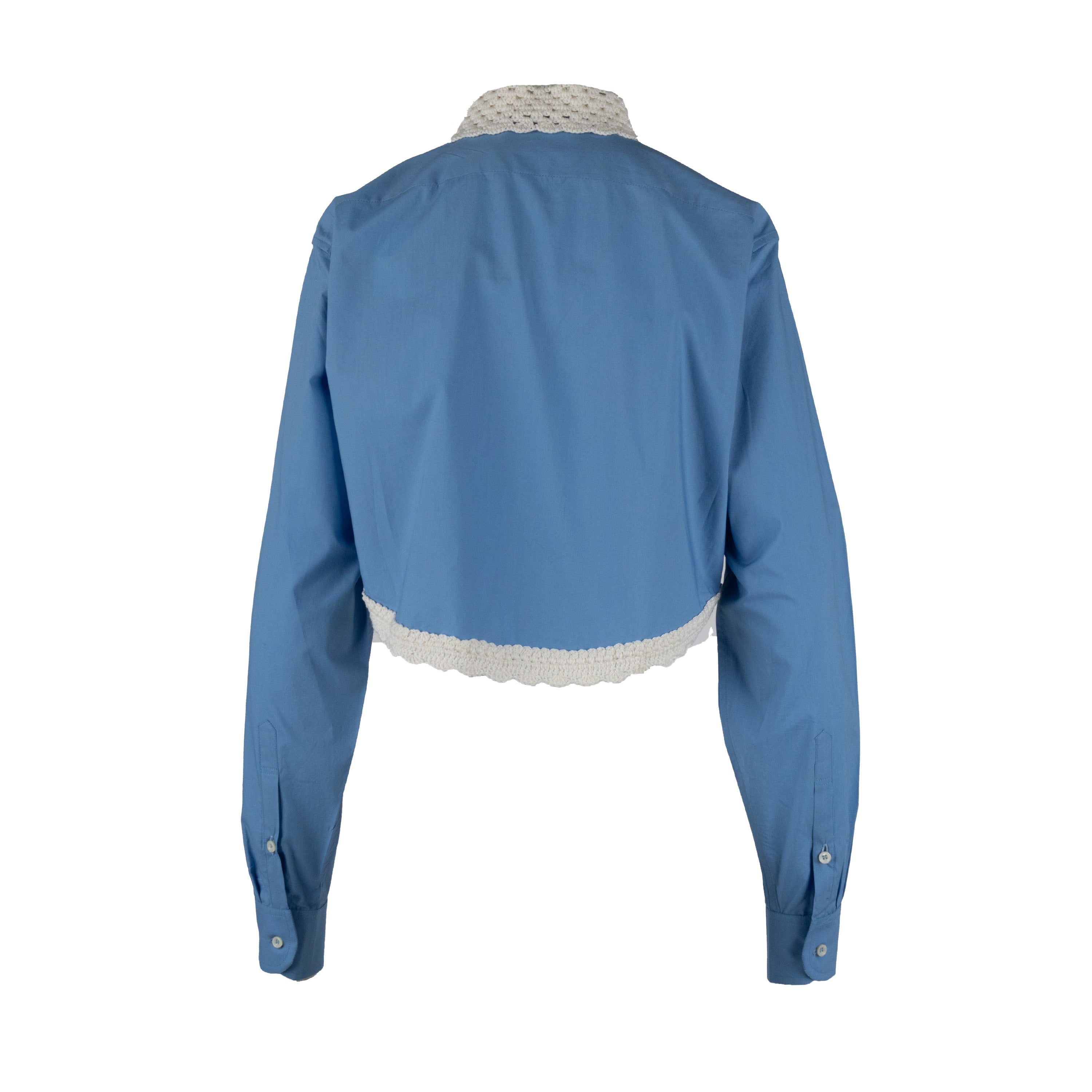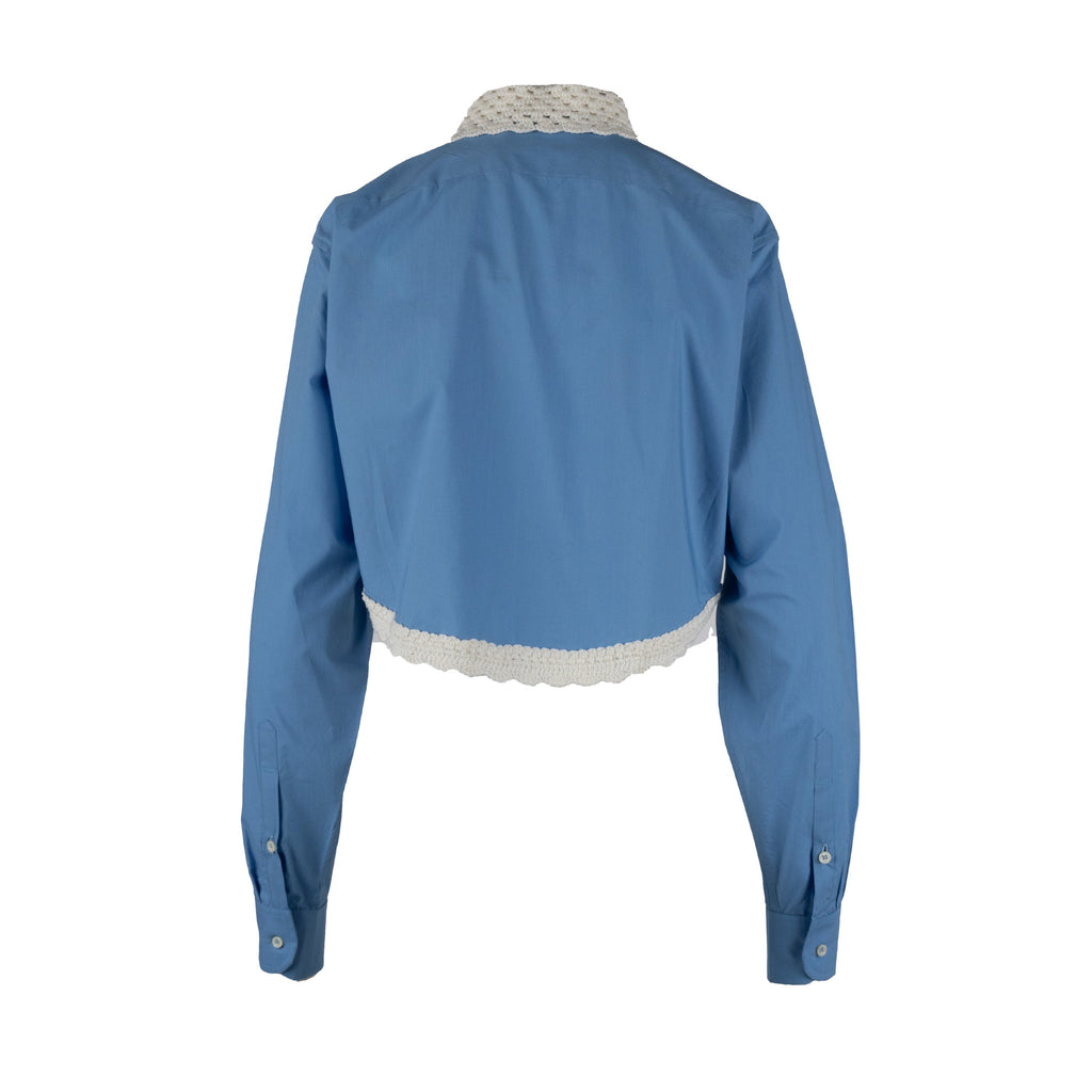 Cropped shirt made of blue cotton fabric, handmade cotton crochet in white color at collar and hem. Natural mother-of-pearl buttons.