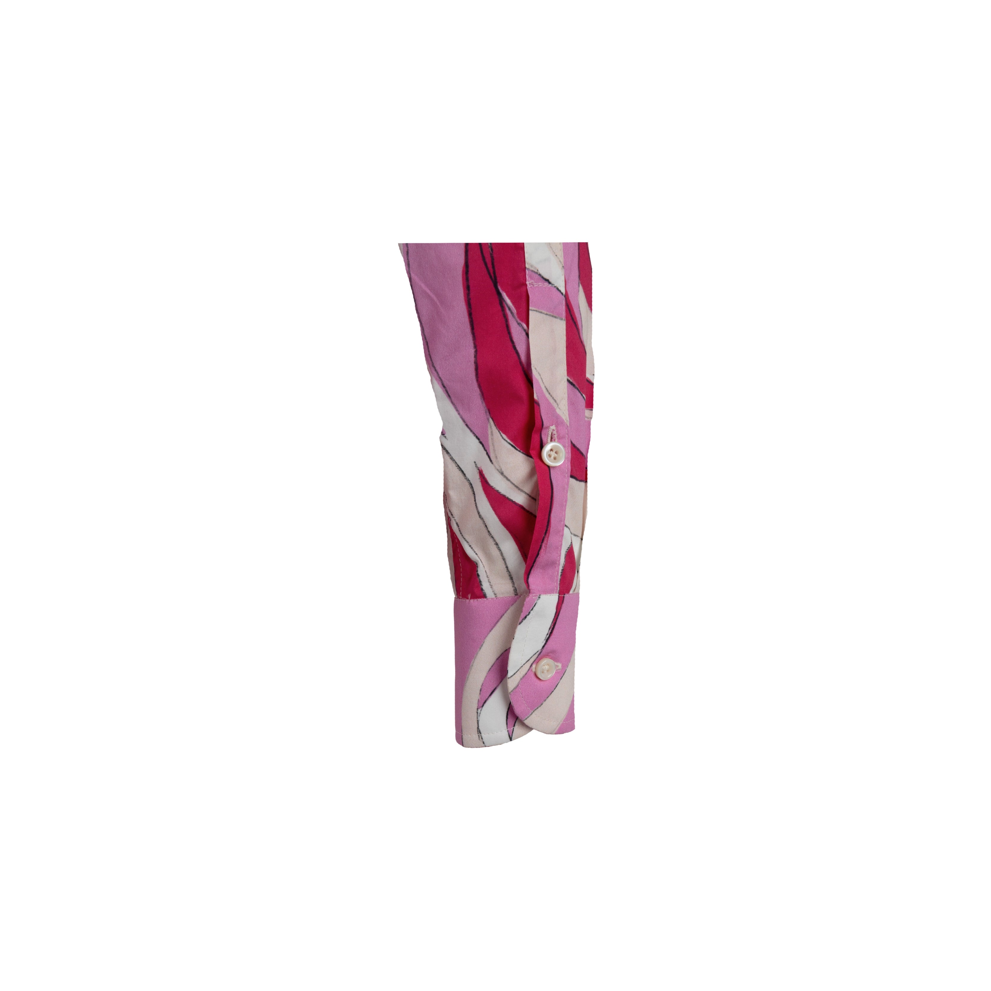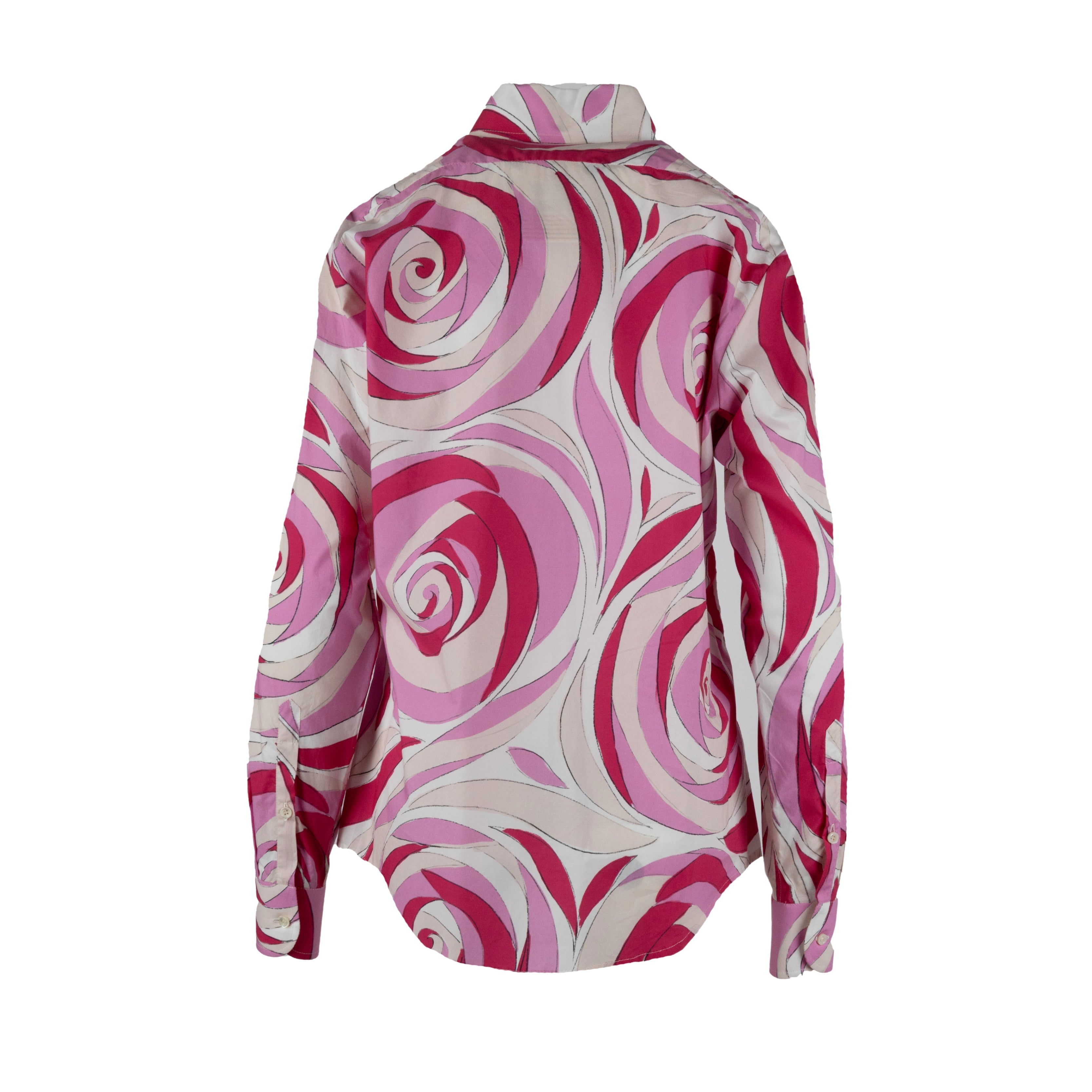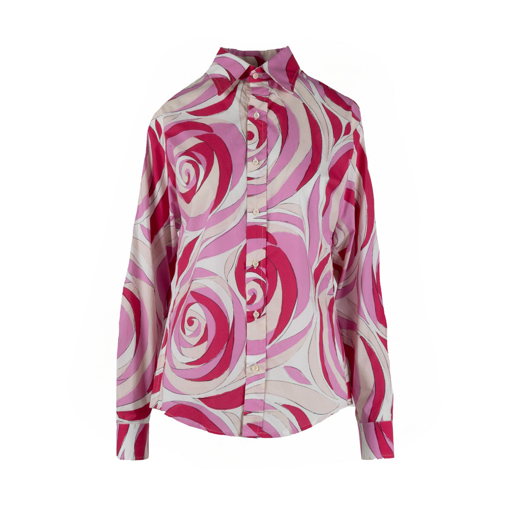 Masculine cut shirt made of cotton poplin printed with all-over peony pattern. Natural mother-of-pearl buttons