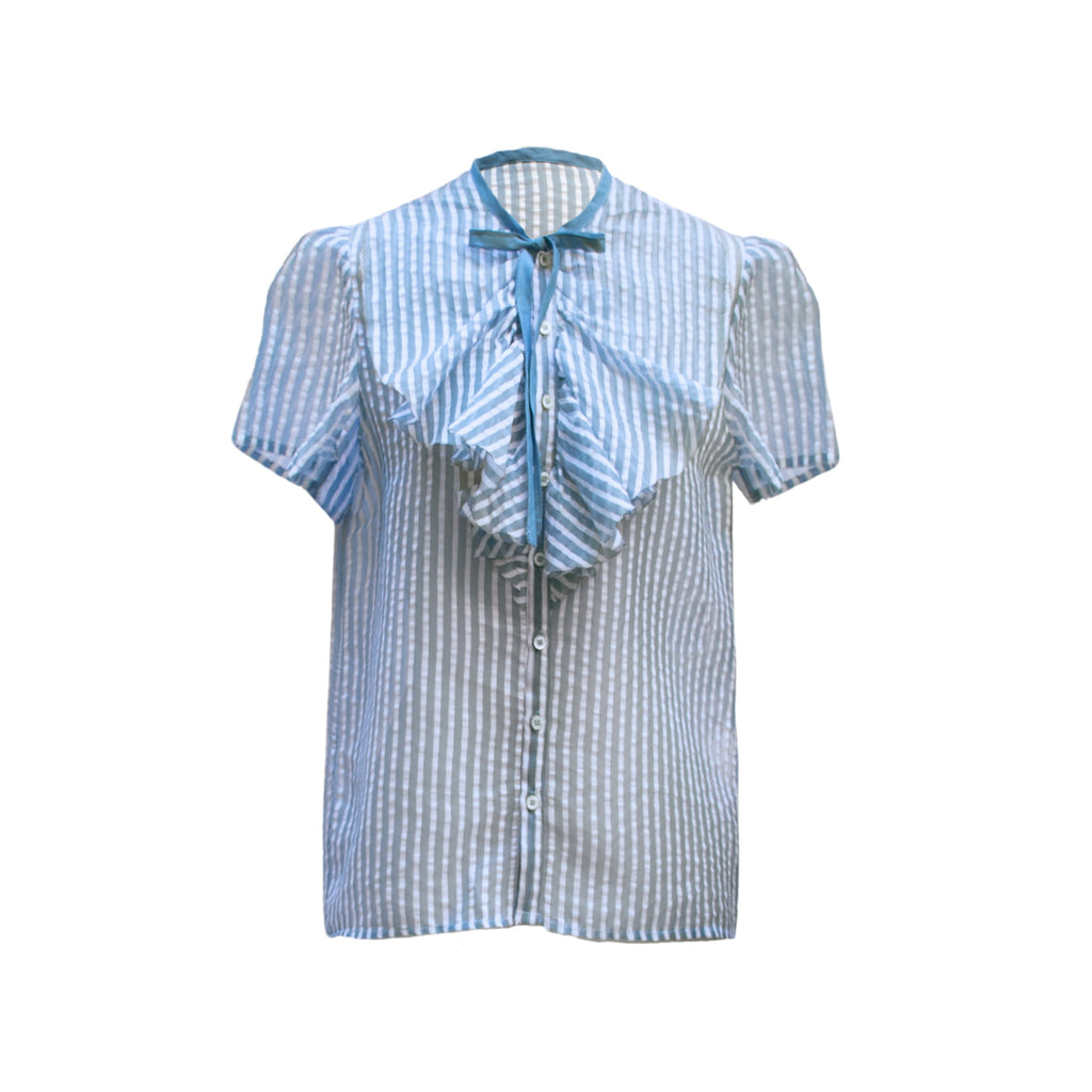 Symmetrical ruffle applied to the neck, in stripe yarn dyed cotton, silk and polyester mix. Crew neck bordered with front fastening ribbon in the same fabric. Natural mother of pearl buttons.