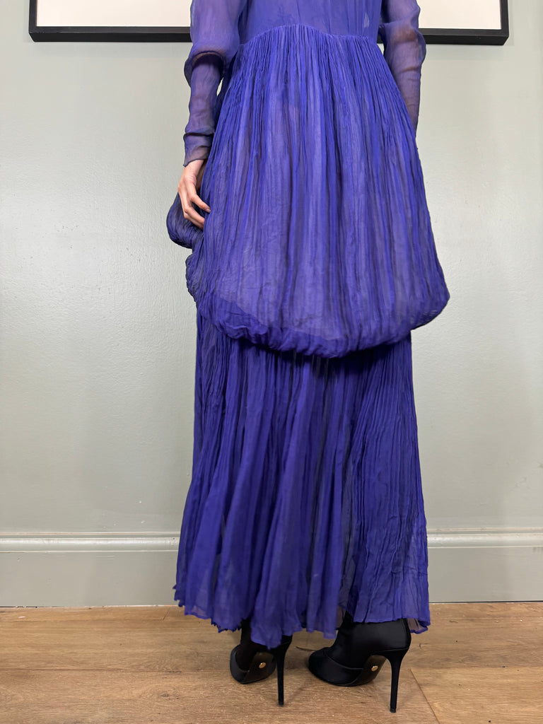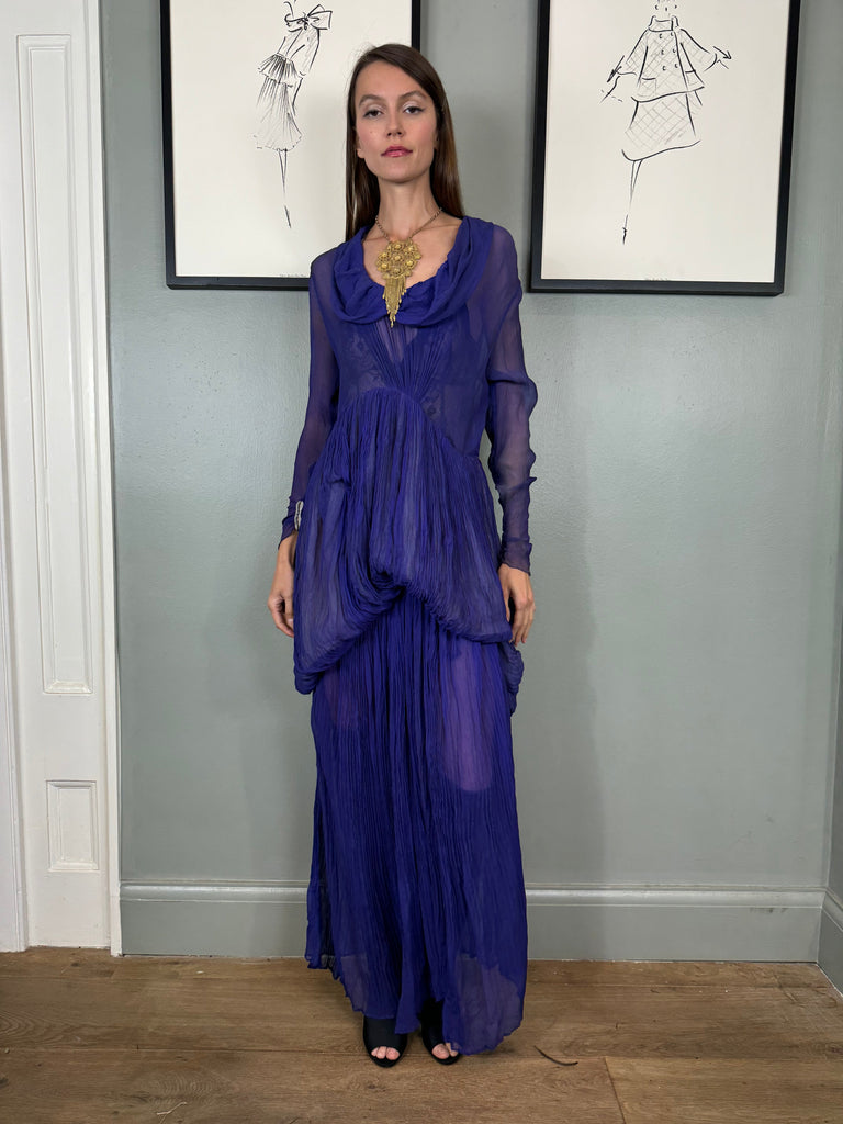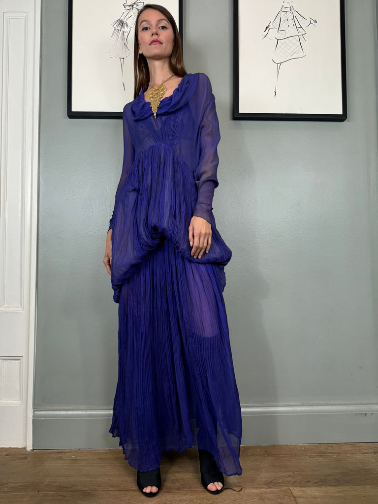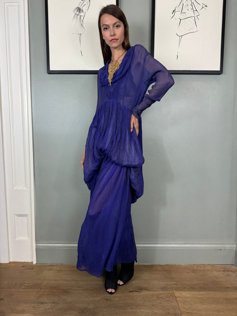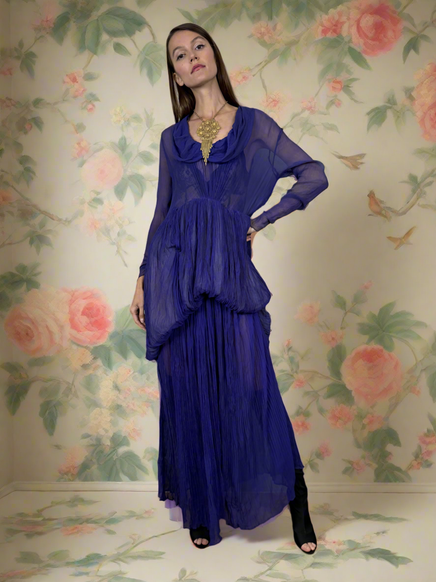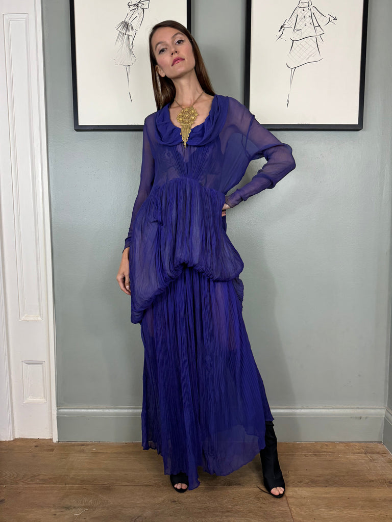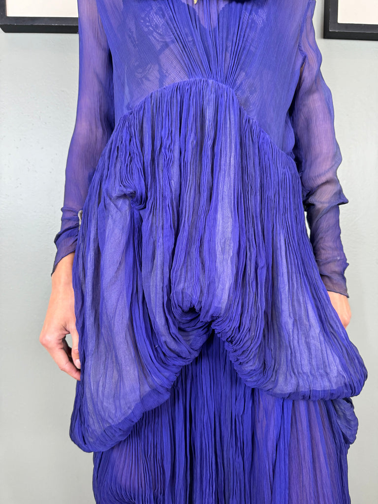 Experience timeless elegance with the Jude chiffon purple dress. Exquisitely designed with a round neckline and intricate pleated detailing, this dress exudes a vintage charm. The two tiers of pleated chiffon and bustle detail add a touch of drama to this original 30s piece. Has side hooks. Perfect for any formal occasion. The skirt is lined and hung by ribbons in different lengths holding up the bustle.