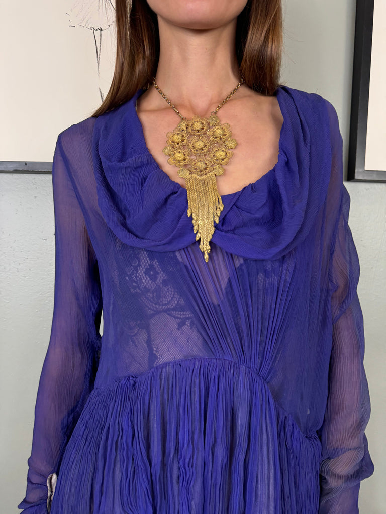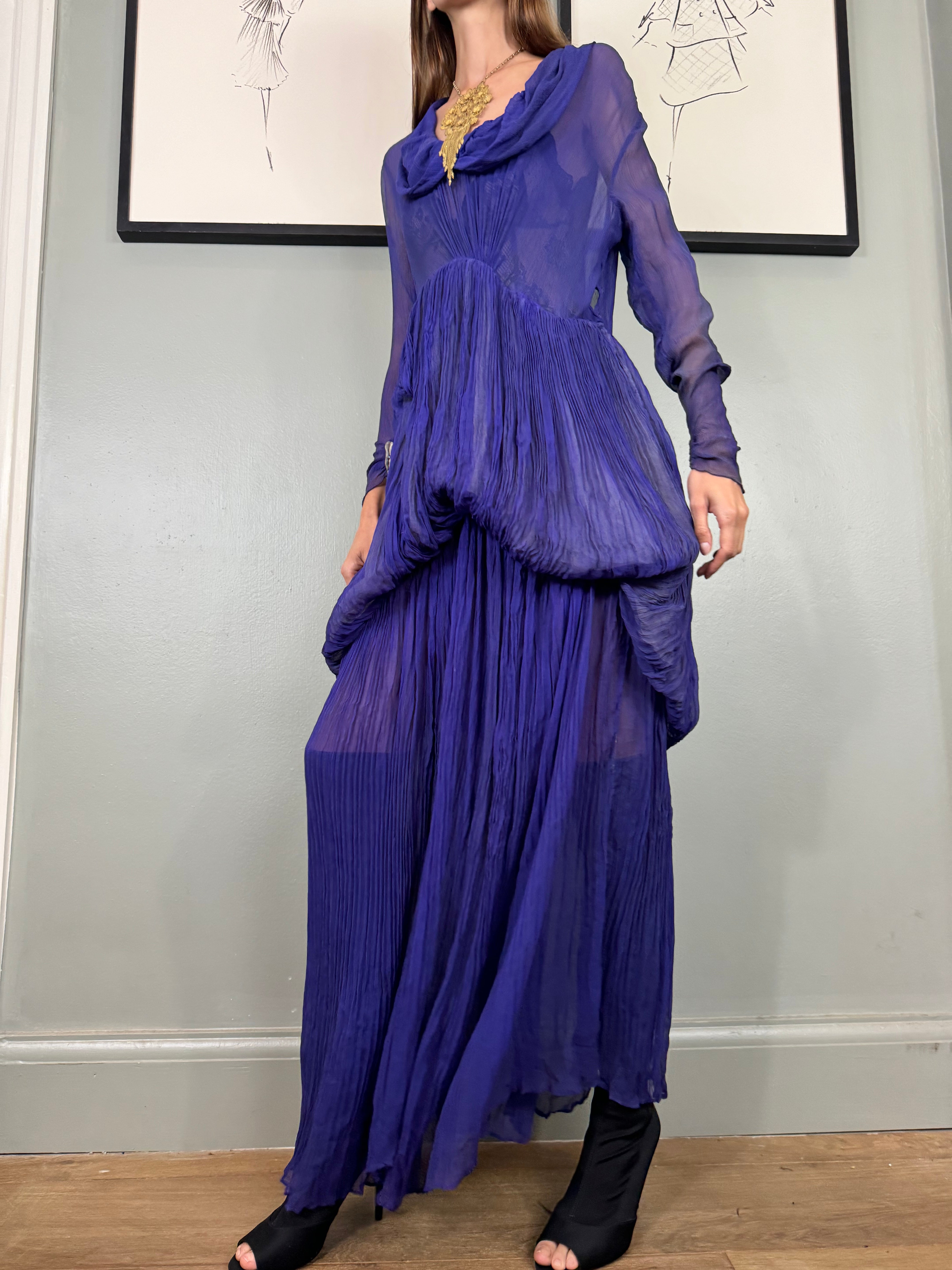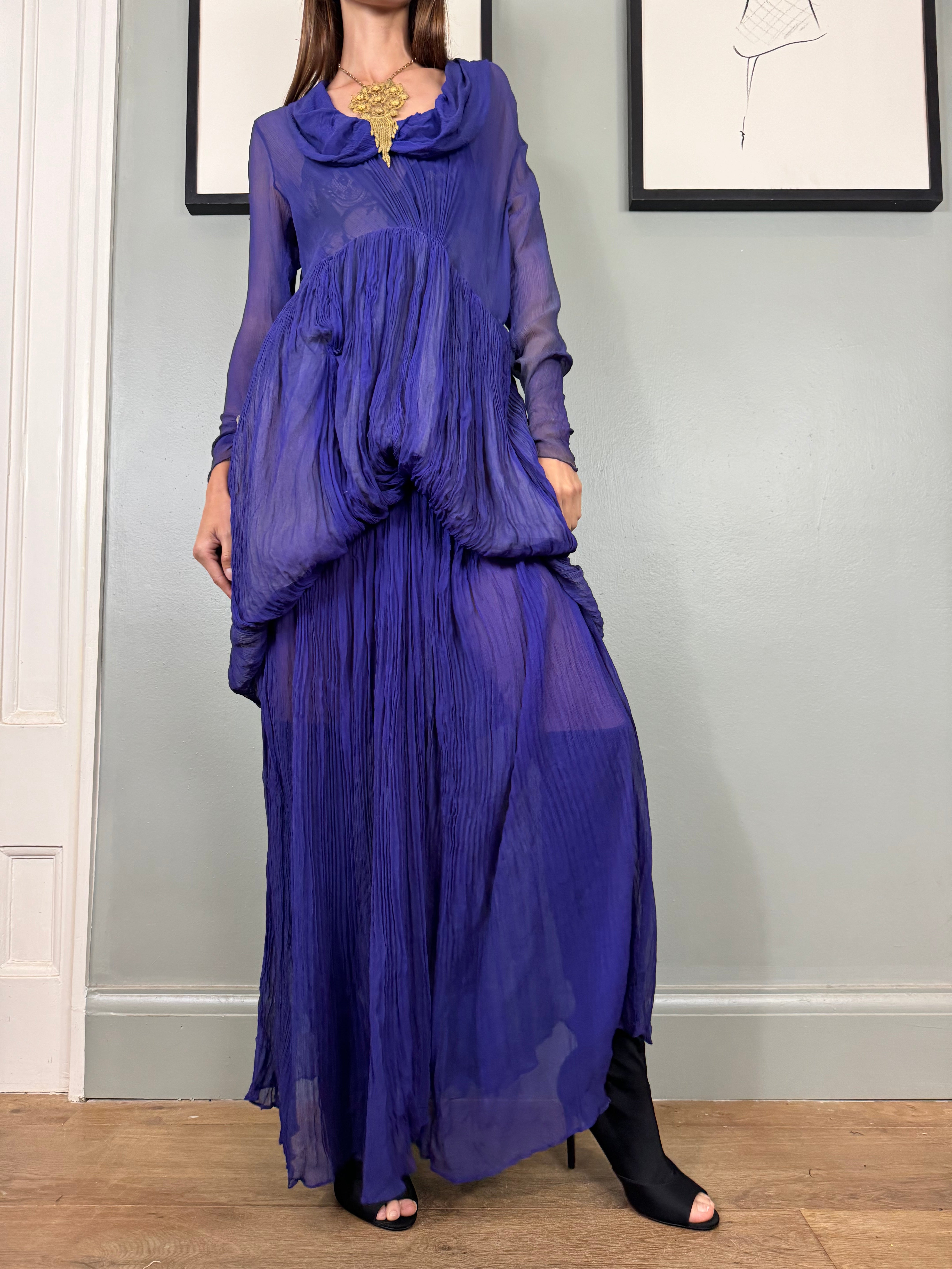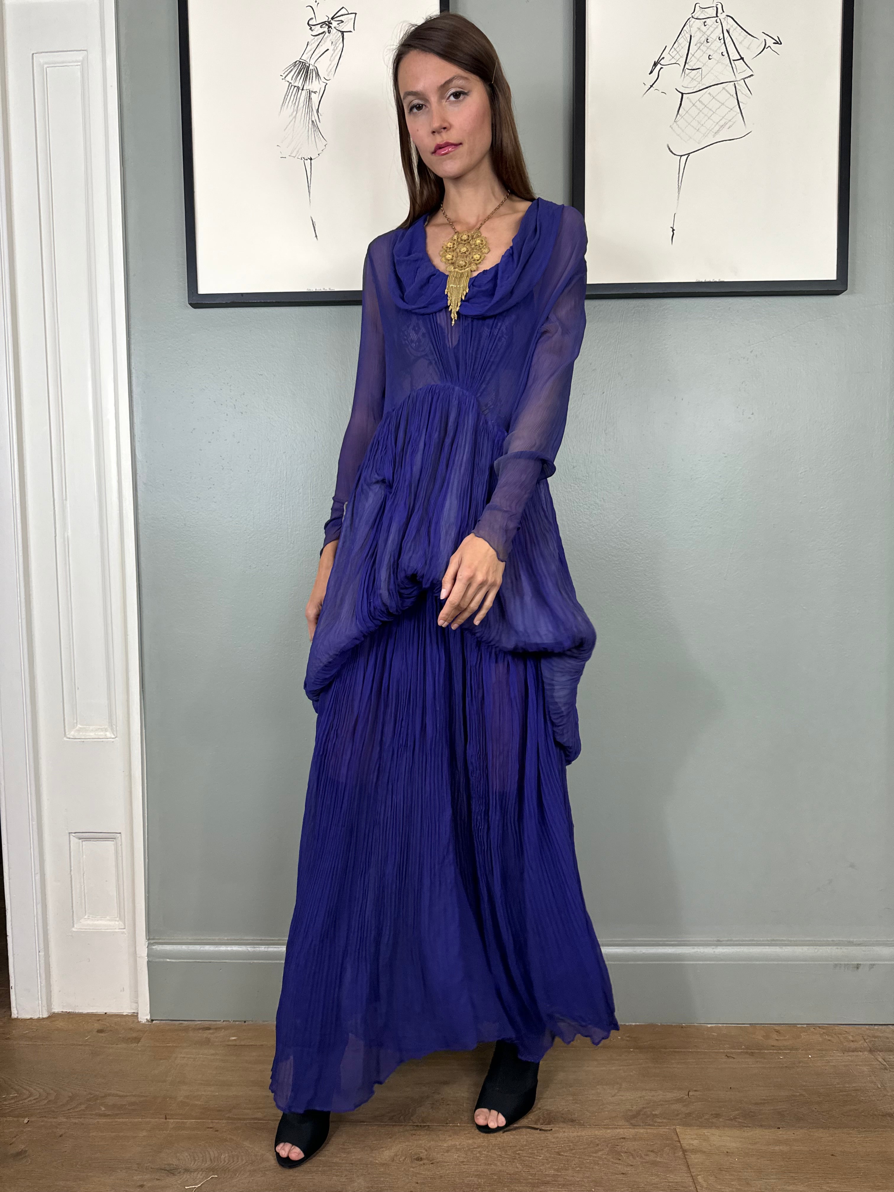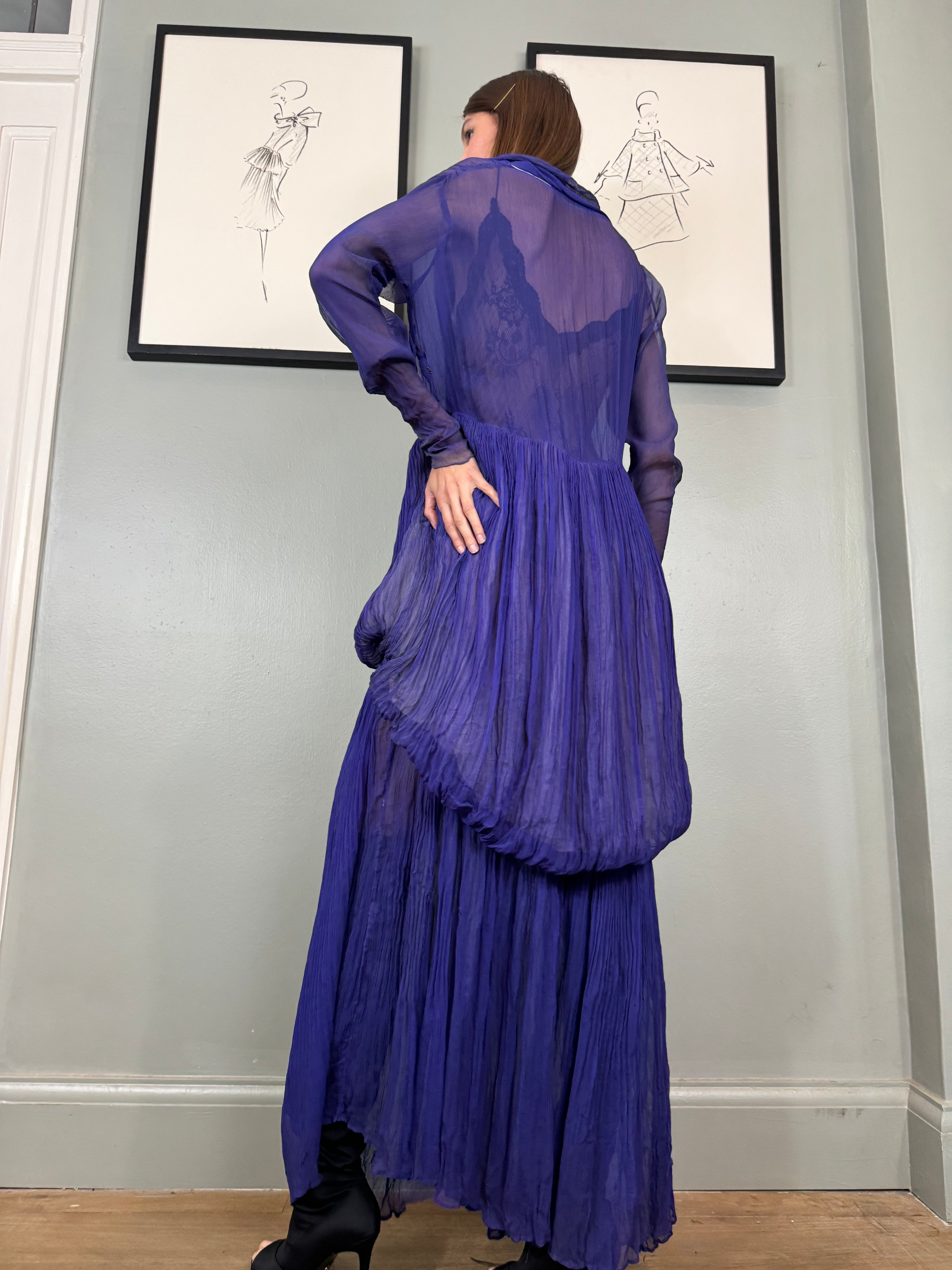 Experience timeless elegance with the Jude chiffon purple dress. Exquisitely designed with a round neckline and intricate pleated detailing, this dress exudes a vintage charm. The two tiers of pleated chiffon and bustle detail add a touch of drama to this original 30s piece. Has side hooks. Perfect for any formal occasion. The skirt is lined and hung by ribbons in different lengths holding up the bustle.