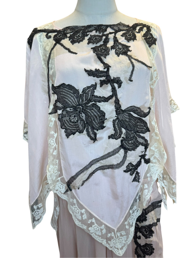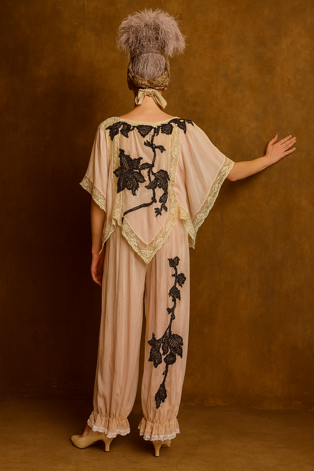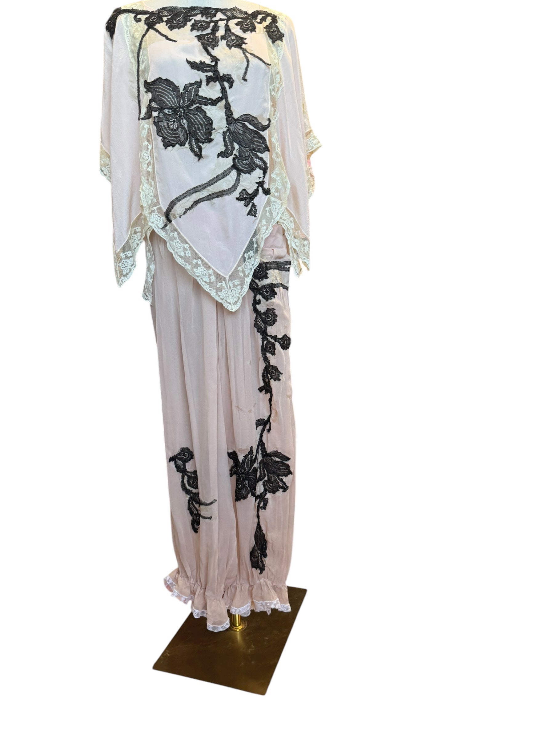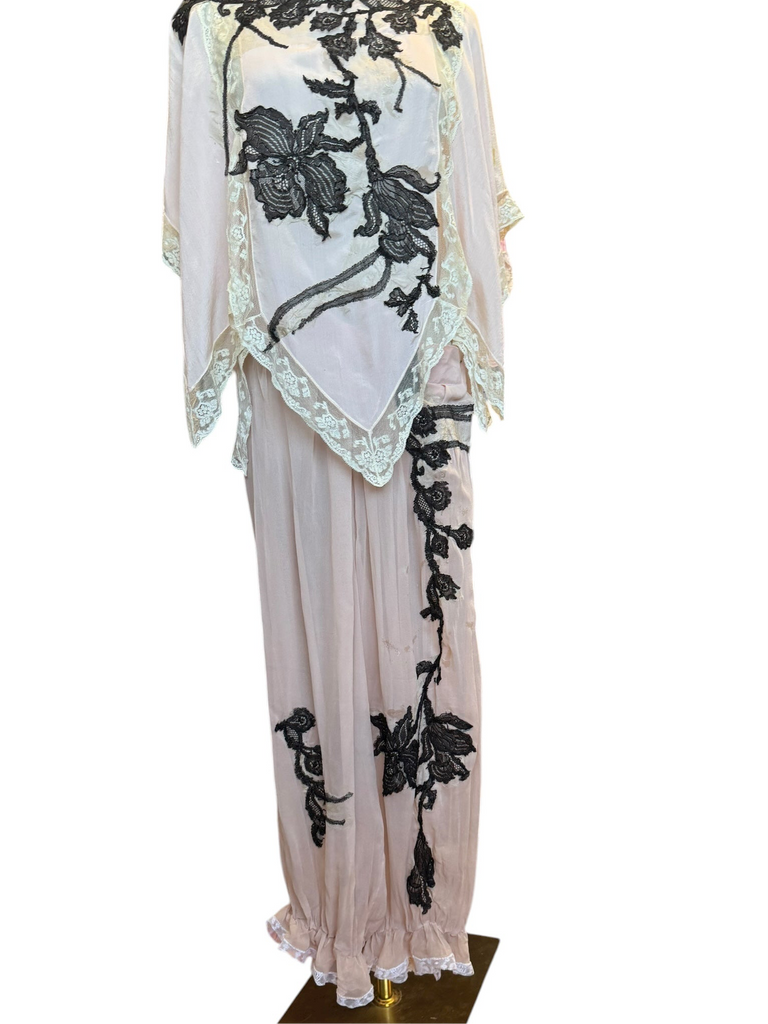 Experience the elegance and luxury of the 1930s with this chic 30s silk and lace lounge set. This rare and collectible set includes an angel sleeve blouse with delicate pink silk and cream lace inserts, adorned with a floral black lace motif across the neckline and body. Paired with matching silk bloomers featuring elasticated waist and ankle lace trimmed design, and matching black lace inserts, this loungewear set exudes timeless sophistication.