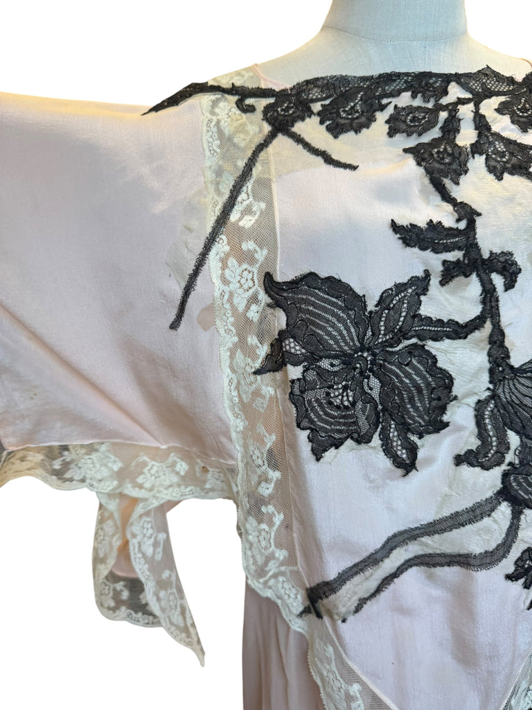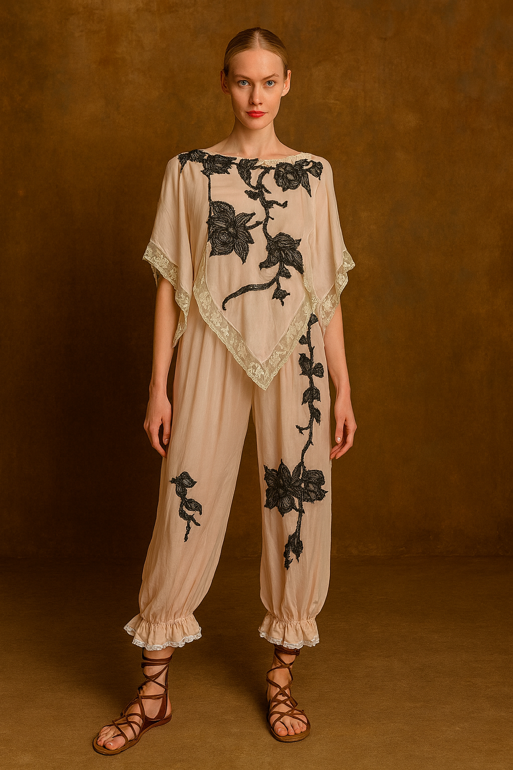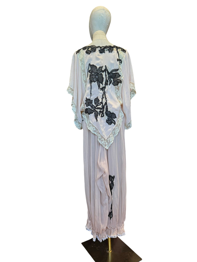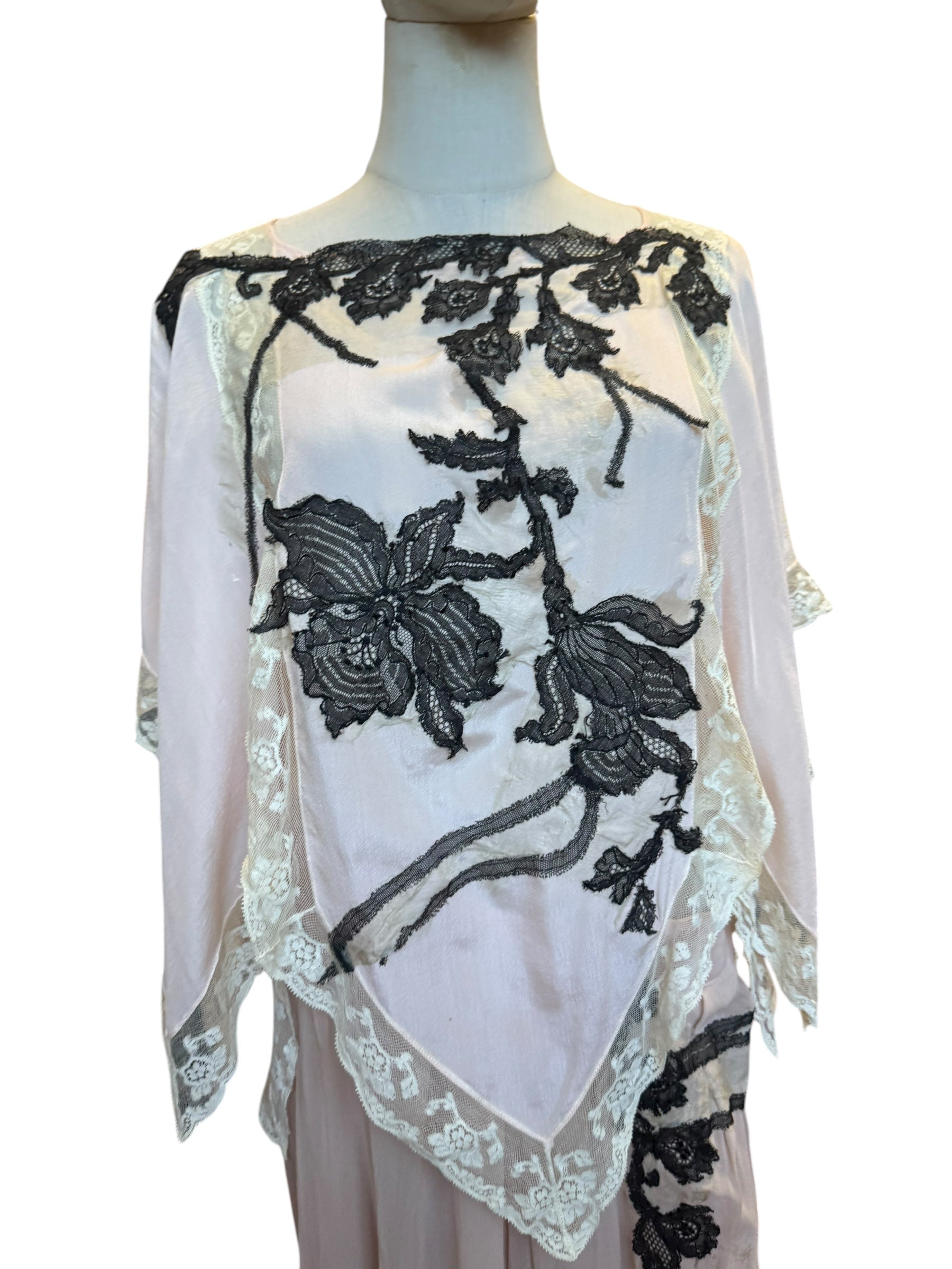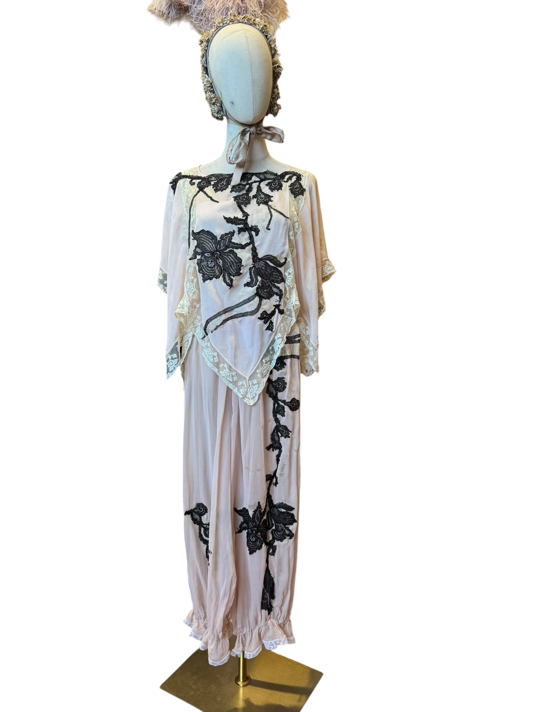 Experience the elegance and luxury of the 1930s with this chic 30s silk and lace lounge set. This rare and collectible set includes an angel sleeve blouse with delicate pink silk and cream lace inserts, adorned with a floral black lace motif across the neckline and body. Paired with matching silk bloomers featuring elasticated waist and ankle lace trimmed design, and matching black lace inserts, this loungewear set exudes timeless sophistication.