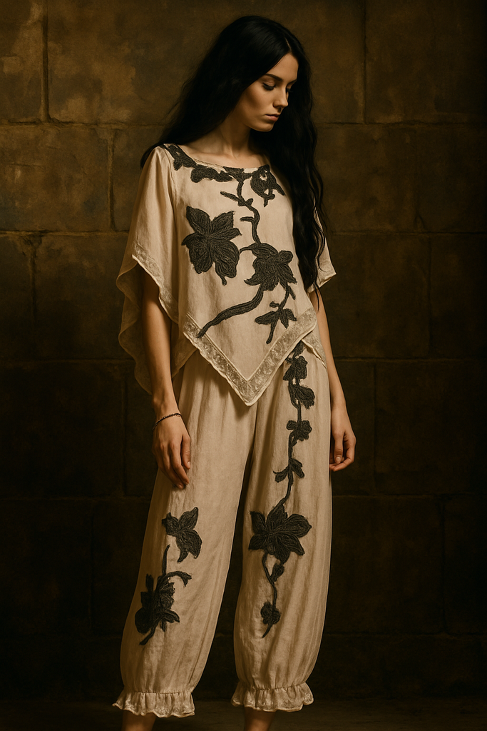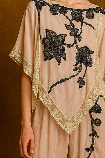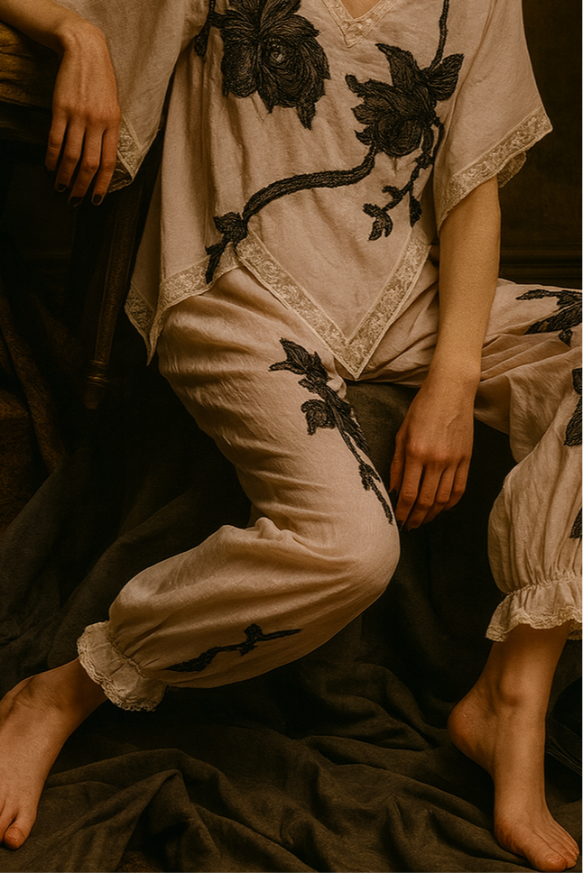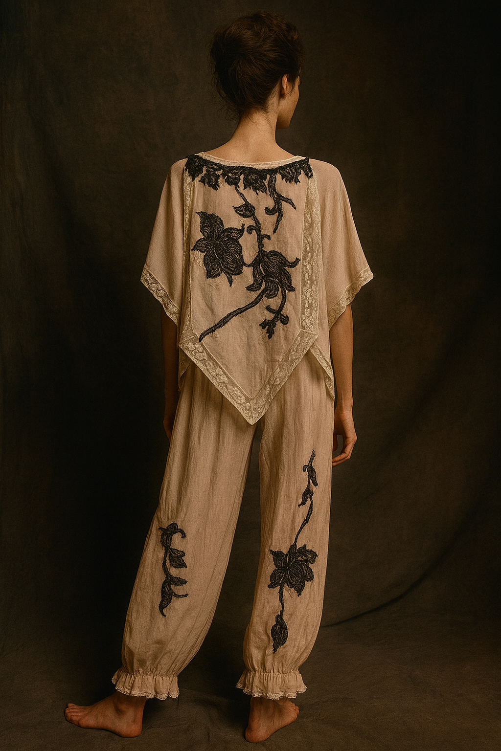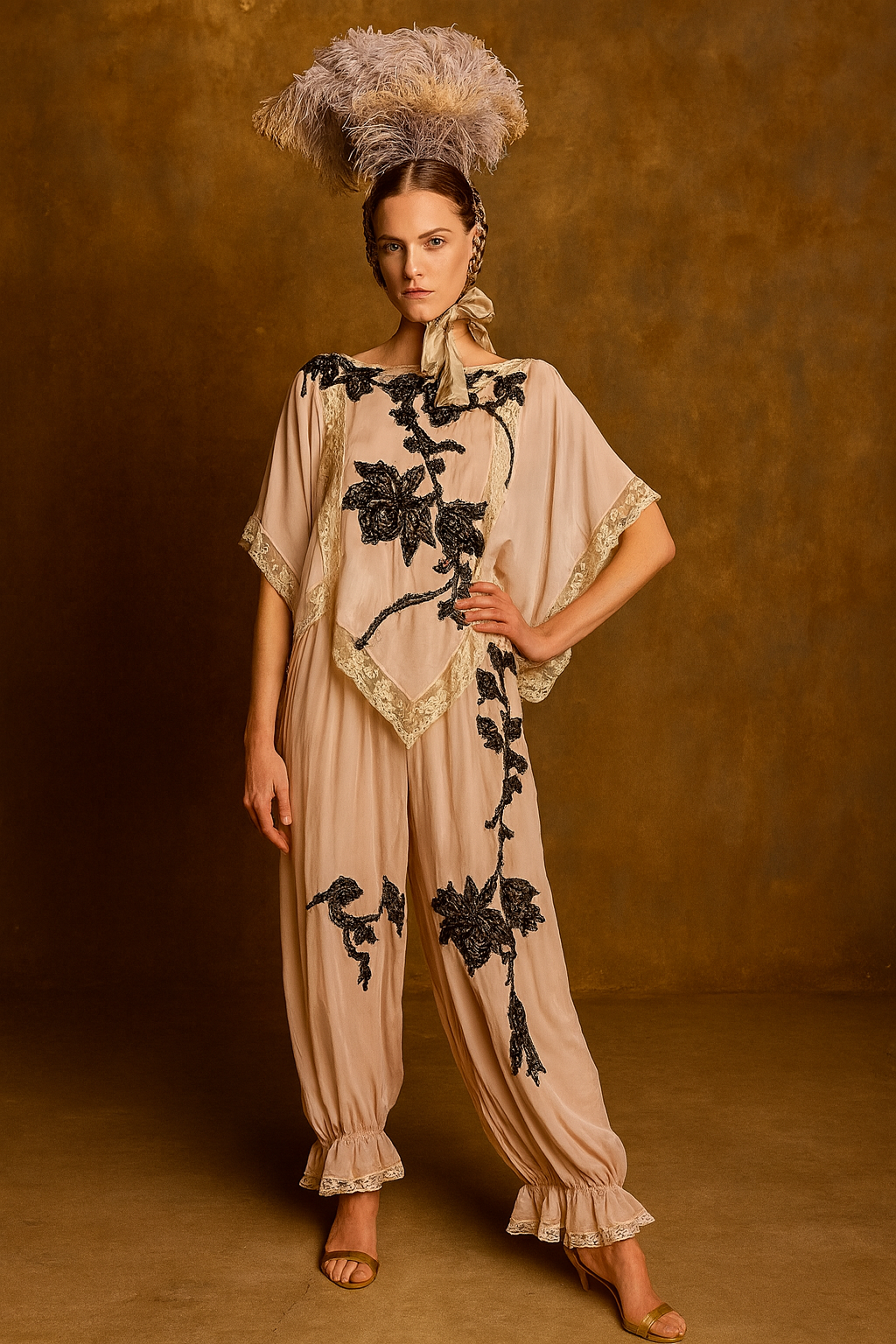 Experience the elegance and luxury of the 1930s with this chic 30s silk and lace lounge set. This rare and collectible set includes an angel sleeve blouse with delicate pink silk and cream lace inserts, adorned with a floral black lace motif across the neckline and body. Paired with matching silk bloomers featuring elasticated waist and ankle lace trimmed design, and matching black lace inserts, this loungewear set exudes timeless sophistication.