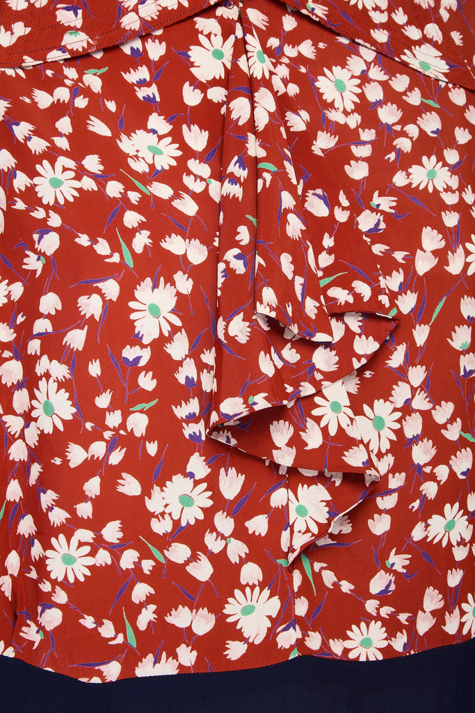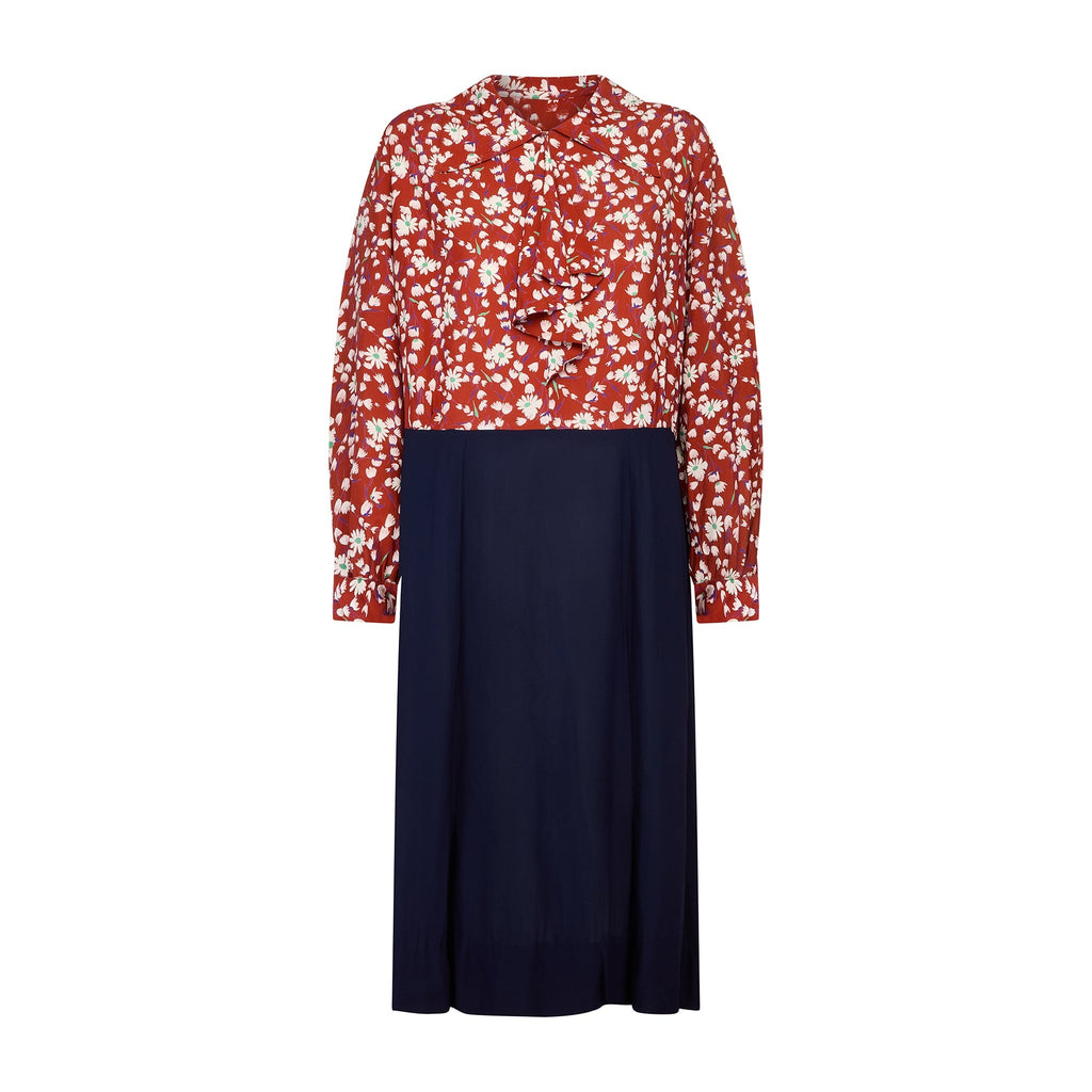 It is unusual to come across an original vintage rayon and crepe dress from the 1940s in a rare, larger size and we believe this will fit up to a modern size UK 20 or US 16. Composed of two different fabrics, it has a smooth rayon top and a navy-blue crepe skirt with a slight waffle texture. The top is tailored from sheer russet brown rayon printed with white flowers with green and purple detailing. The sleeves are cut to a slightly bell-sleeve style with snap closures on the cuffs. The neck has a wide point collar detailed with four rows of brown running stitches. The neckline has an opening that is fastened with a snap closure. A pretty ruffle hangs from the centre of the collar down the front of the dress. The skirt has two soft pleats at the front. The dress is unlined.