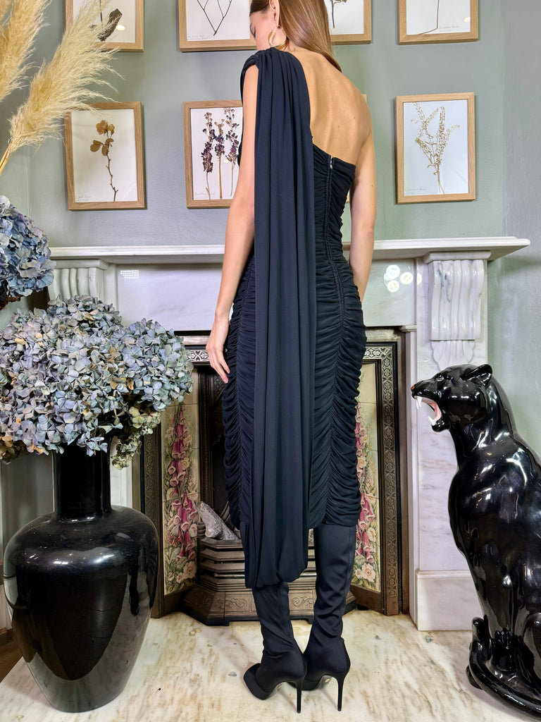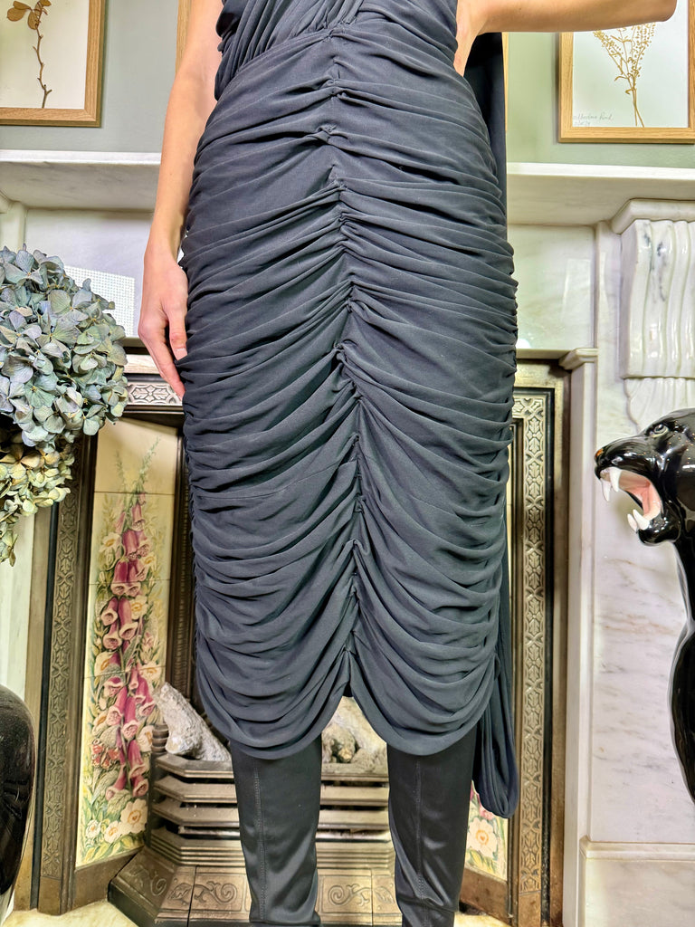 A bombshell of a dress, this is a 40s black draped dress in a soft silk jersey. Has one wide shoulder strap that wraps down the back and joins the hem. Zips on the back and has a flattering draped skirt that hugs the body. Also looks fab belted.