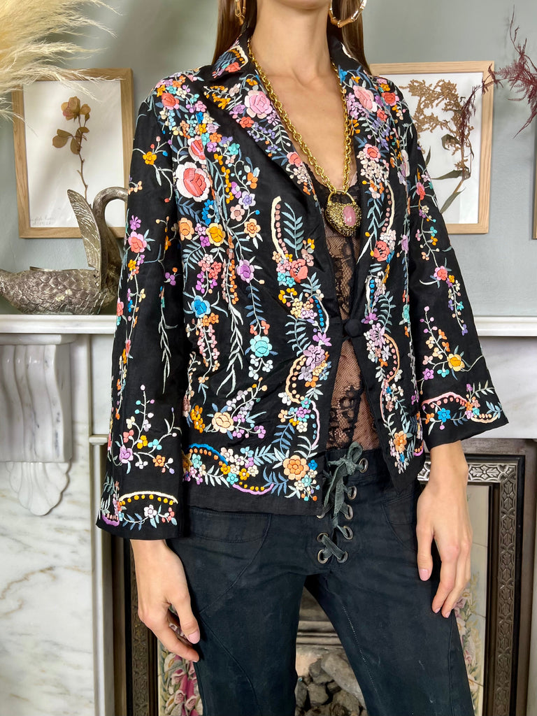 Absolutely gorgeous Chinoiserie jacket from the 40s. Has long sleeves, lapels, a straight fit and a front covered button. The hero is the lush embroidery throughout in vibrant colours. Lined in black.