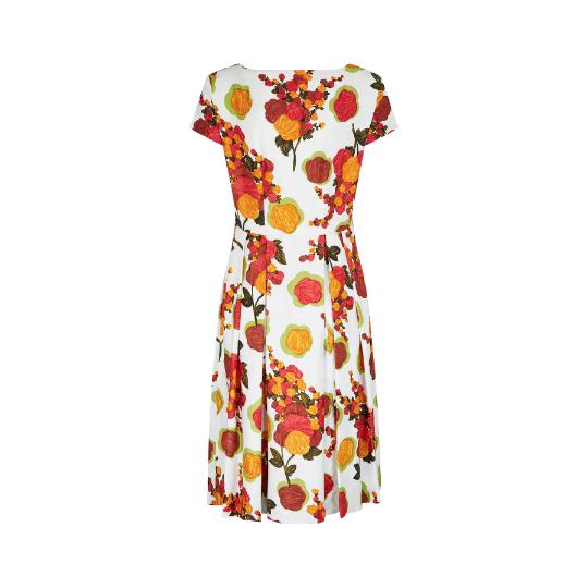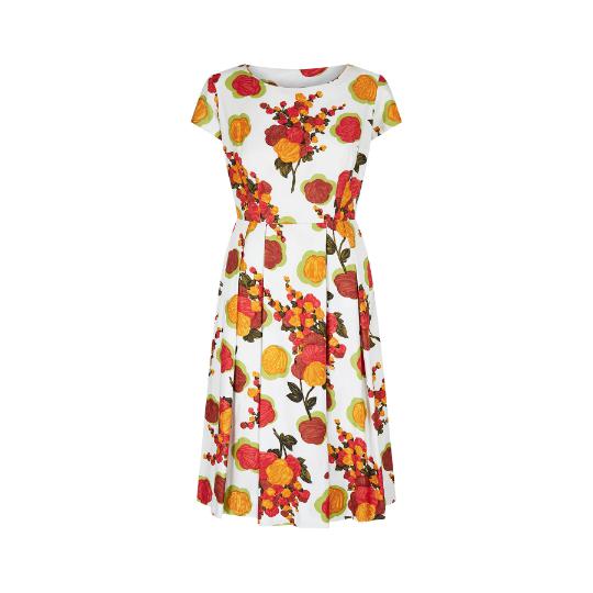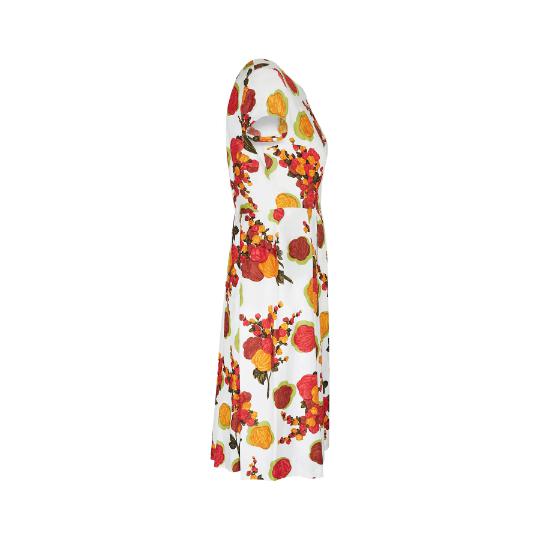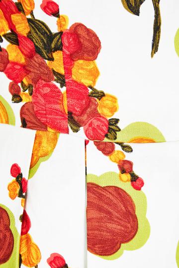 This original late 1950’s to early 1960s cotton dress features a painterly composition of single abstract flowers with green halo backgrounds and a larger composition floral spray in bold colours of green, red and orange making for a really striking print.